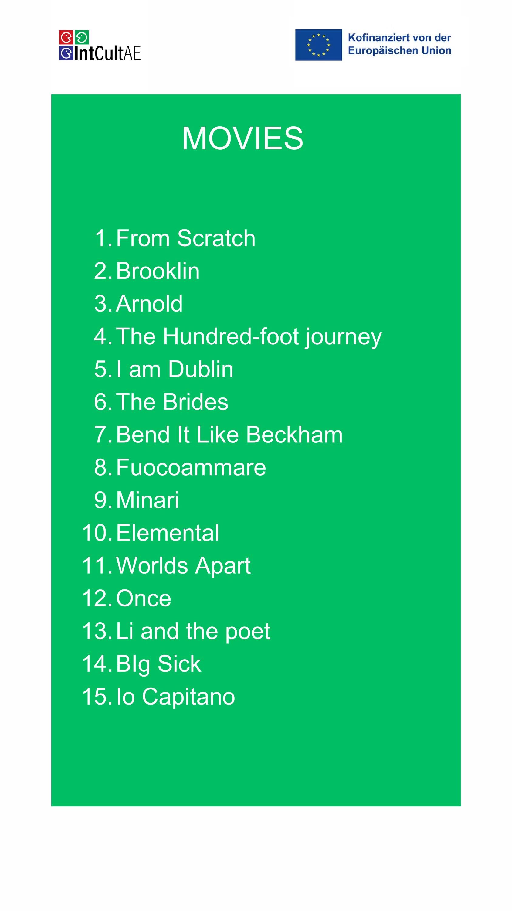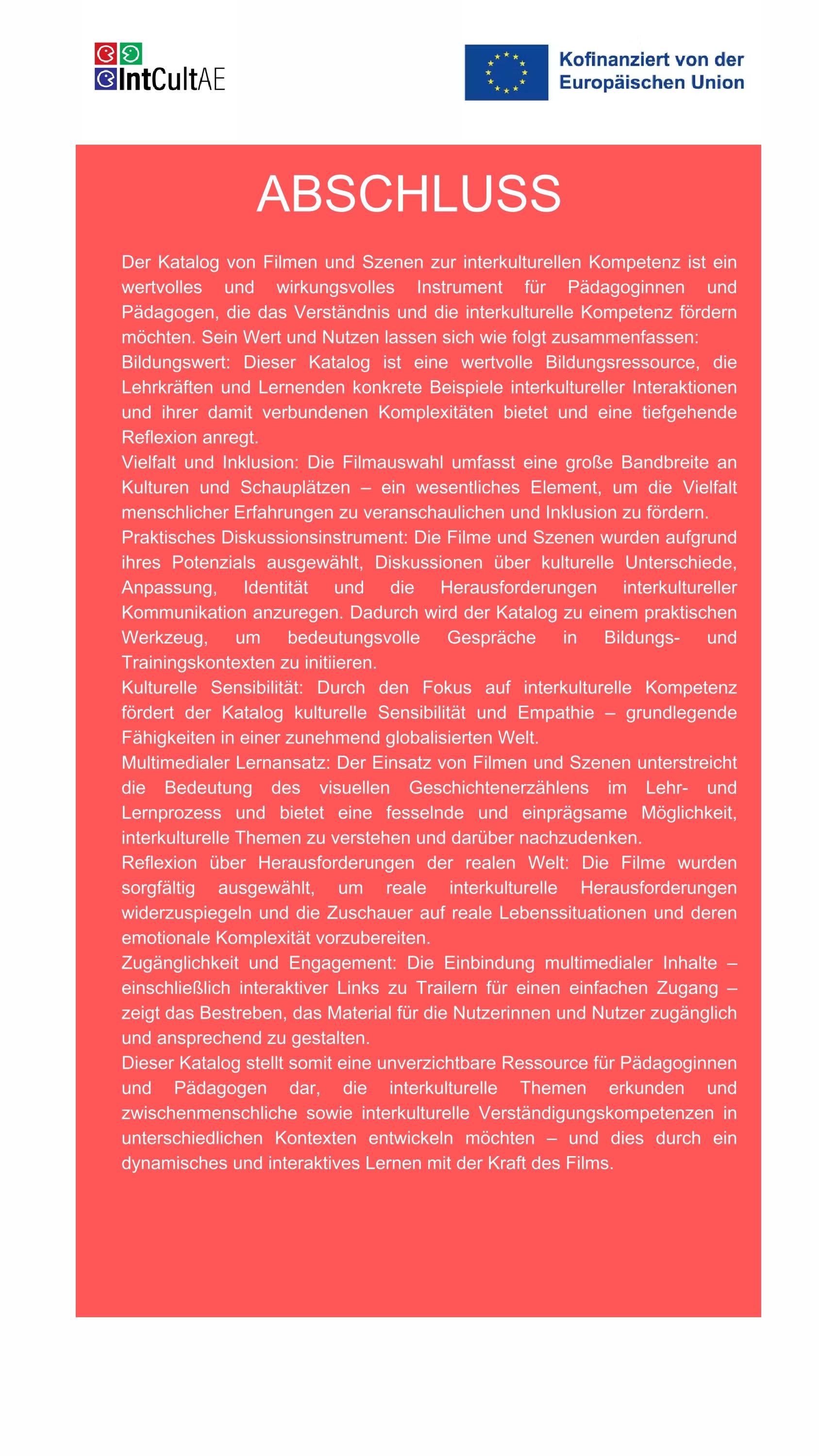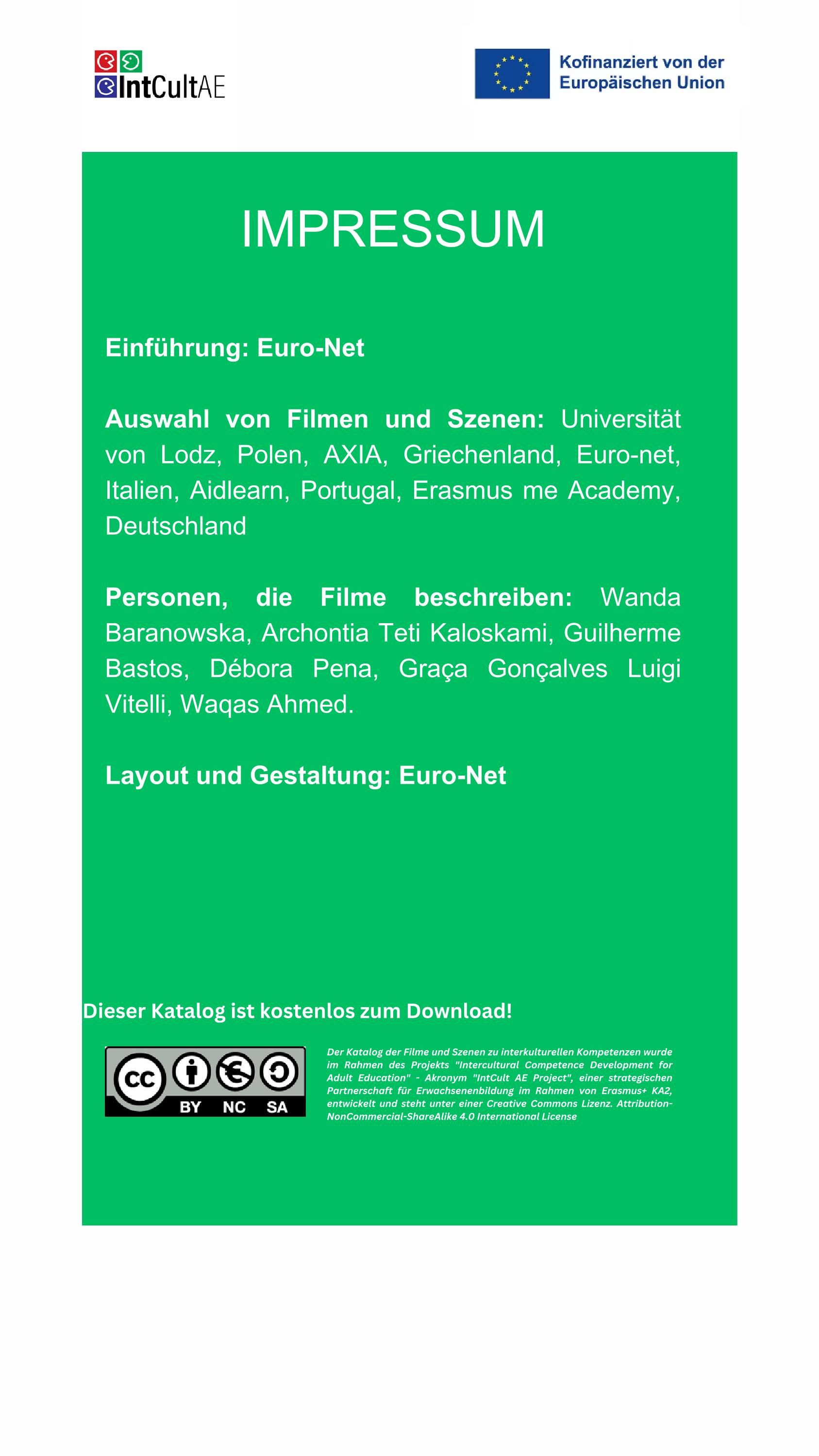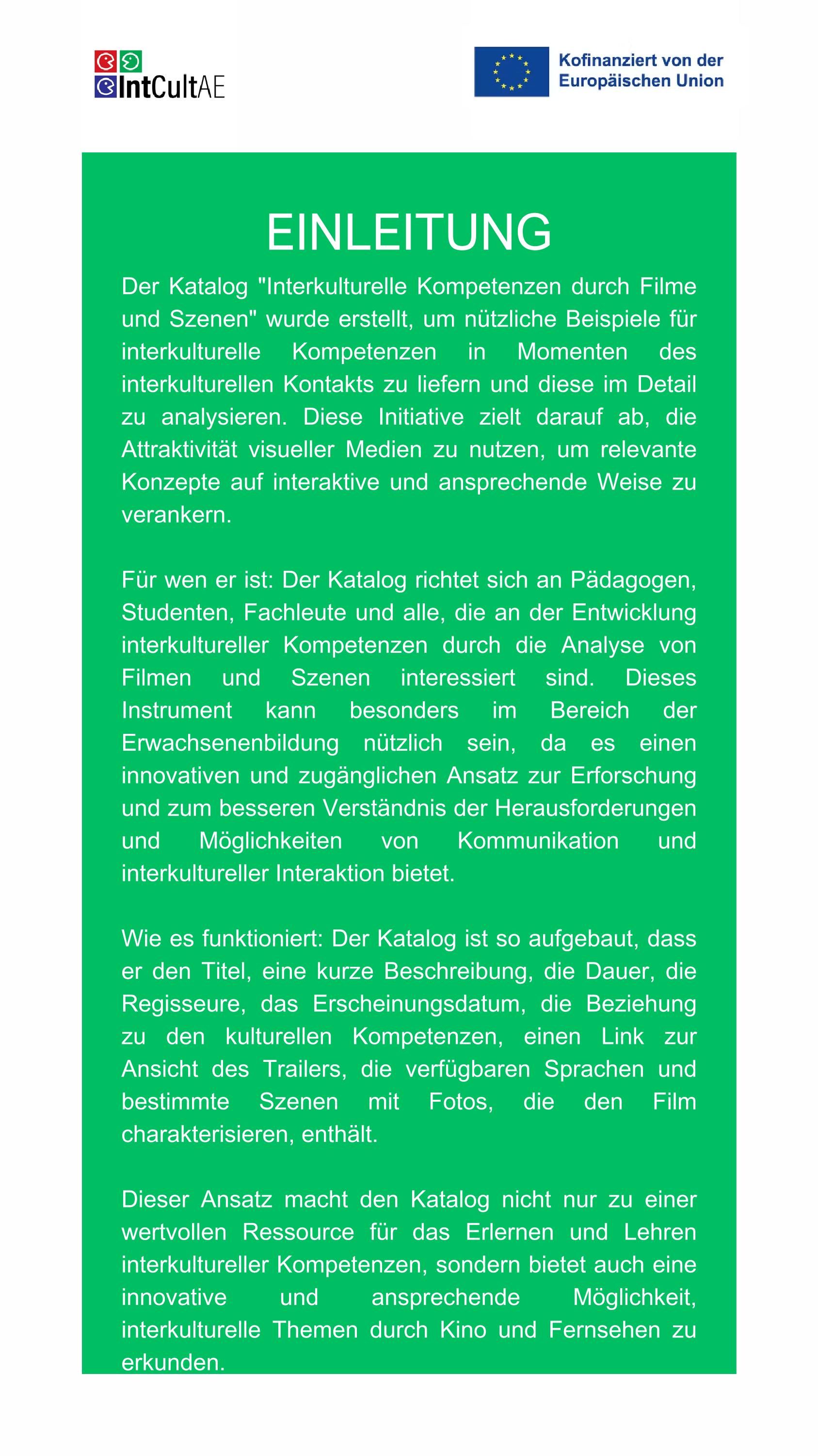 Der Katalog „Interkulturelle Kompetenzen durch Filme und Szenen“ wurde erstellt, um nützliche Beispiele für interkulturelle Kompetenzen in Aktion während interkultureller Kontakte zu liefern und diese im Detail zu analysieren. Ziel dieser Initiative ist es, die Anziehungskraft visueller Medien zu nutzen, um relevante Konzepte auf interaktive und ansprechende Weise zu verankern. Er umfasst 15 Filme (oder Serien in Episoden) und 15 Szenen, die ausgewählt wurden, um verschiedene Aspekte interkultureller Kompetenzen zu veranschaulichen.