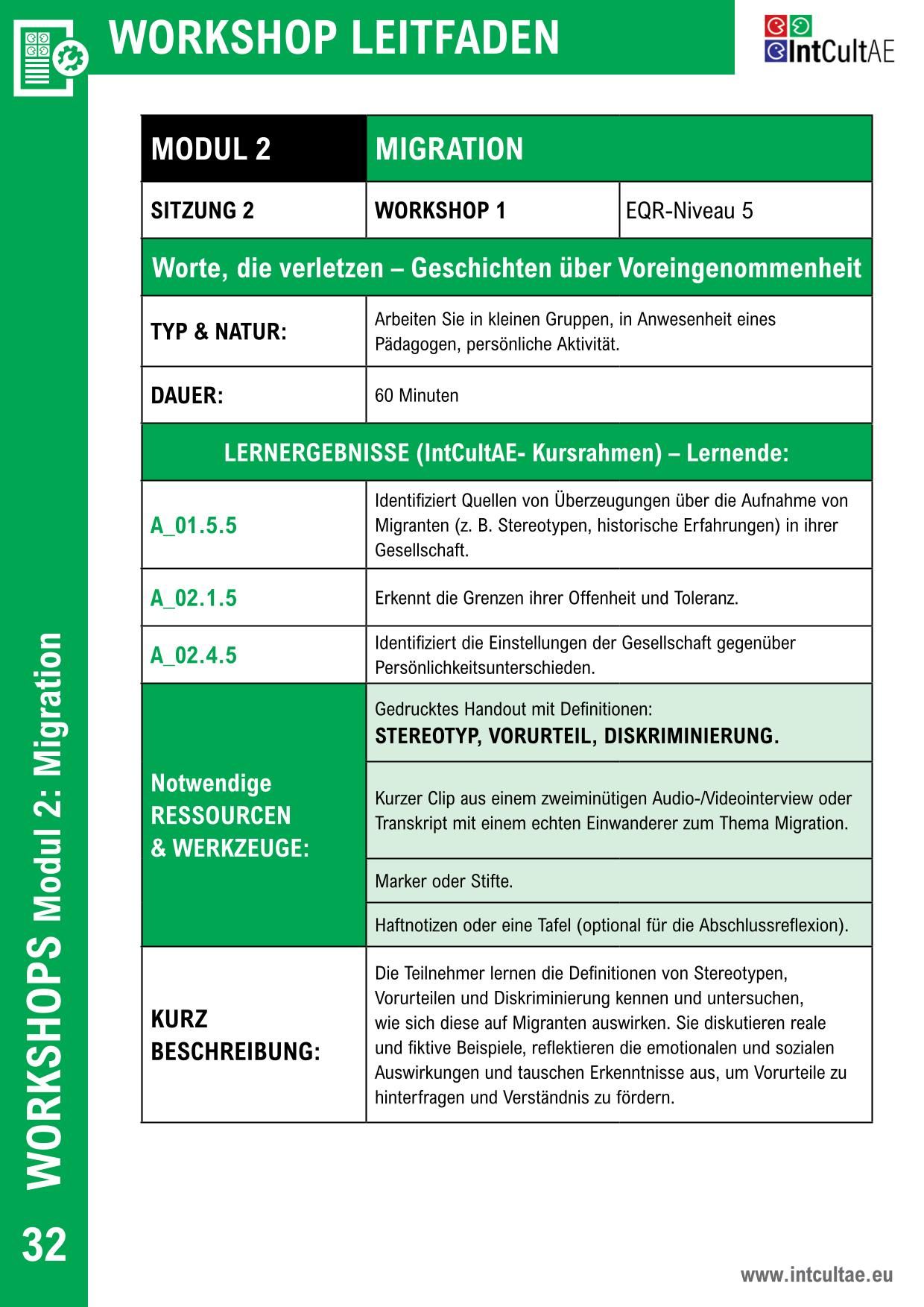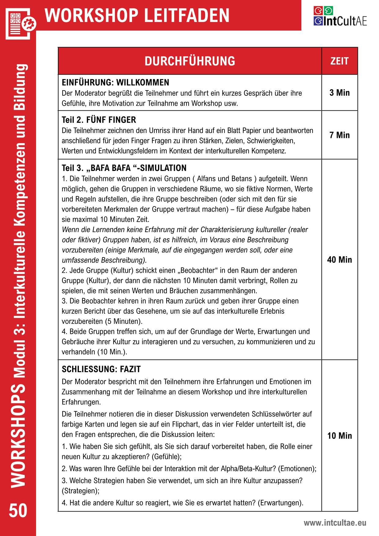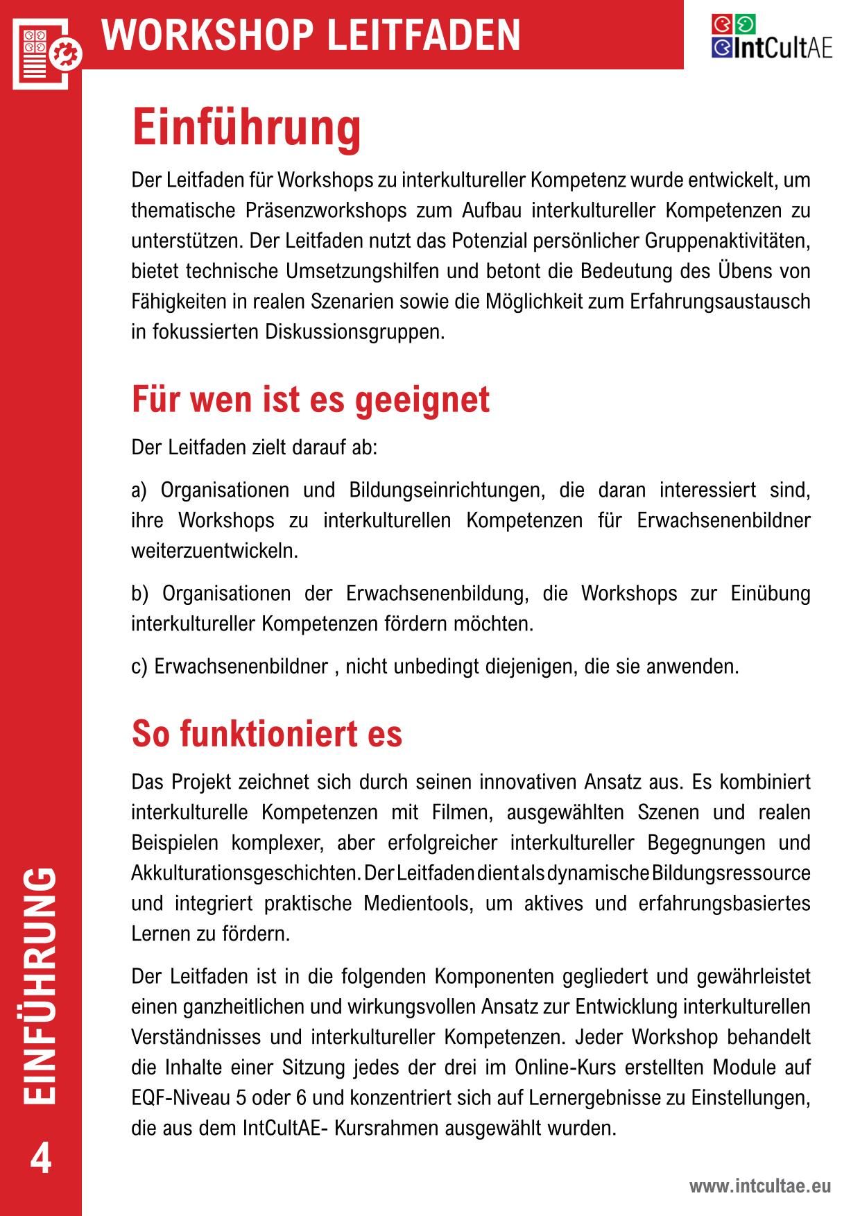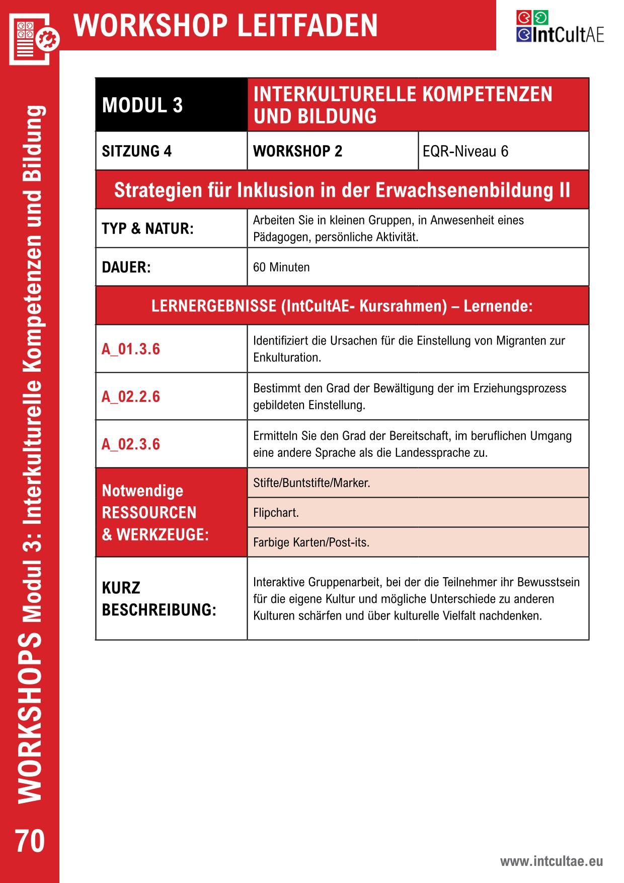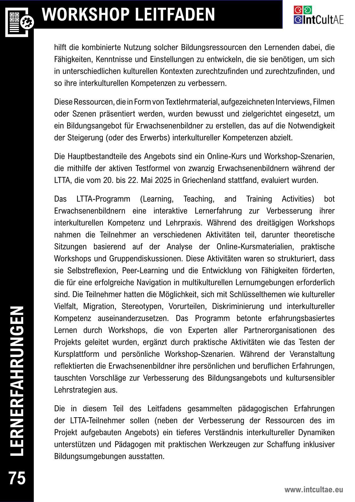 Es richtet sich an Organisationen und Bildungseinrichtungen, die daran interessiert sind, ihre Workshops zu interkulturellen Kompetenzen für Erwachsenenbildner weiterzuentwickeln. Ziel ist es, das Potenzial von Gruppenaktivitäten von Angesicht zu Angesicht auszuschöpfen. Es enthält Hinweise zur technischen Umsetzung und schätzt die Möglichkeit, Fähigkeiten in realen Szenarien zu üben und Erfahrungen in Fokusgruppen zu diskutieren.