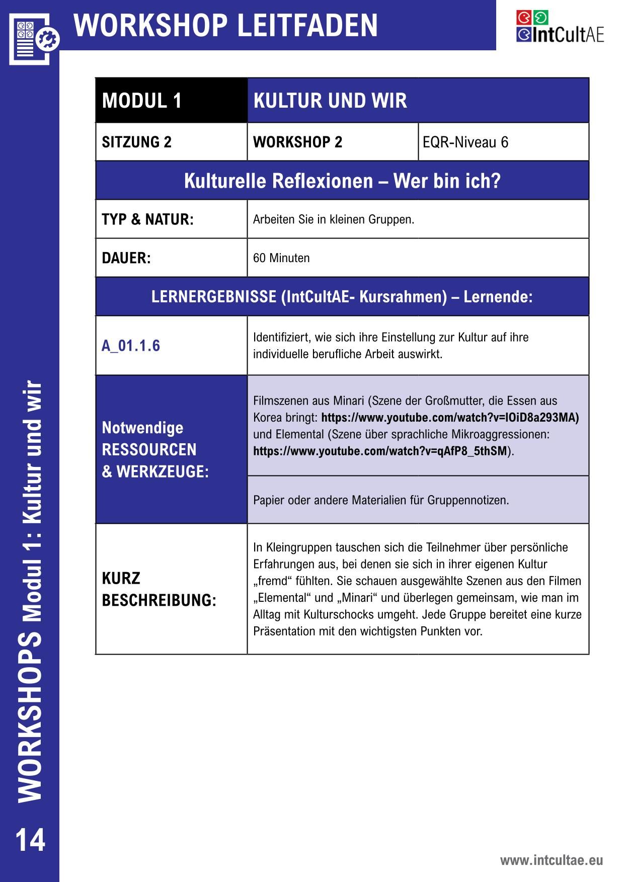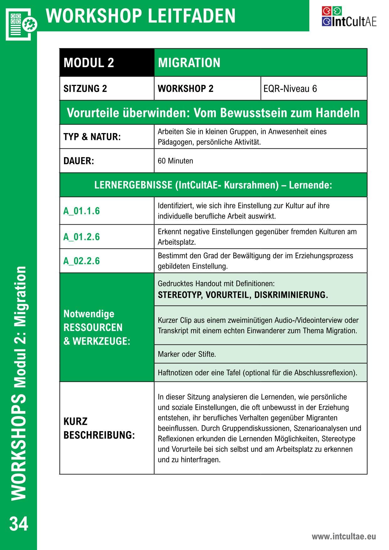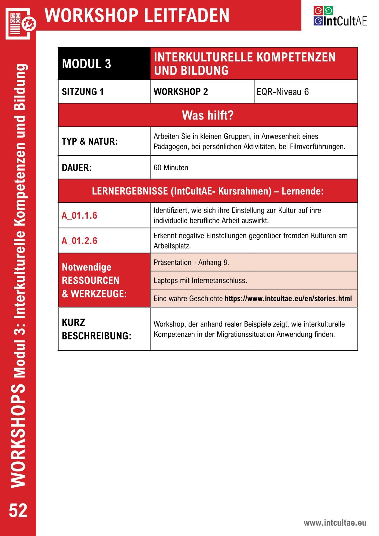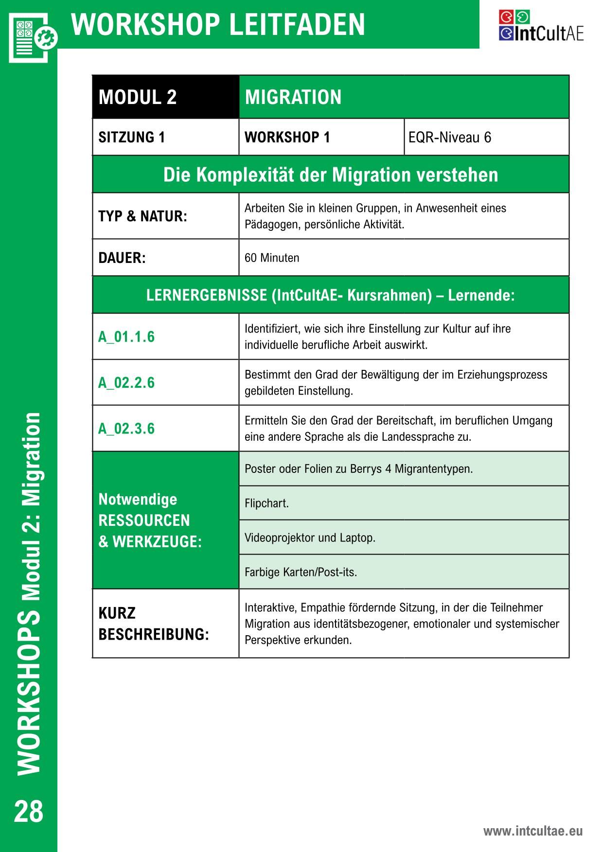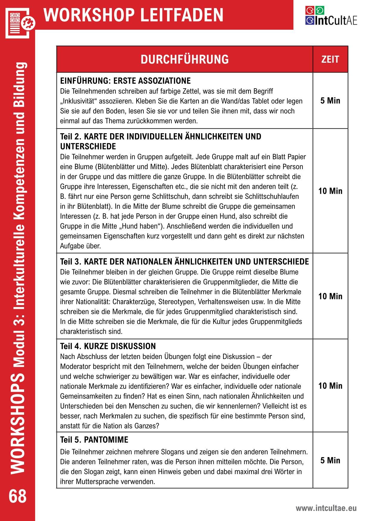 Es richtet sich an Organisationen und Bildungseinrichtungen, die daran interessiert sind, ihre Workshops zu interkulturellen Kompetenzen für Erwachsenenbildner weiterzuentwickeln. Ziel ist es, das Potenzial von Gruppenaktivitäten von Angesicht zu Angesicht auszuschöpfen. Es enthält Hinweise zur technischen Umsetzung und schätzt die Möglichkeit, Fähigkeiten in realen Szenarien zu üben und Erfahrungen in Fokusgruppen zu diskutieren.