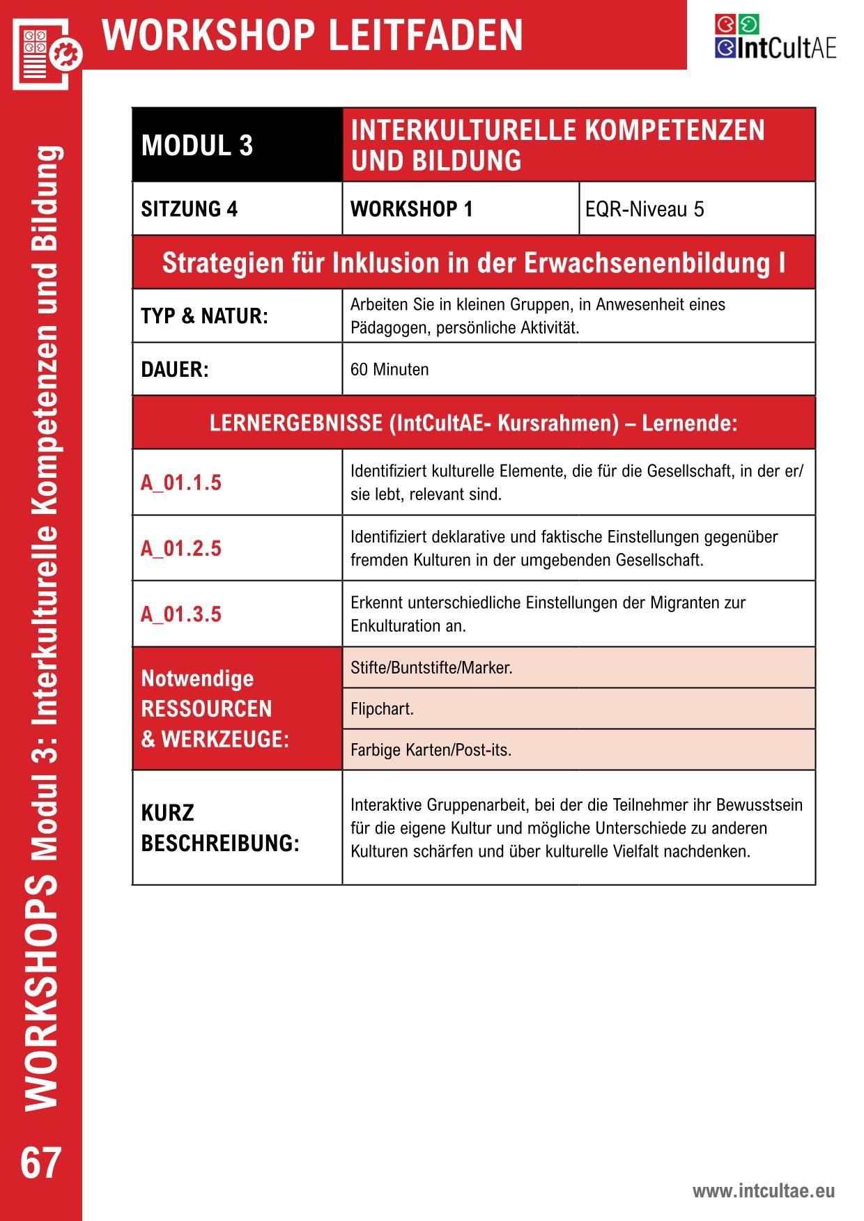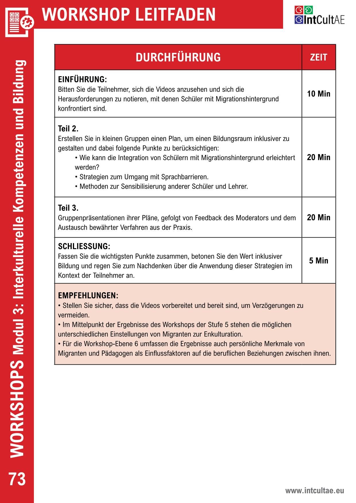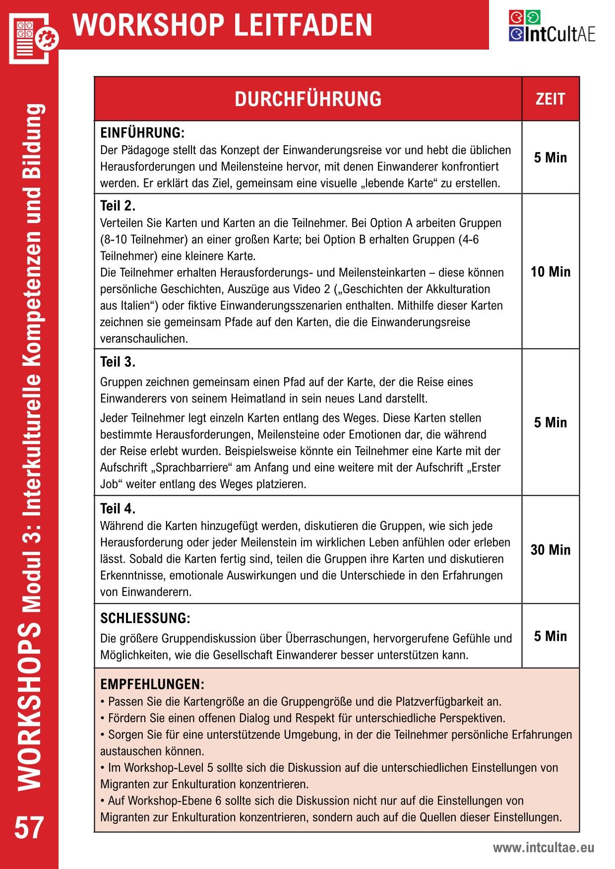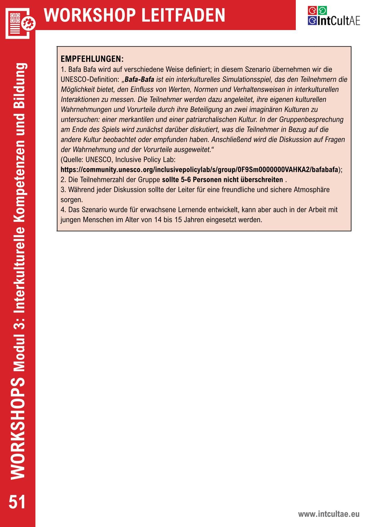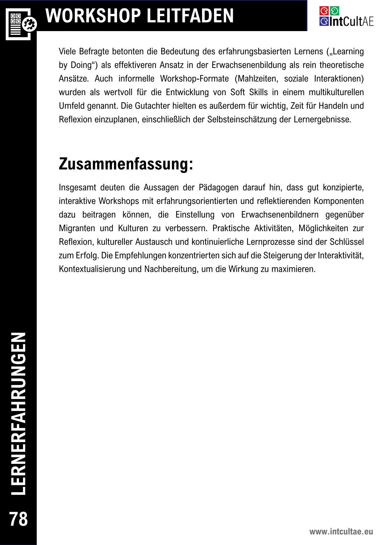 Es richtet sich an Organisationen und Bildungseinrichtungen, die daran interessiert sind, ihre Workshops zu interkulturellen Kompetenzen für Erwachsenenbildner weiterzuentwickeln. Ziel ist es, das Potenzial von Gruppenaktivitäten von Angesicht zu Angesicht auszuschöpfen. Es enthält Hinweise zur technischen Umsetzung und schätzt die Möglichkeit, Fähigkeiten in realen Szenarien zu üben und Erfahrungen in Fokusgruppen zu diskutieren.