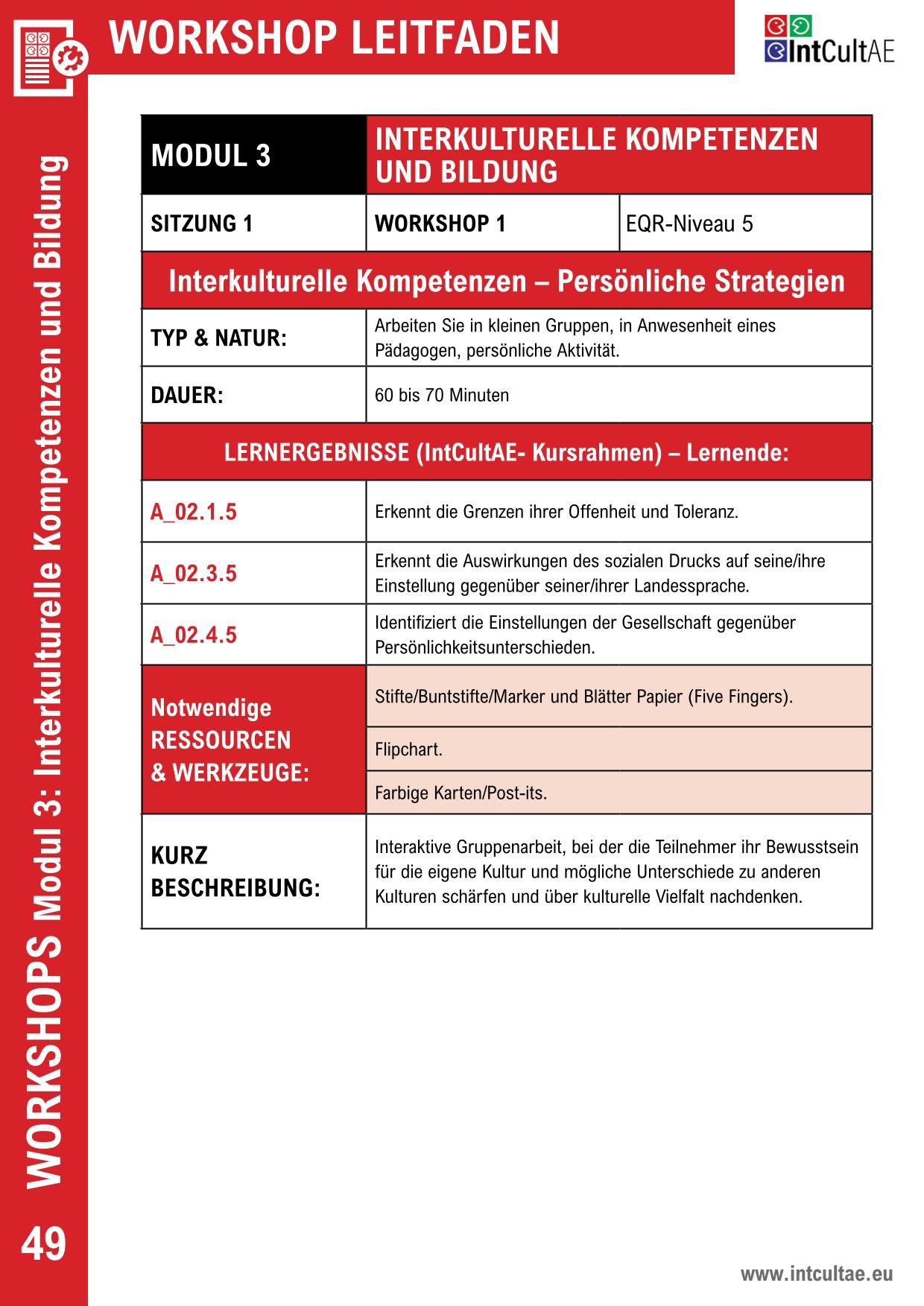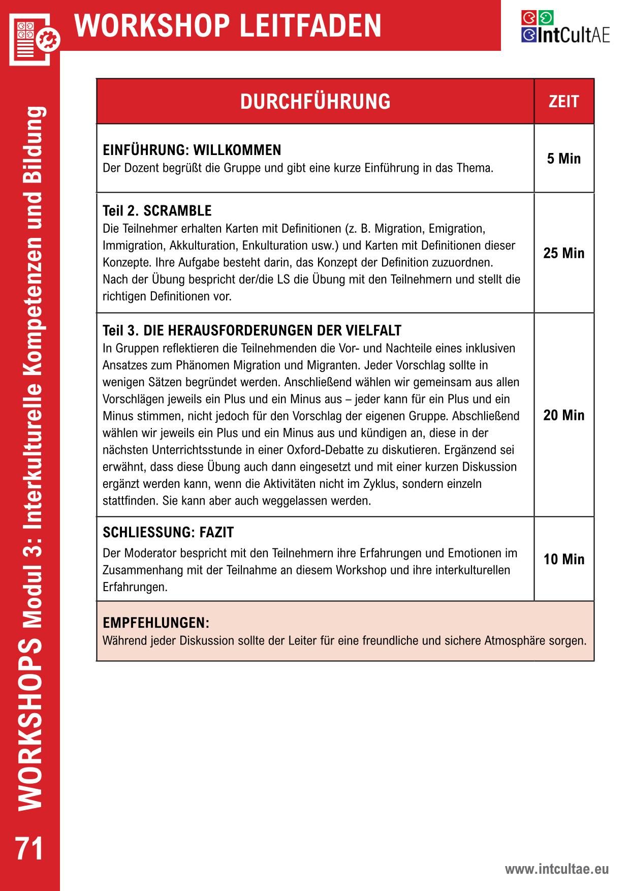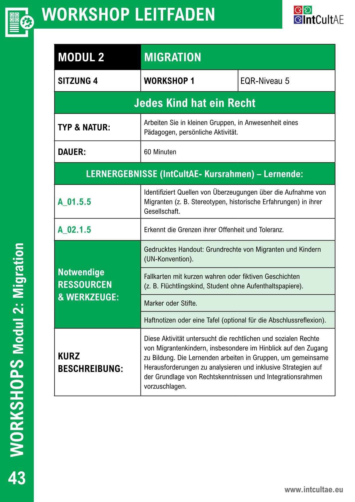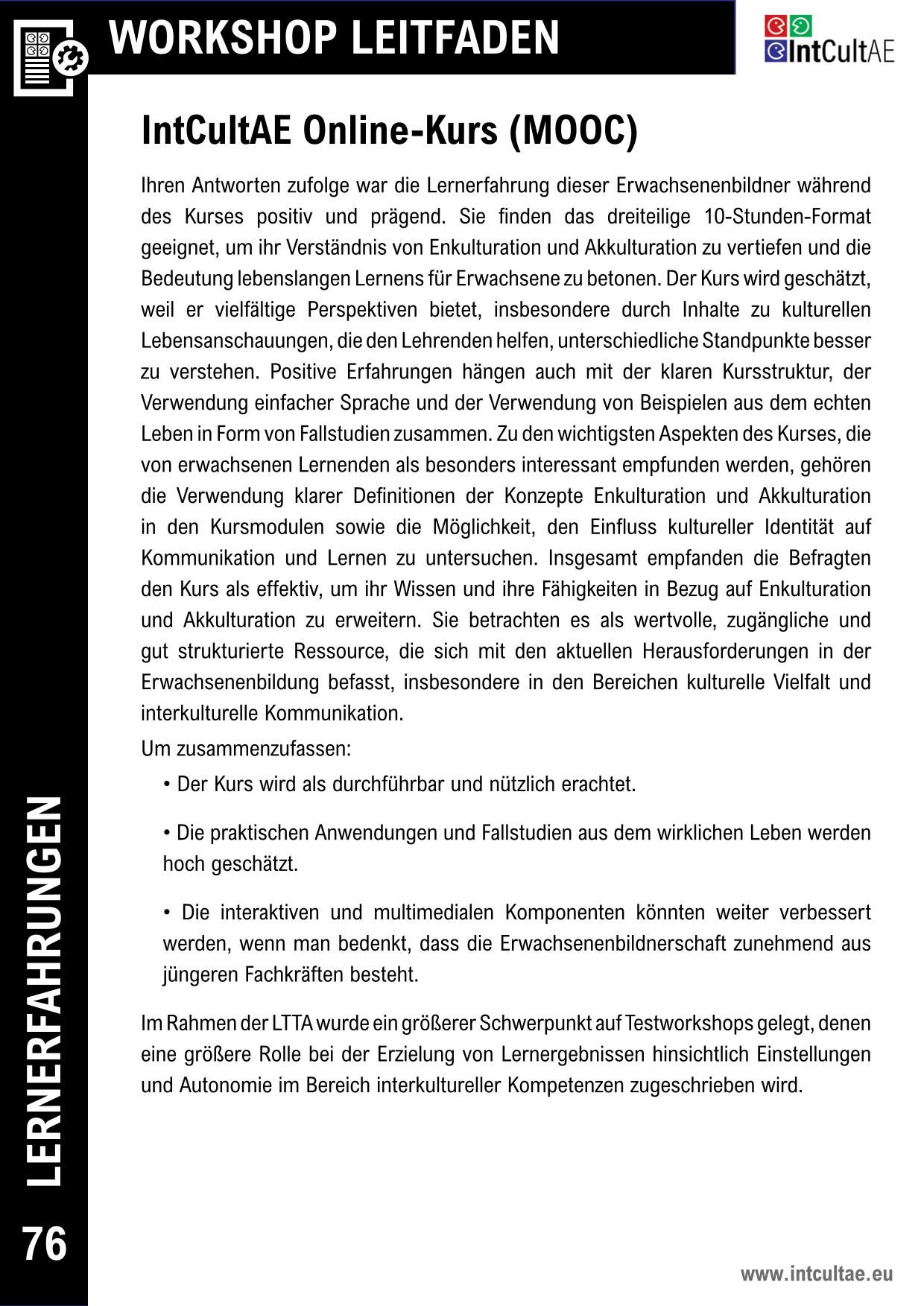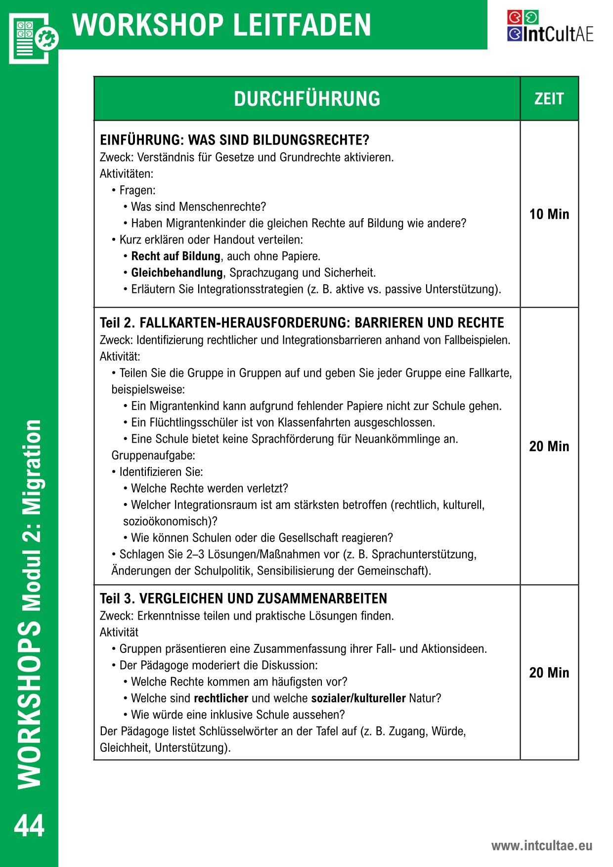 Es richtet sich an Organisationen und Bildungseinrichtungen, die daran interessiert sind, ihre Workshops zu interkulturellen Kompetenzen für Erwachsenenbildner weiterzuentwickeln. Ziel ist es, das Potenzial von Gruppenaktivitäten von Angesicht zu Angesicht auszuschöpfen. Es enthält Hinweise zur technischen Umsetzung und schätzt die Möglichkeit, Fähigkeiten in realen Szenarien zu üben und Erfahrungen in Fokusgruppen zu diskutieren.