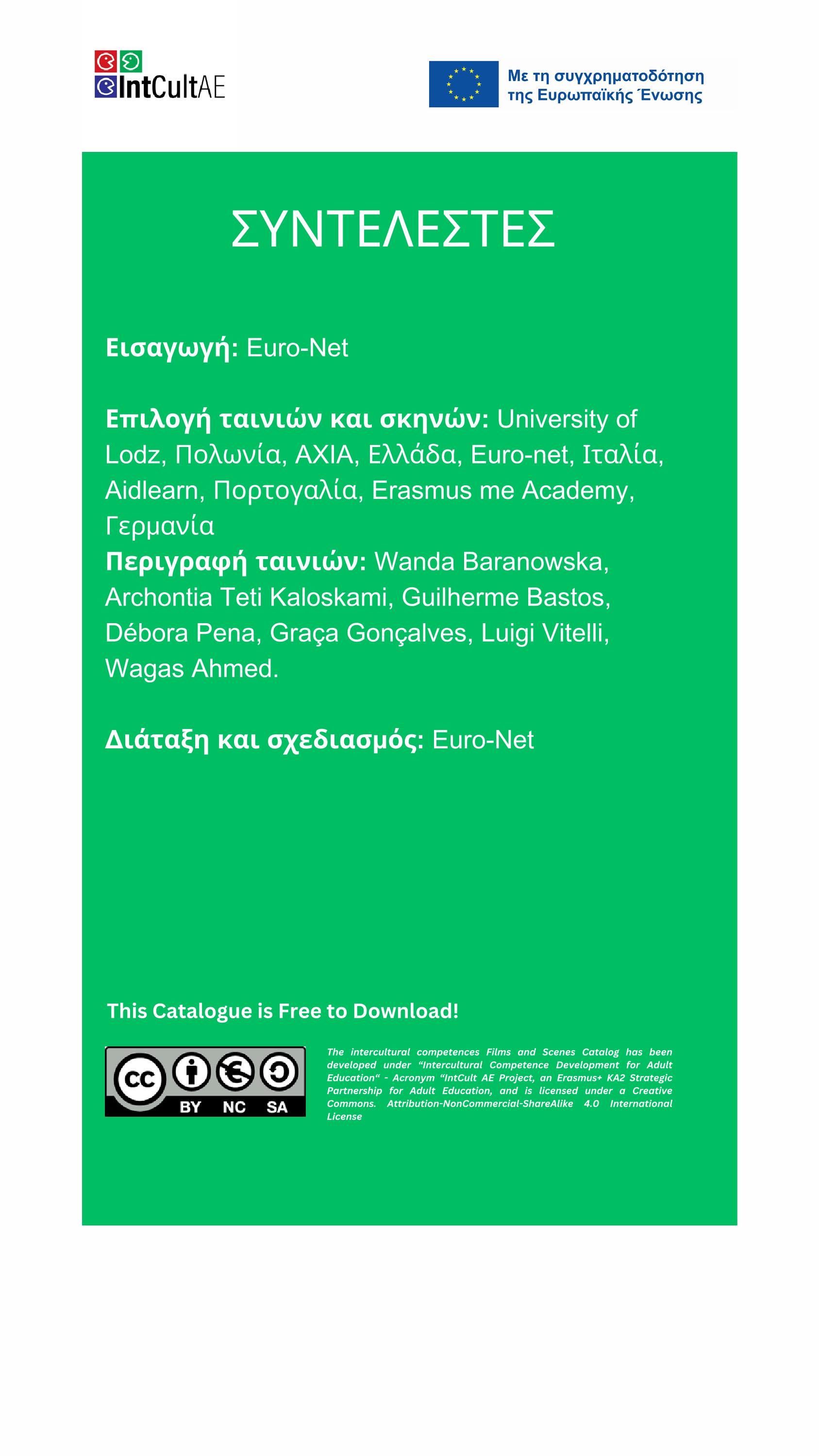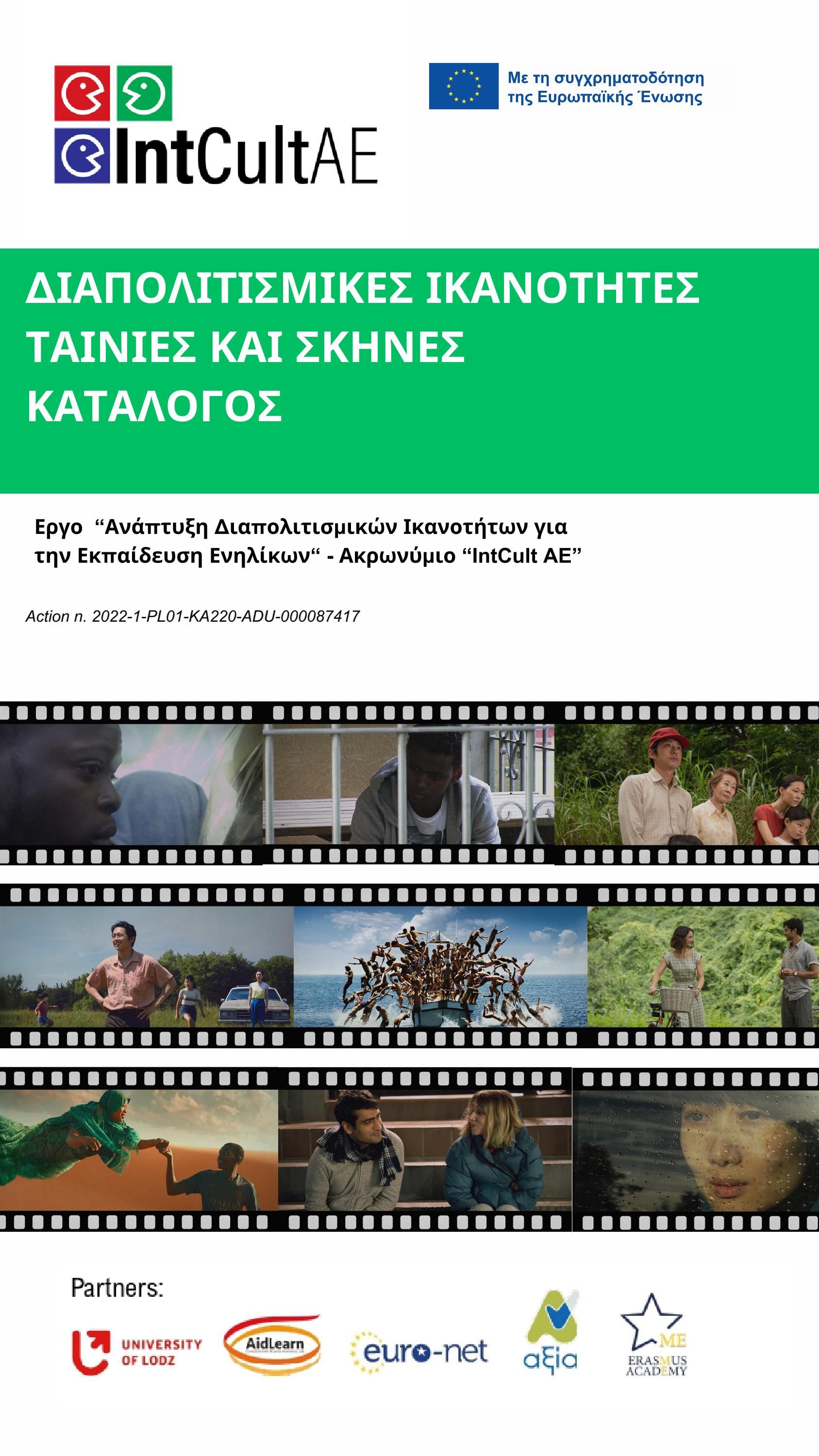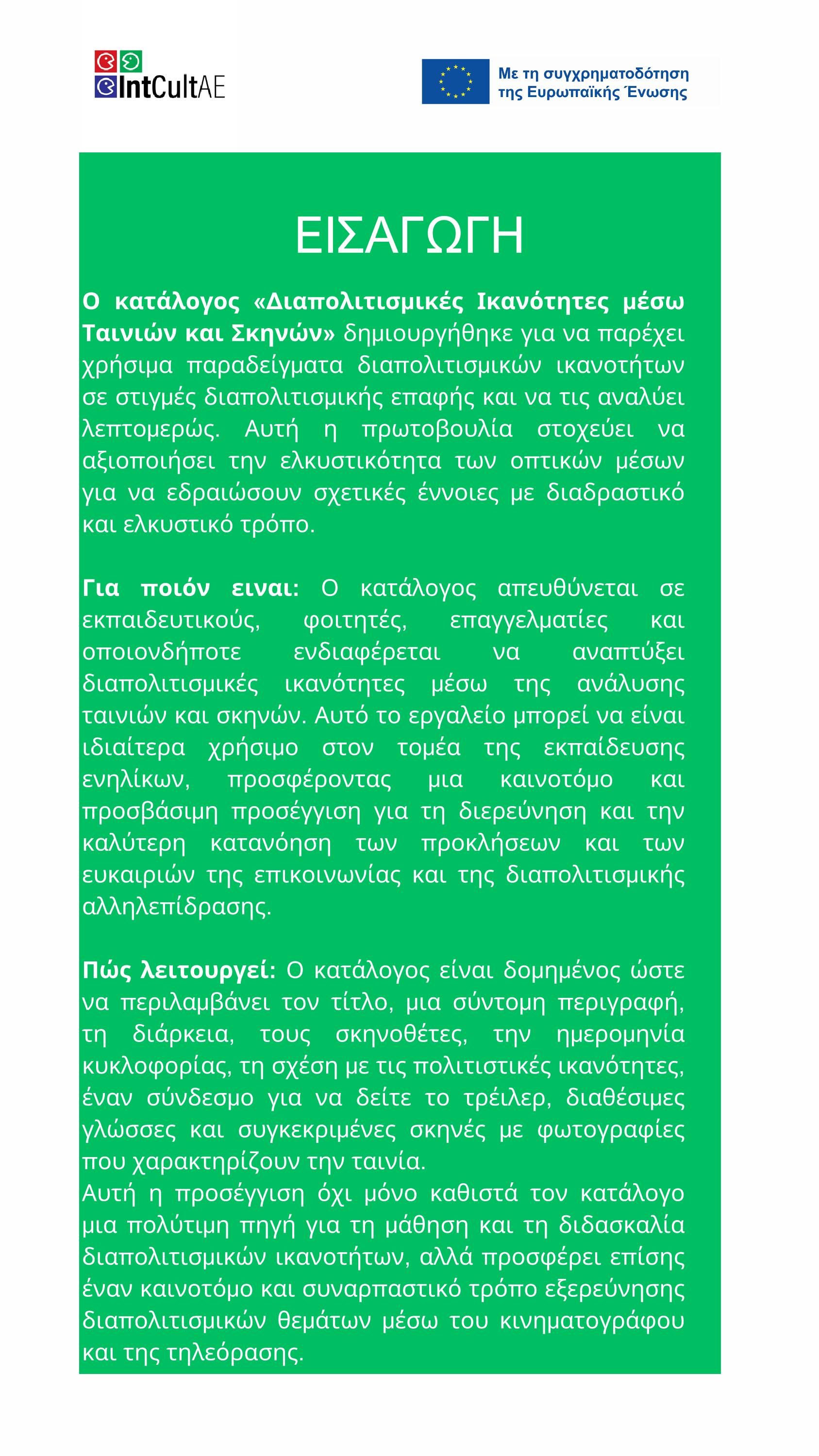 Ο κατάλογος "Διαπολιτισμικές Δεξιότητες Μέσα από Ταινίες και Σκηνές" δημιουργήθηκε για να παρέχει χρήσιμα παραδείγματα διαπολιτισμικών δεξιοτήτων σε δράση κατά τη διάρκεια διαπολιτισμικής επαφής και να τα αναλύει λεπτομερώς. Αυτή η πρωτοβουλία στοχεύει να αξιοποιήσει την έλξη των οπτικών μέσων για να εδραιώσει σχετικές έννοιες με έναν διαδραστικό και συναρπαστικό τρόπο. Περιλαμβάνει 15 ταινίες (ή σειρές σε επεισόδια) και 15 σκηνές που επιλέχθηκαν για να απεικονίσουν διάφορες πτυχές των διαπολιτισμικών δεξιοτήτων.