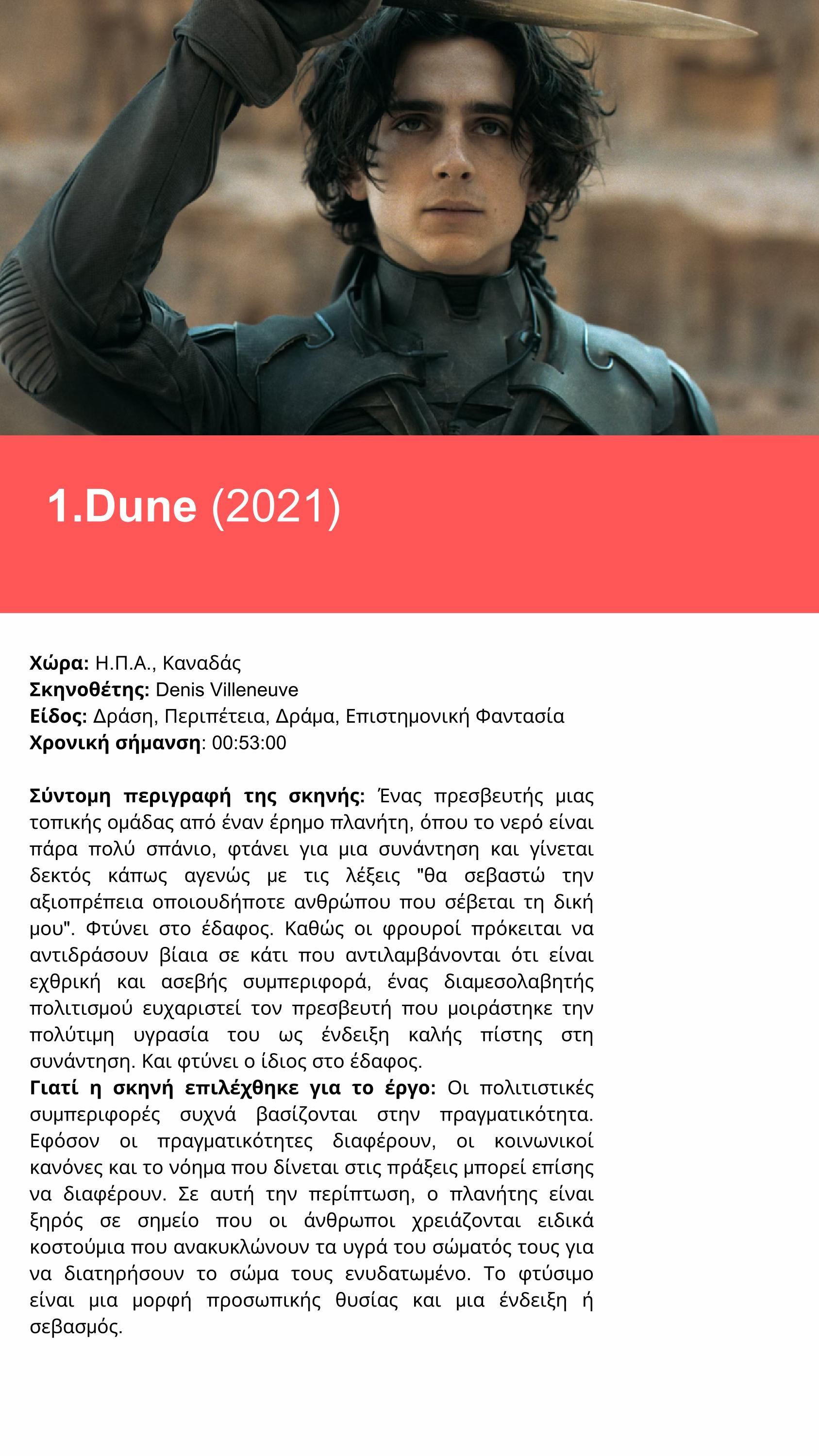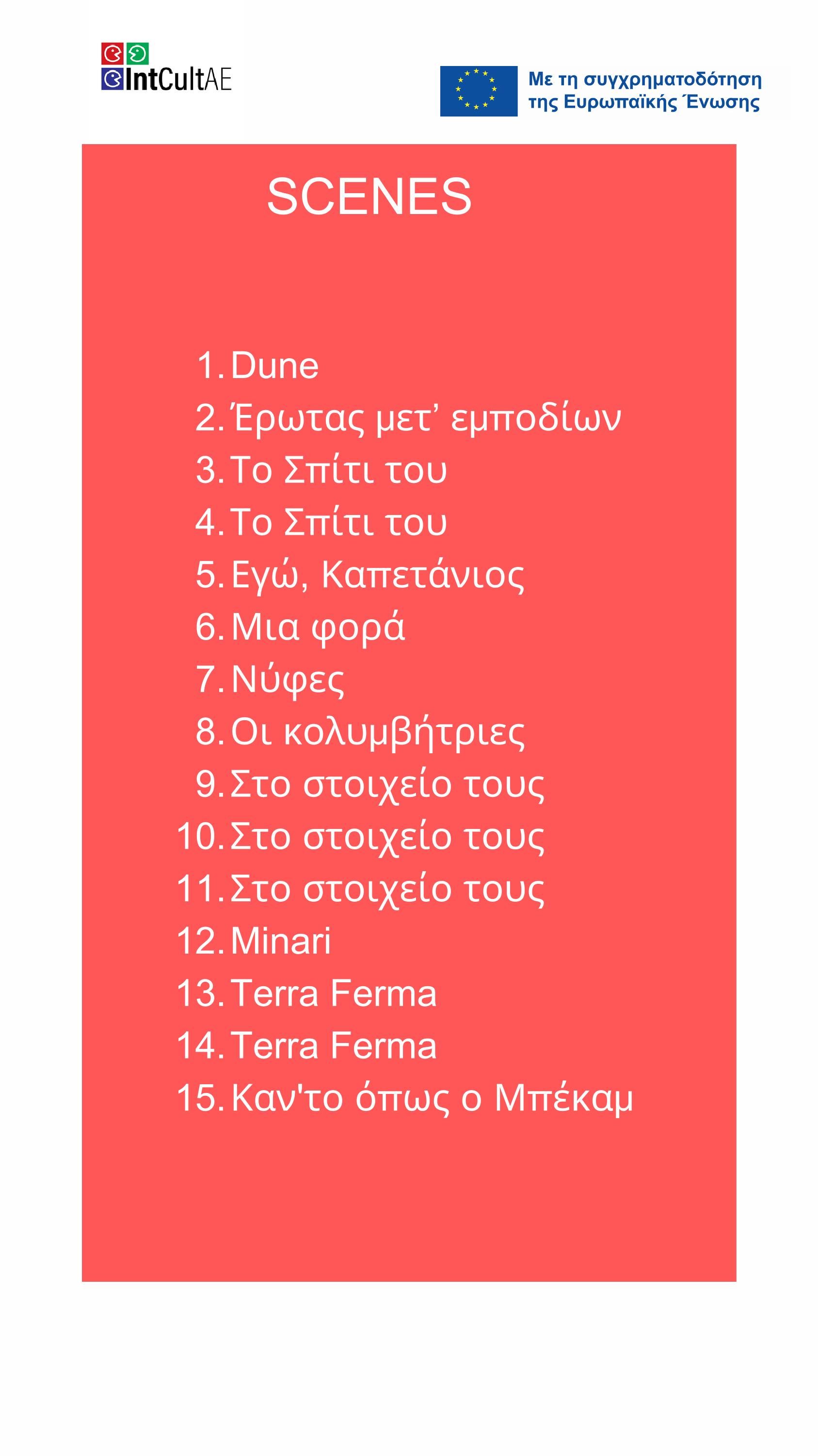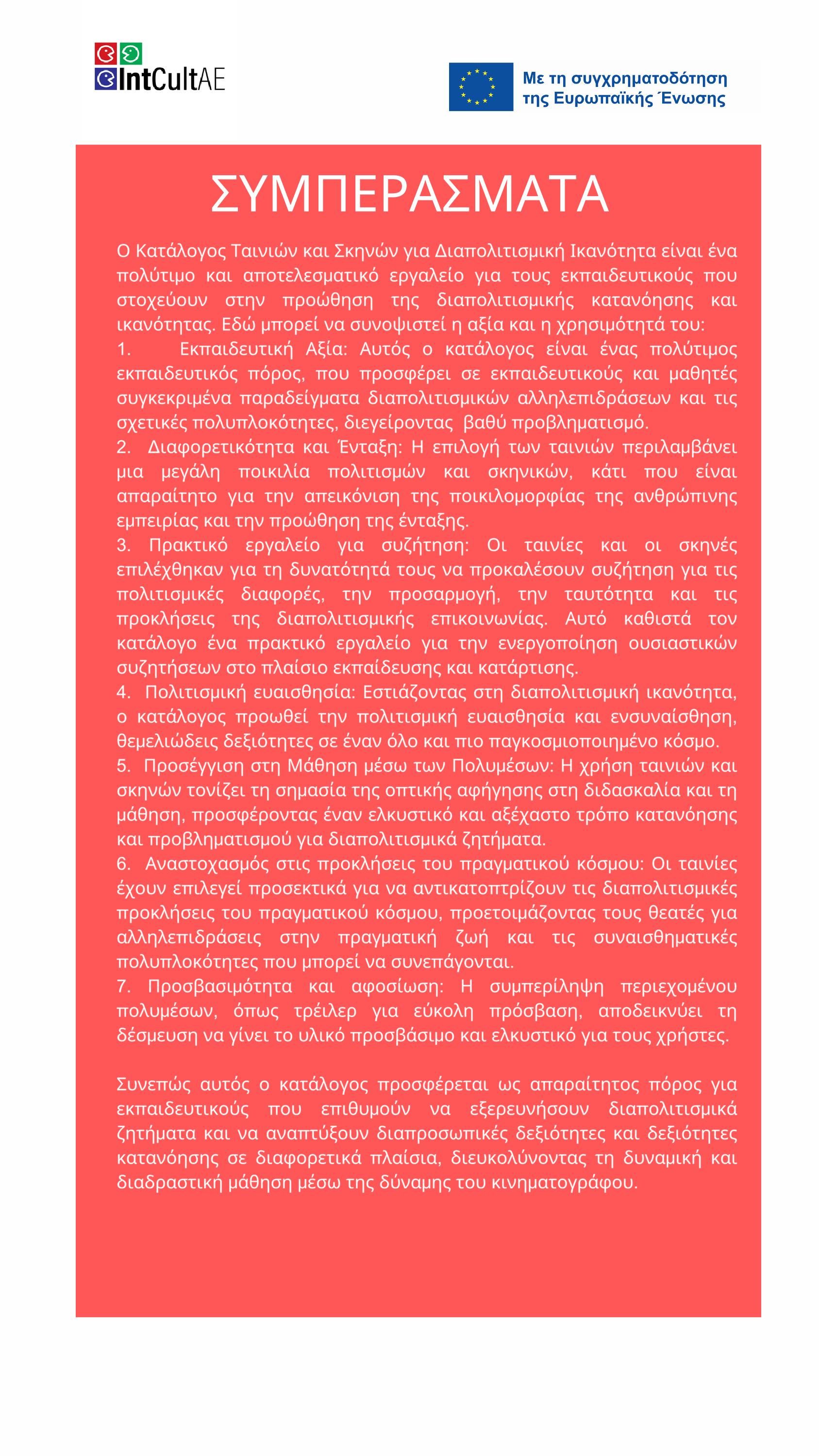 Ο κατάλογος "Διαπολιτισμικές Δεξιότητες Μέσα από Ταινίες και Σκηνές" δημιουργήθηκε για να παρέχει χρήσιμα παραδείγματα διαπολιτισμικών δεξιοτήτων σε δράση κατά τη διάρκεια διαπολιτισμικής επαφής και να τα αναλύει λεπτομερώς. Αυτή η πρωτοβουλία στοχεύει να αξιοποιήσει την έλξη των οπτικών μέσων για να εδραιώσει σχετικές έννοιες με έναν διαδραστικό και συναρπαστικό τρόπο. Περιλαμβάνει 15 ταινίες (ή σειρές σε επεισόδια) και 15 σκηνές που επιλέχθηκαν για να απεικονίσουν διάφορες πτυχές των διαπολιτισμικών δεξιοτήτων.