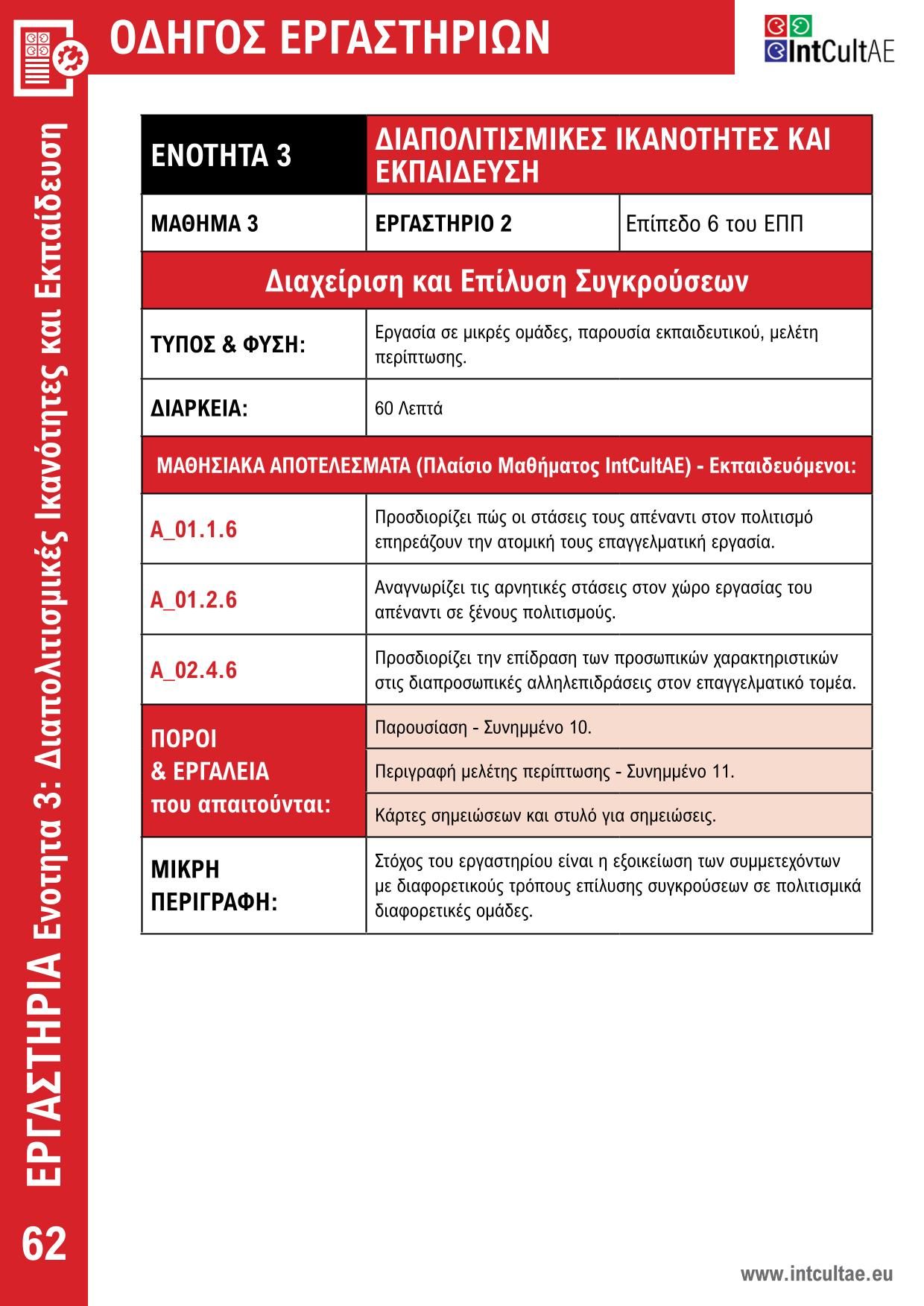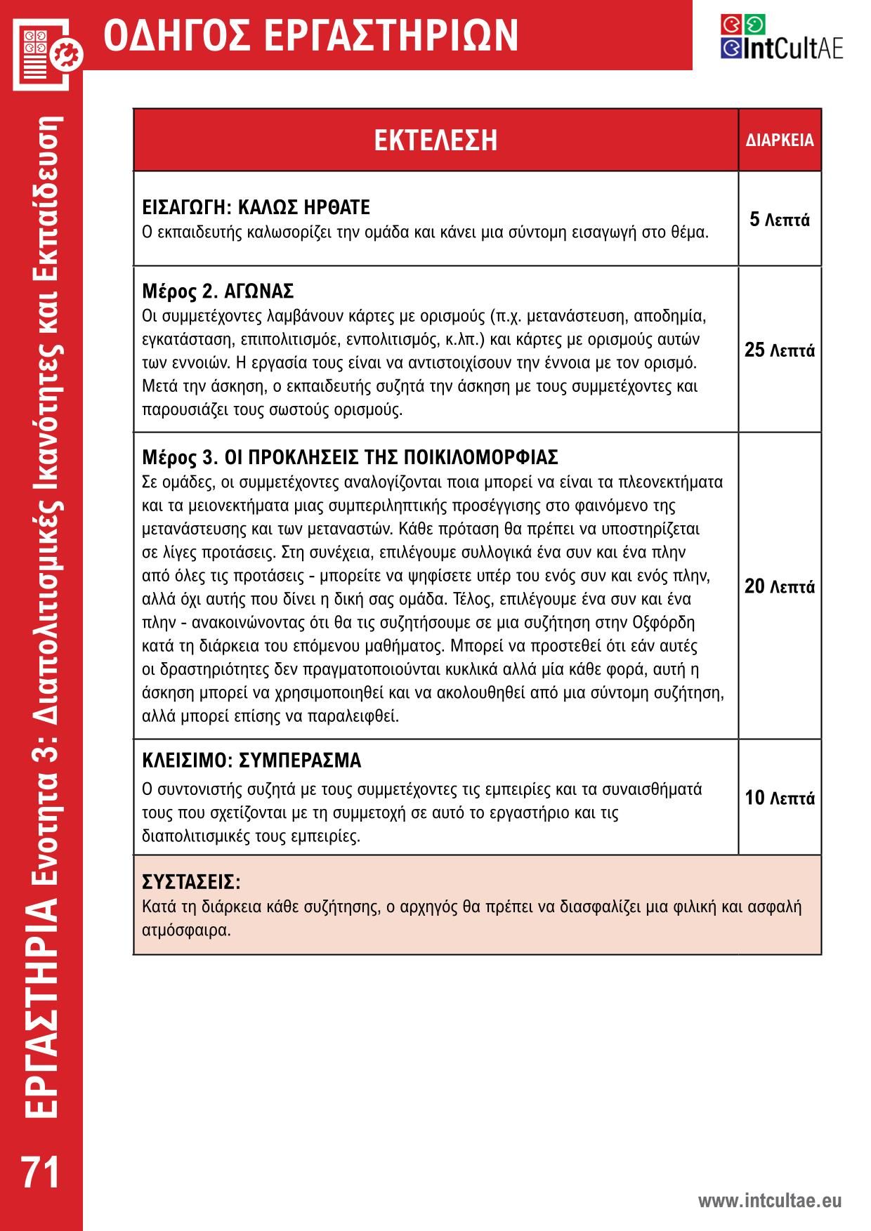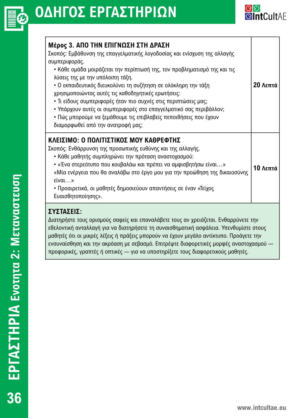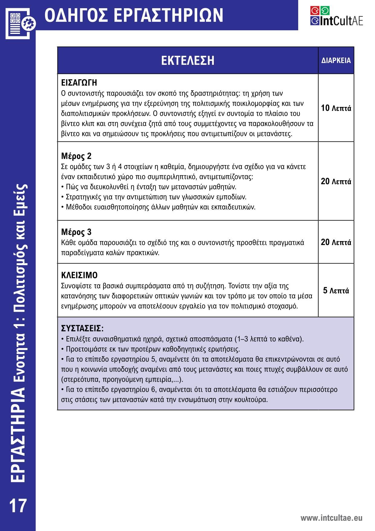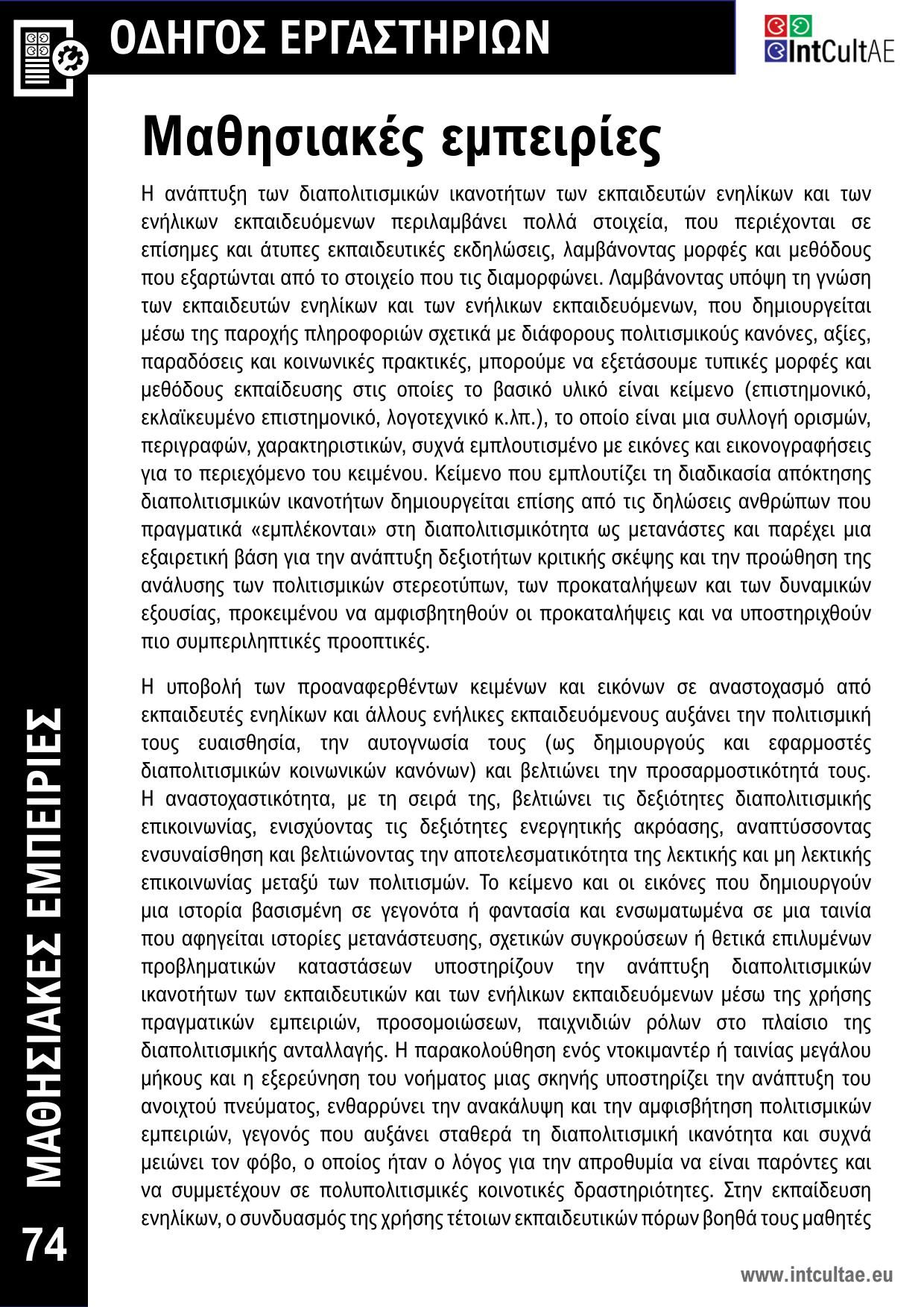 Στοχεύει σε οργανισμούς και εκπαιδευτικά ιδρύματα που ενδιαφέρονται να αναπτύξουν εργαστήρια για τις διαπολιτισμικές ικανότητες των εκπαιδευτών ενηλίκων. Στοχεύει στο να αξιοποιήσει το δυναμικό των ομαδικών δραστηριοτήτων πρόσωπο με πρόσωπο. Περιλαμβάνει οδηγίες σχετικά με την τεχνική υλοποίηση και αξιολογεί την ευκαιρία να εξασκηθούν δεξιότητες σε πραγματικά περιβάλλοντα και να συζητηθούν εμπειρίες σε ομάδες εστίασης.