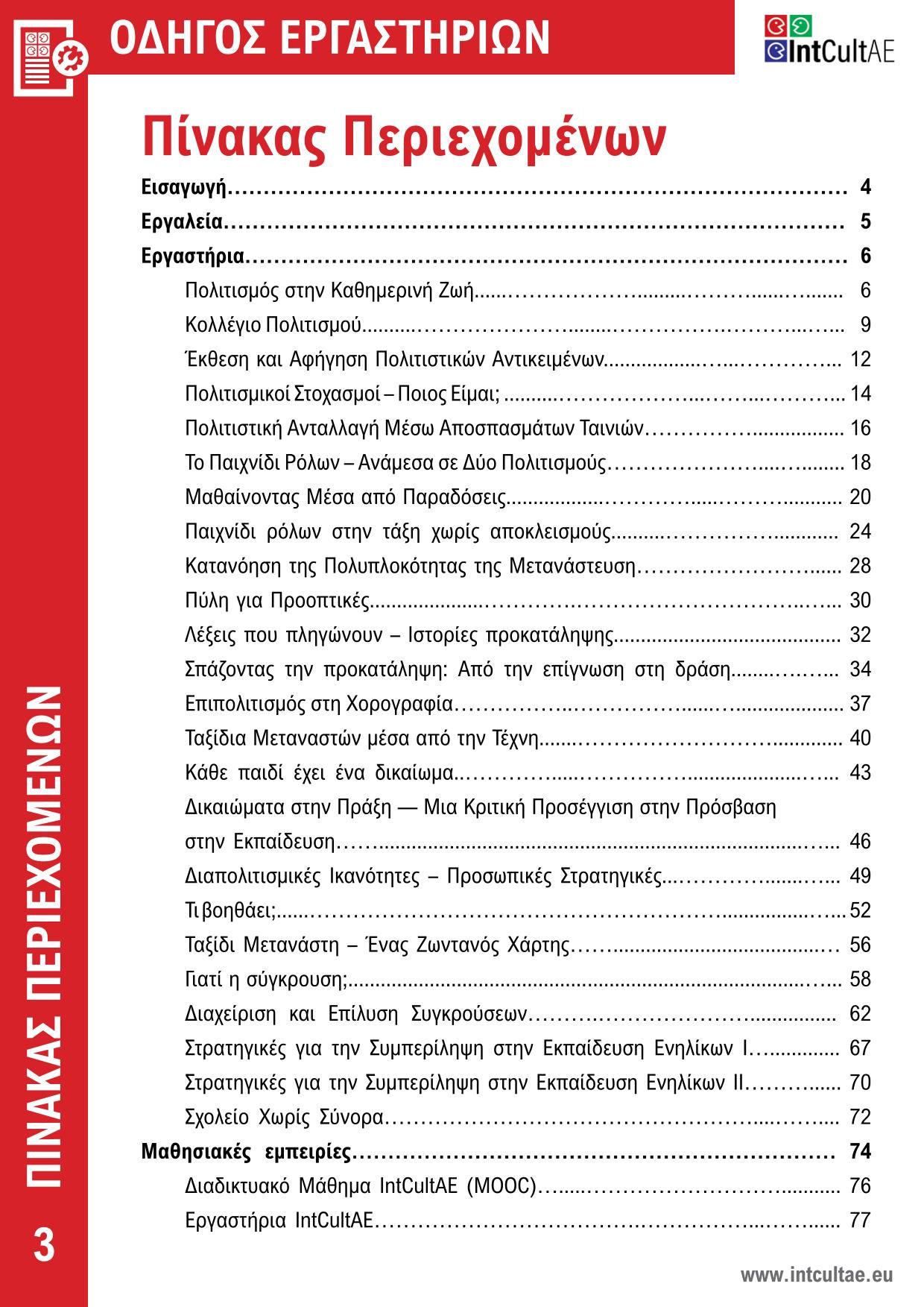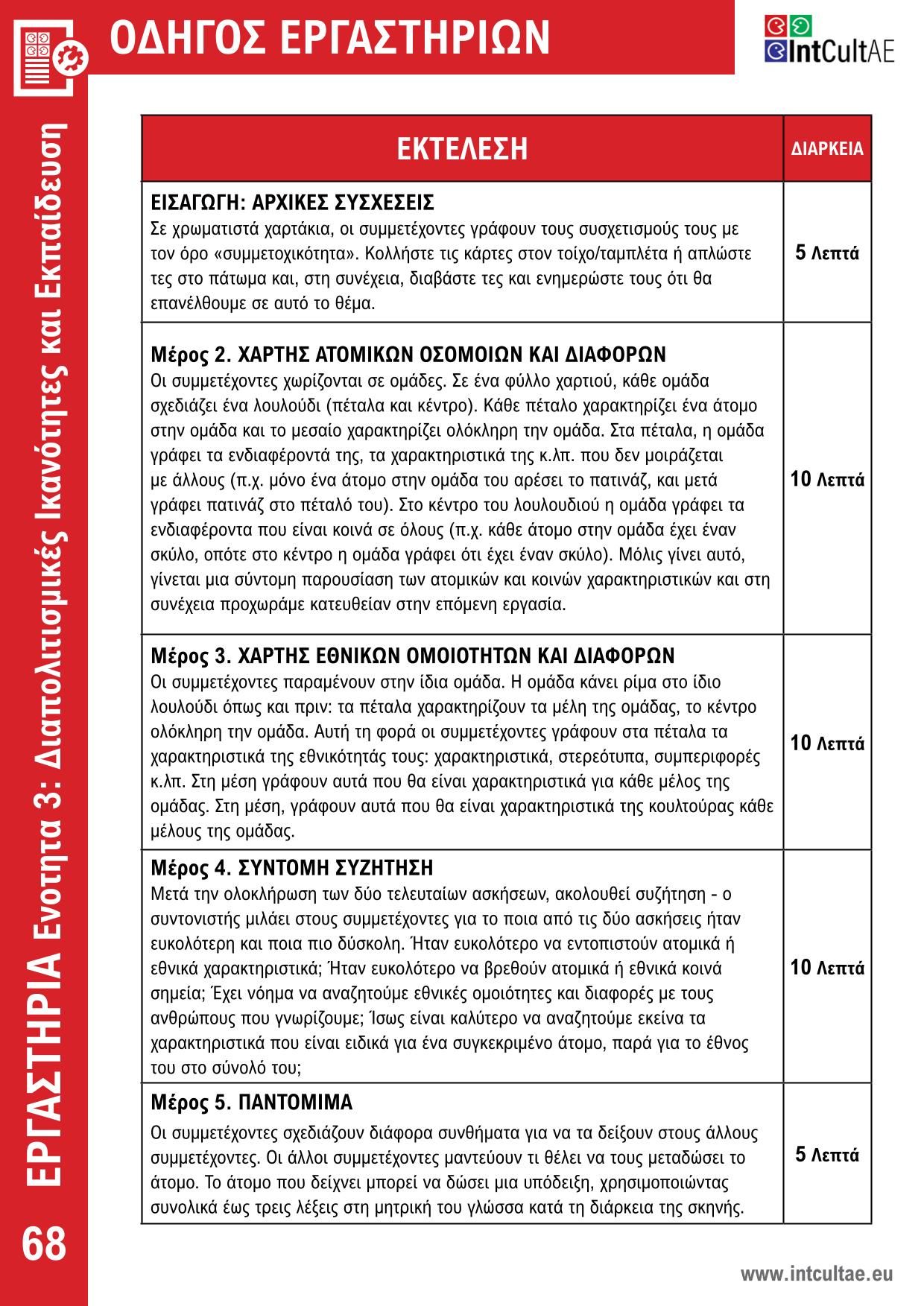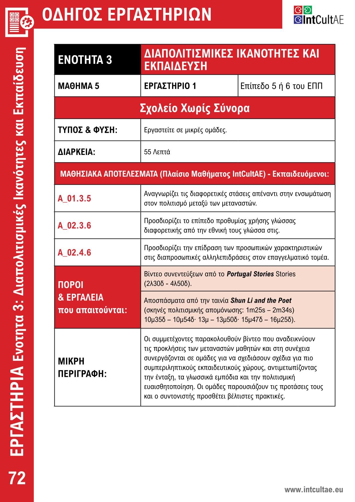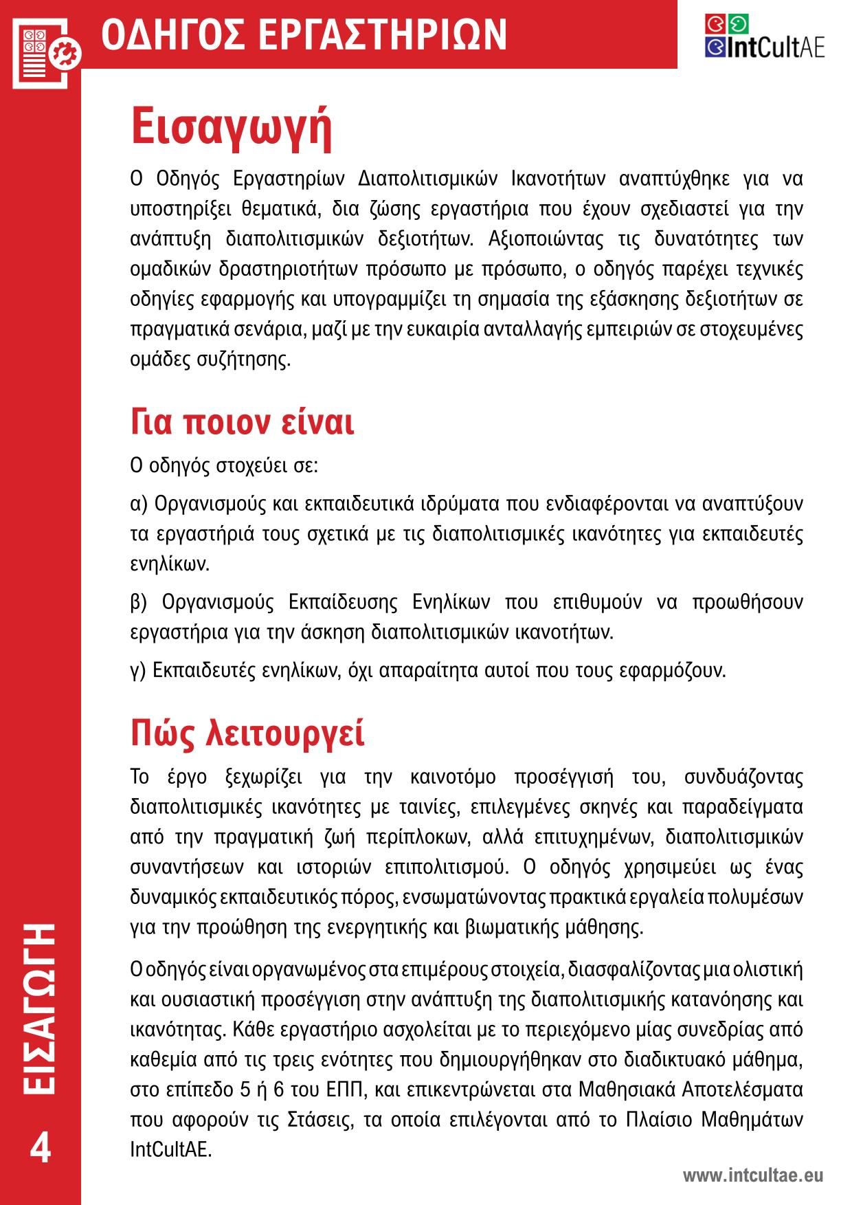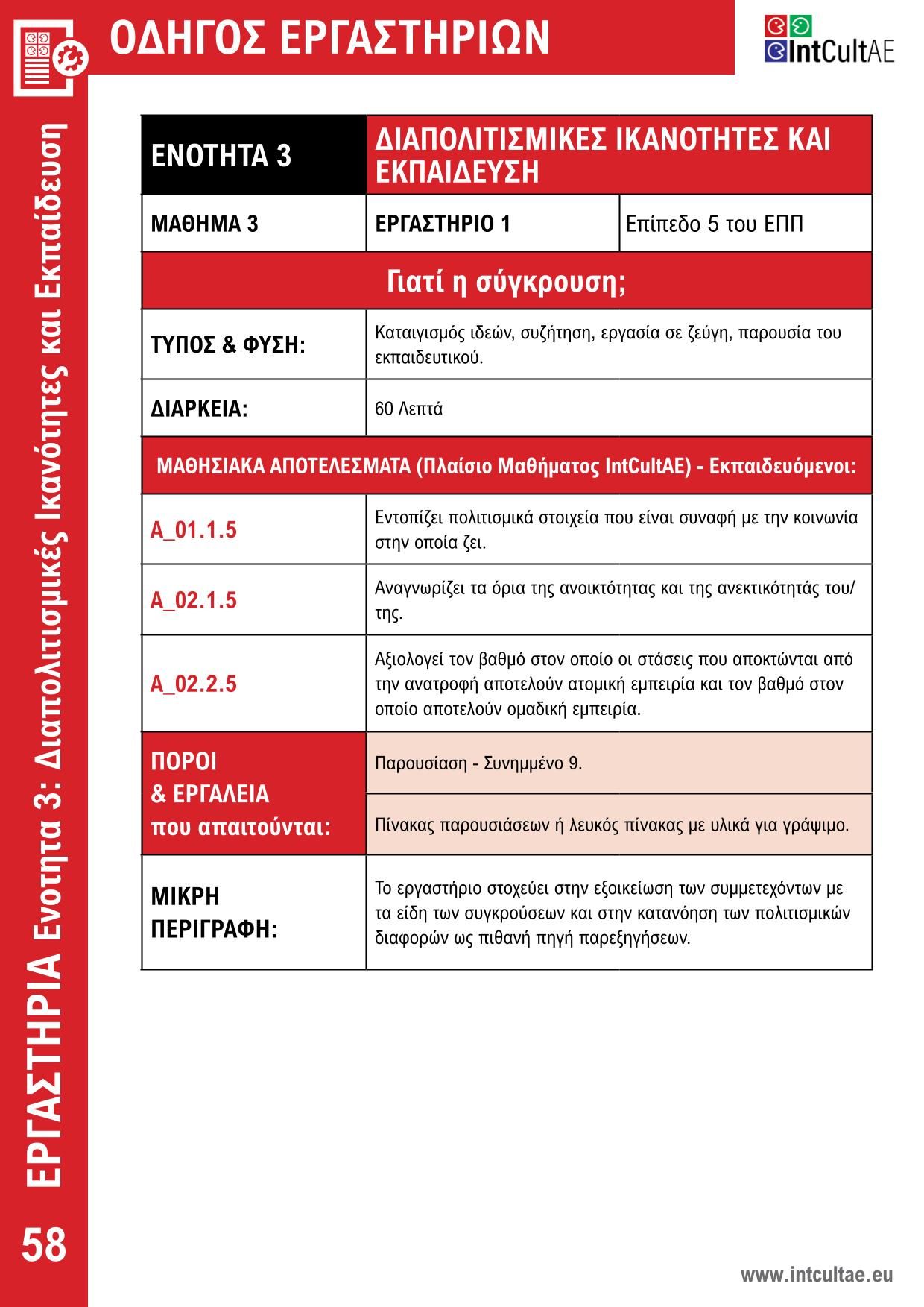 Στοχεύει σε οργανισμούς και εκπαιδευτικά ιδρύματα που ενδιαφέρονται να αναπτύξουν εργαστήρια για τις διαπολιτισμικές ικανότητες των εκπαιδευτών ενηλίκων. Στοχεύει στο να αξιοποιήσει το δυναμικό των ομαδικών δραστηριοτήτων πρόσωπο με πρόσωπο. Περιλαμβάνει οδηγίες σχετικά με την τεχνική υλοποίηση και αξιολογεί την ευκαιρία να εξασκηθούν δεξιότητες σε πραγματικά περιβάλλοντα και να συζητηθούν εμπειρίες σε ομάδες εστίασης.