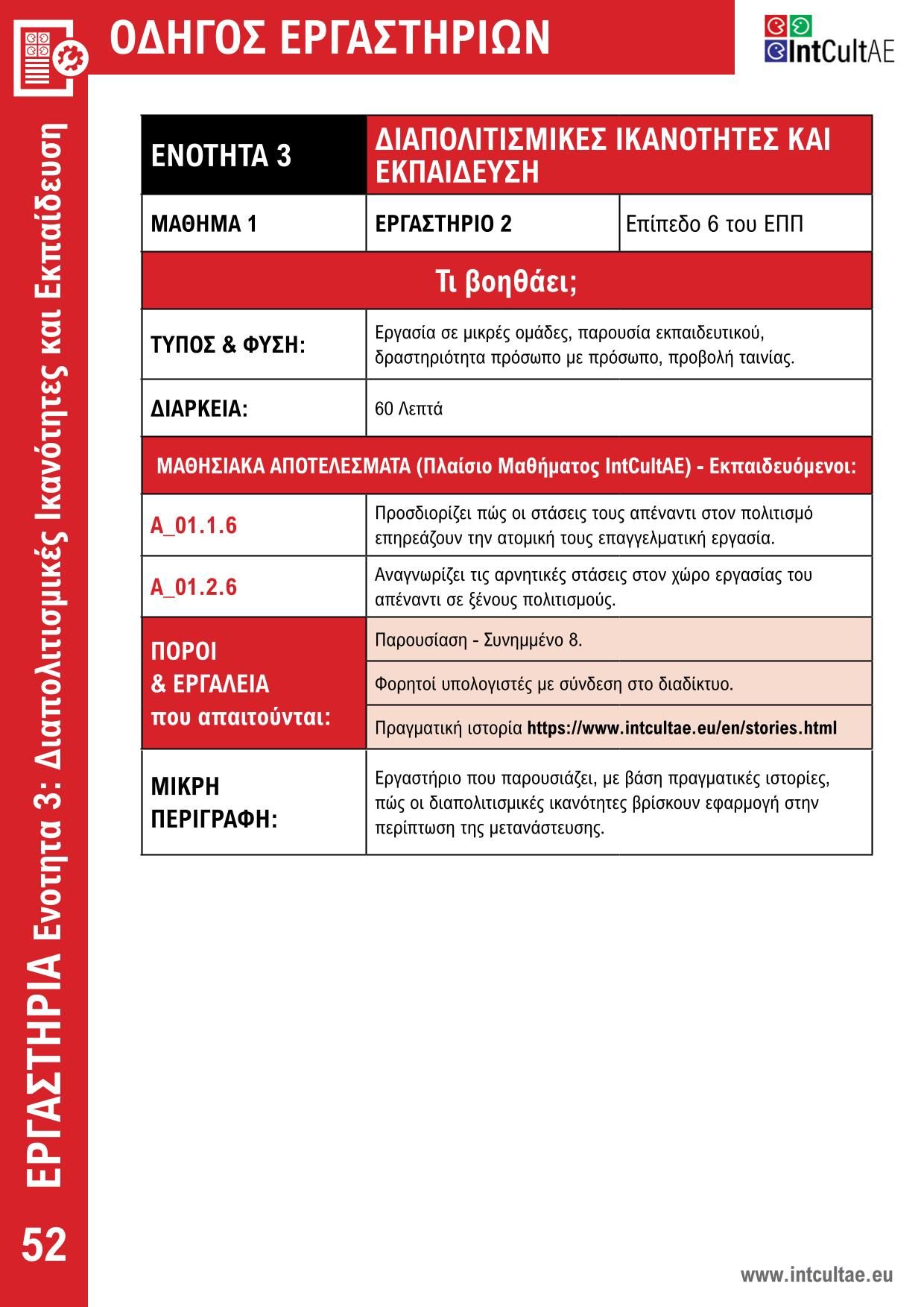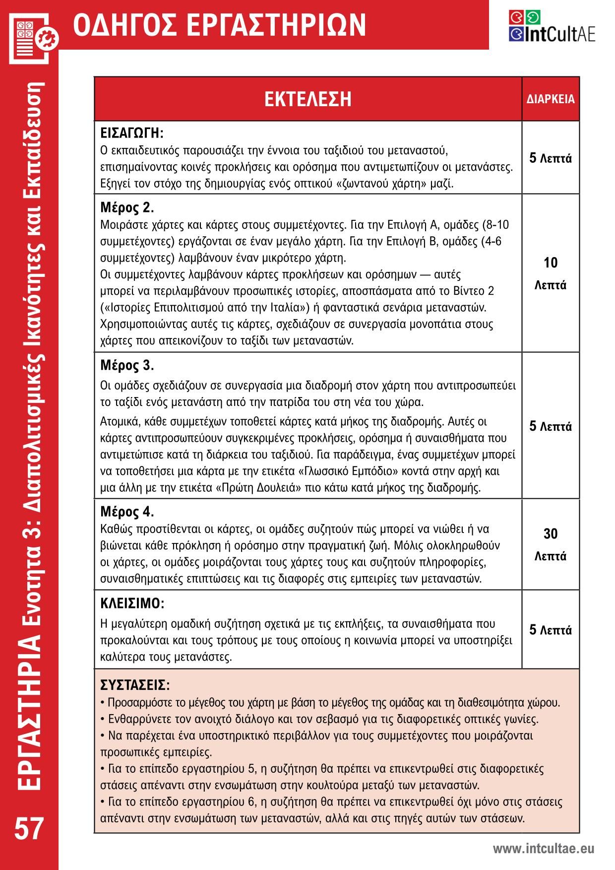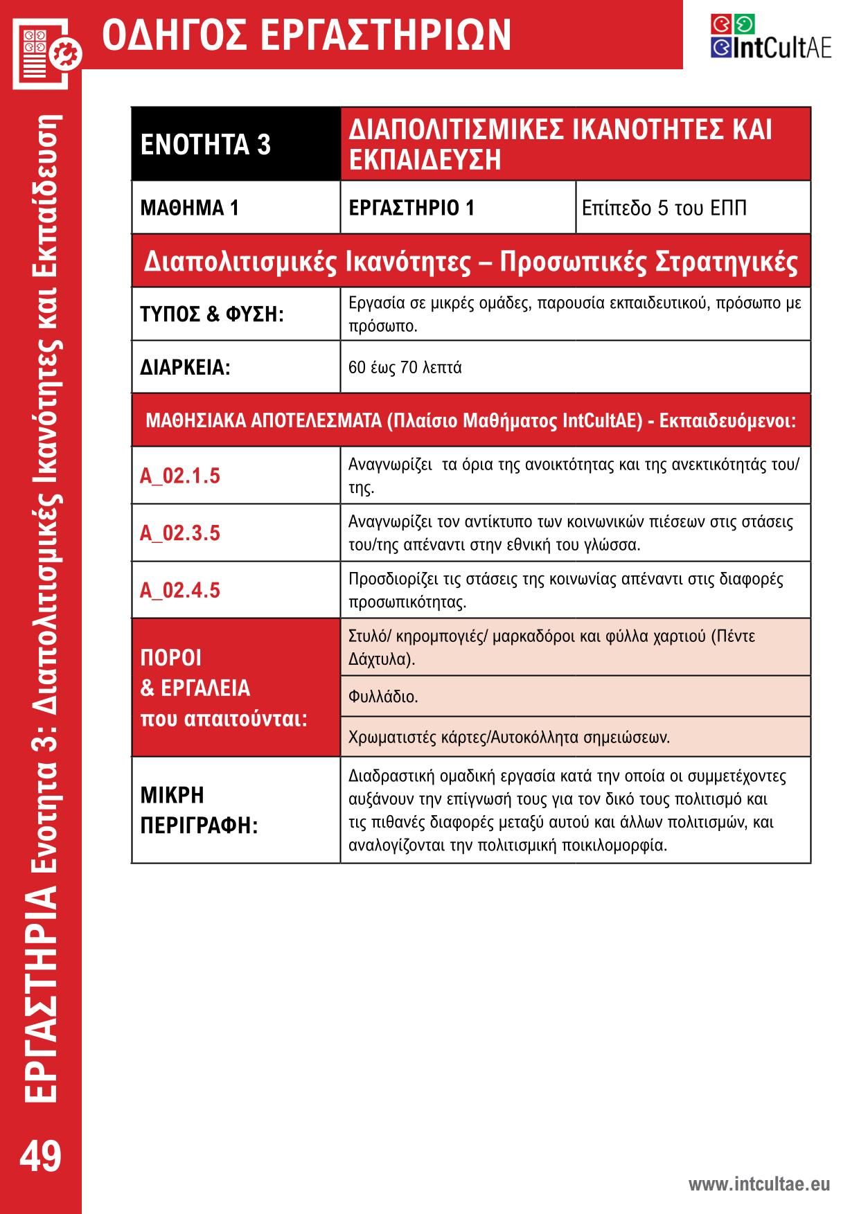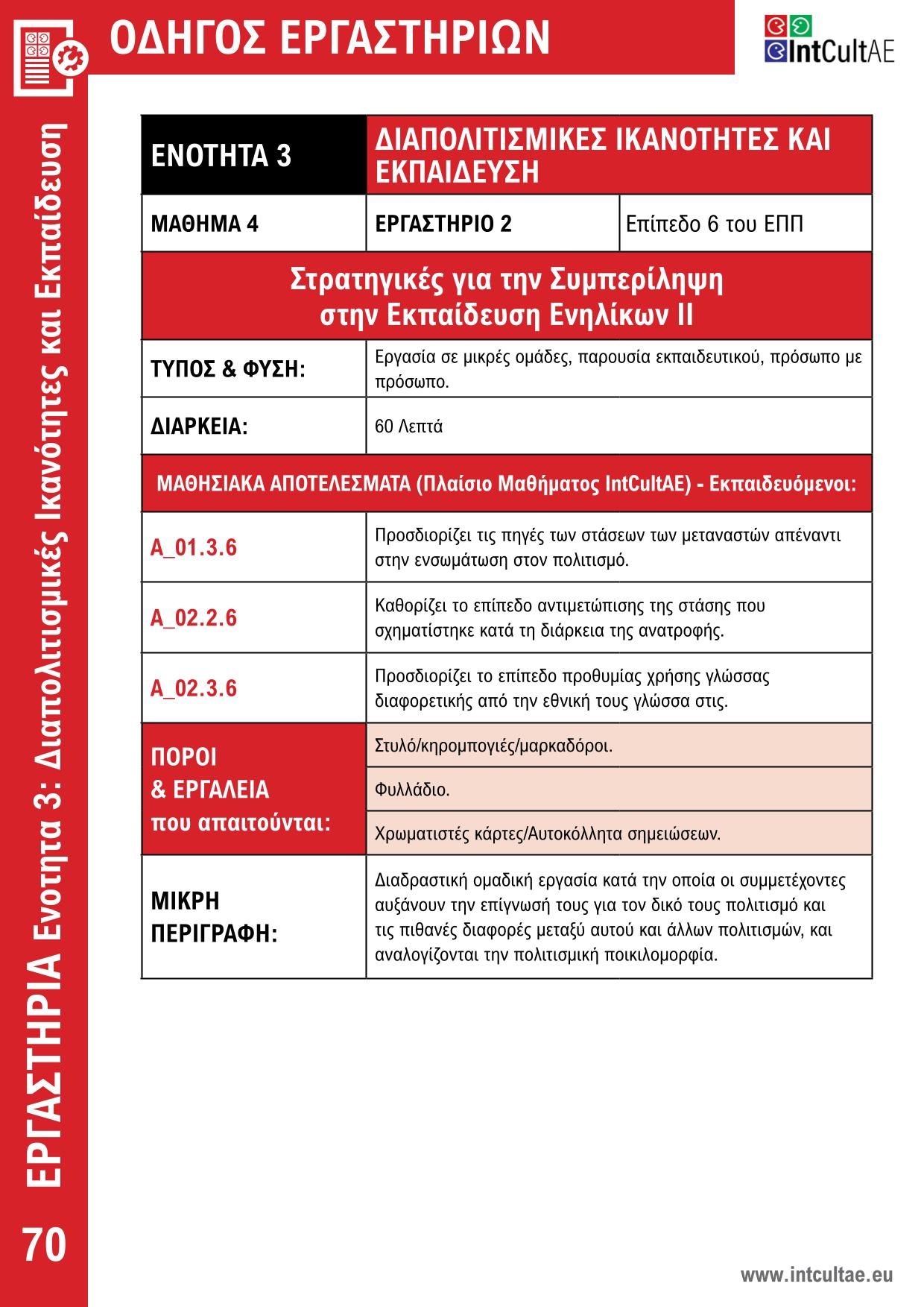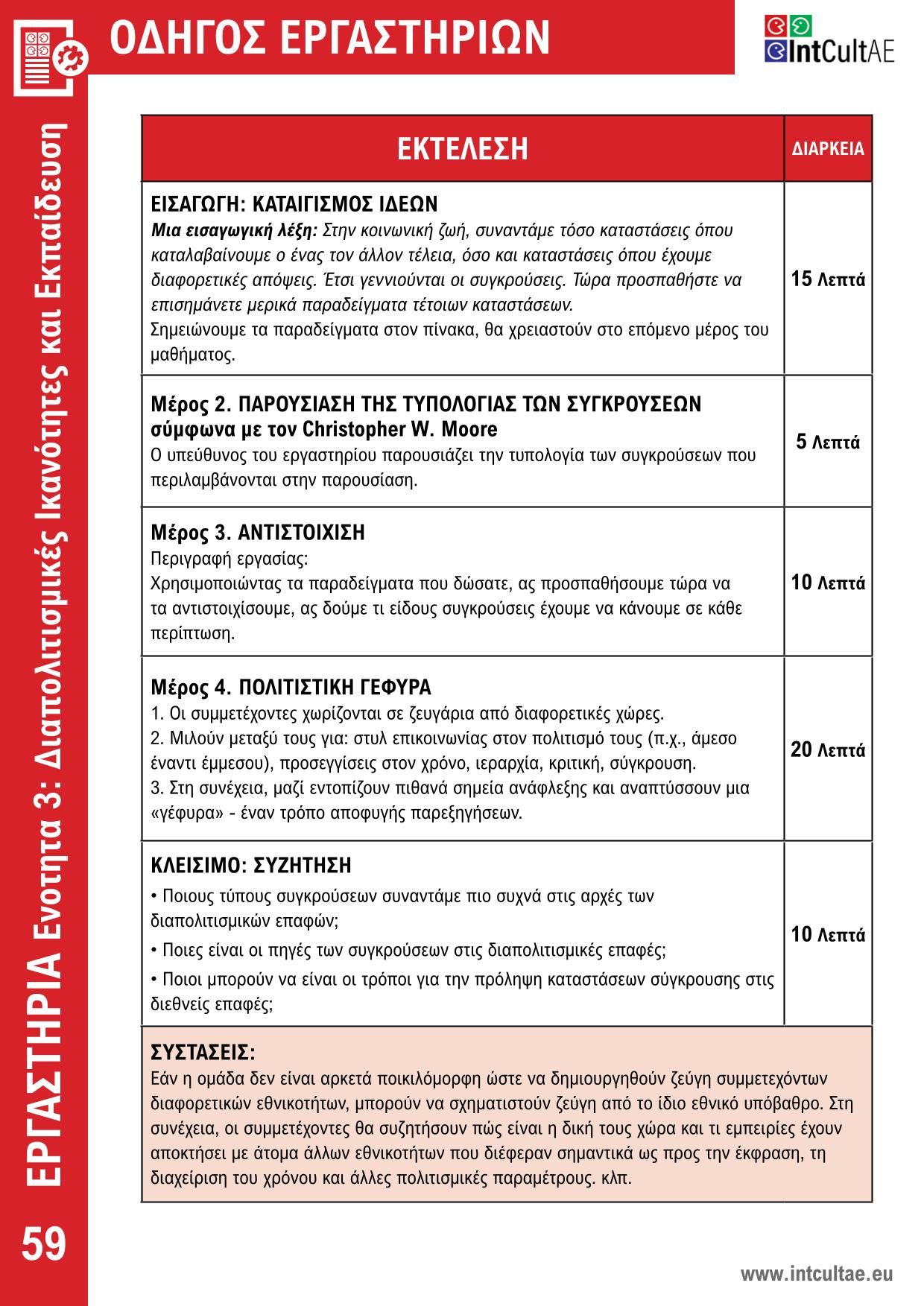 Στοχεύει σε οργανισμούς και εκπαιδευτικά ιδρύματα που ενδιαφέρονται να αναπτύξουν εργαστήρια για τις διαπολιτισμικές ικανότητες των εκπαιδευτών ενηλίκων. Στοχεύει στο να αξιοποιήσει το δυναμικό των ομαδικών δραστηριοτήτων πρόσωπο με πρόσωπο. Περιλαμβάνει οδηγίες σχετικά με την τεχνική υλοποίηση και αξιολογεί την ευκαιρία να εξασκηθούν δεξιότητες σε πραγματικά περιβάλλοντα και να συζητηθούν εμπειρίες σε ομάδες εστίασης.
