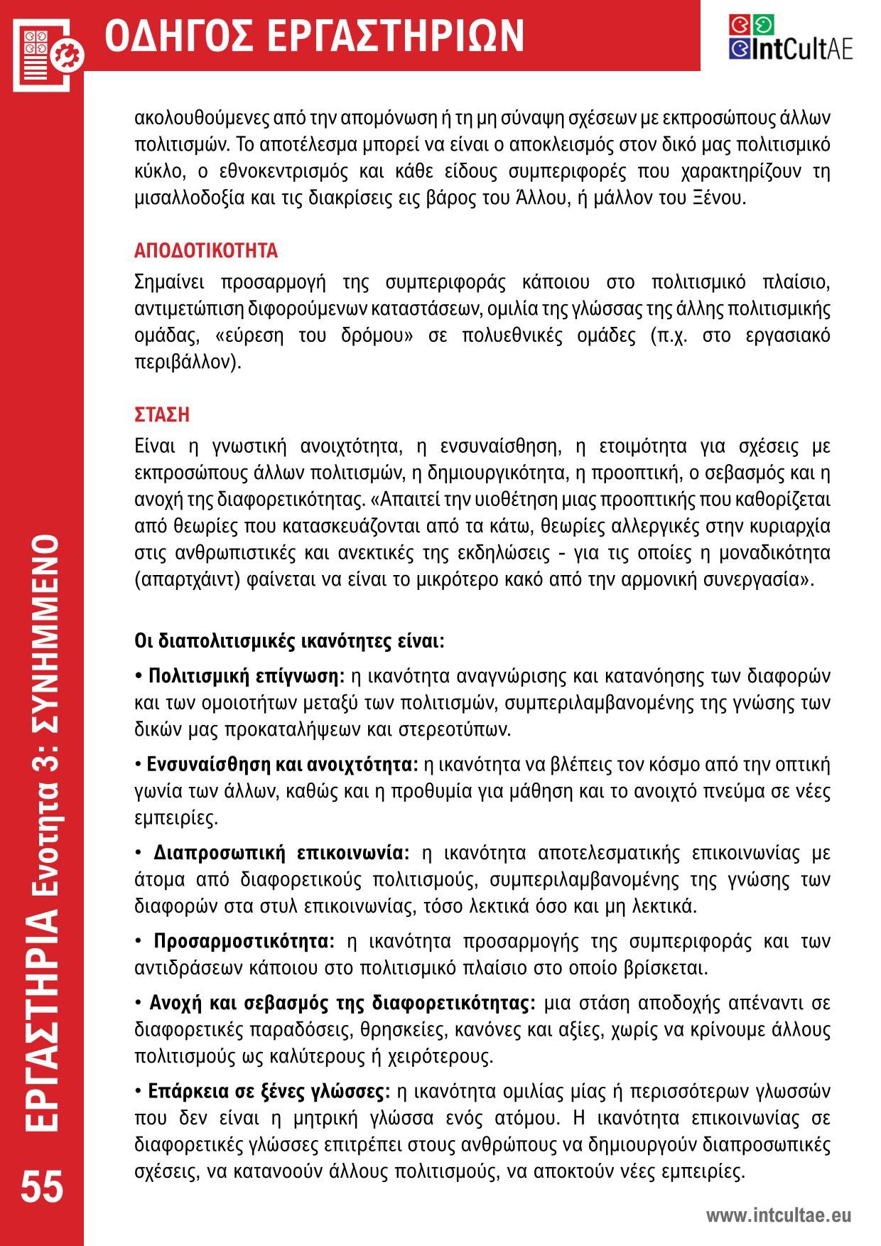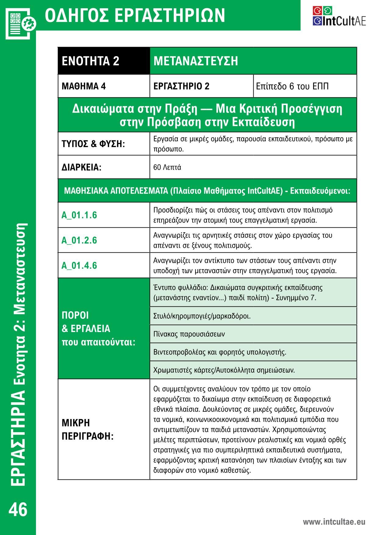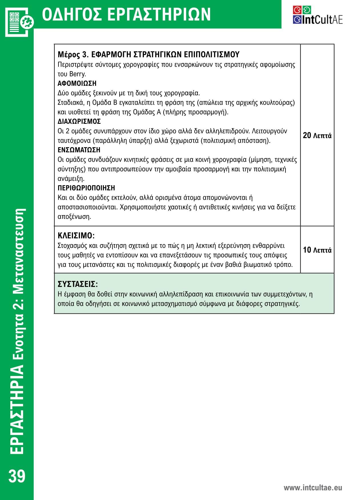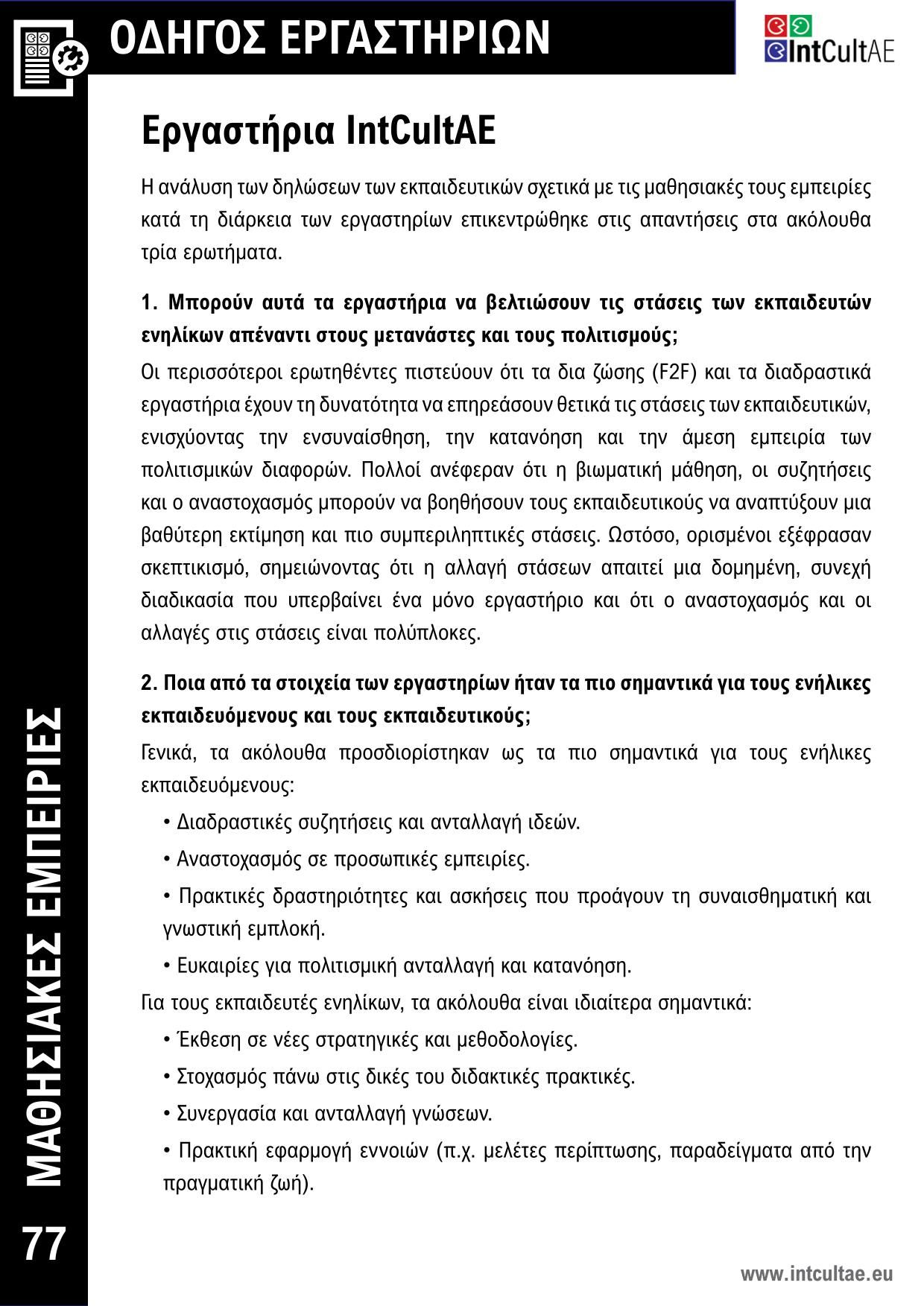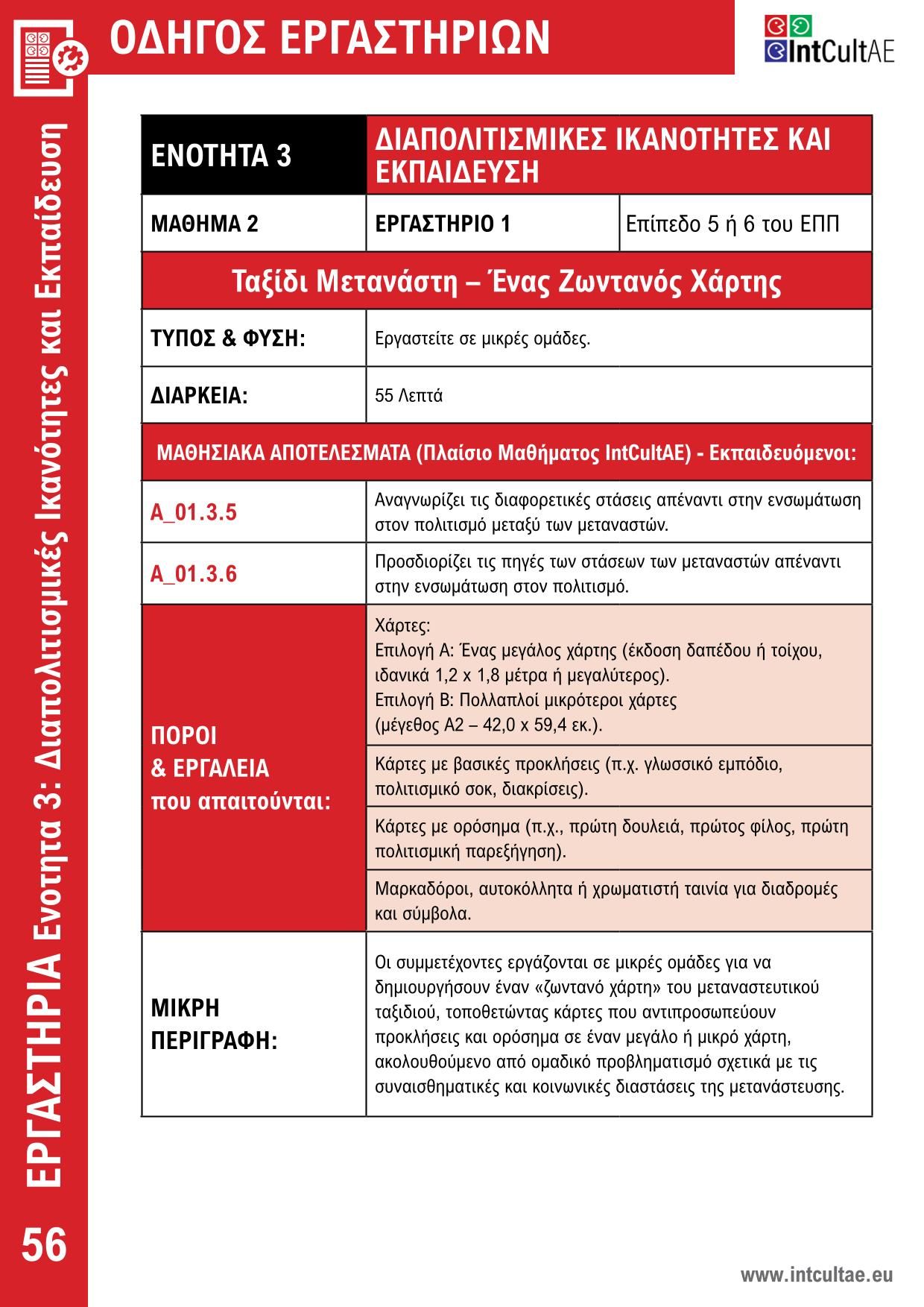 Στοχεύει σε οργανισμούς και εκπαιδευτικά ιδρύματα που ενδιαφέρονται να αναπτύξουν εργαστήρια για τις διαπολιτισμικές ικανότητες των εκπαιδευτών ενηλίκων. Στοχεύει στο να αξιοποιήσει το δυναμικό των ομαδικών δραστηριοτήτων πρόσωπο με πρόσωπο. Περιλαμβάνει οδηγίες σχετικά με την τεχνική υλοποίηση και αξιολογεί την ευκαιρία να εξασκηθούν δεξιότητες σε πραγματικά περιβάλλοντα και να συζητηθούν εμπειρίες σε ομάδες εστίασης.