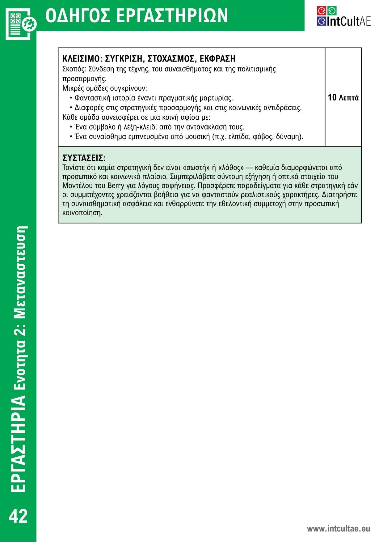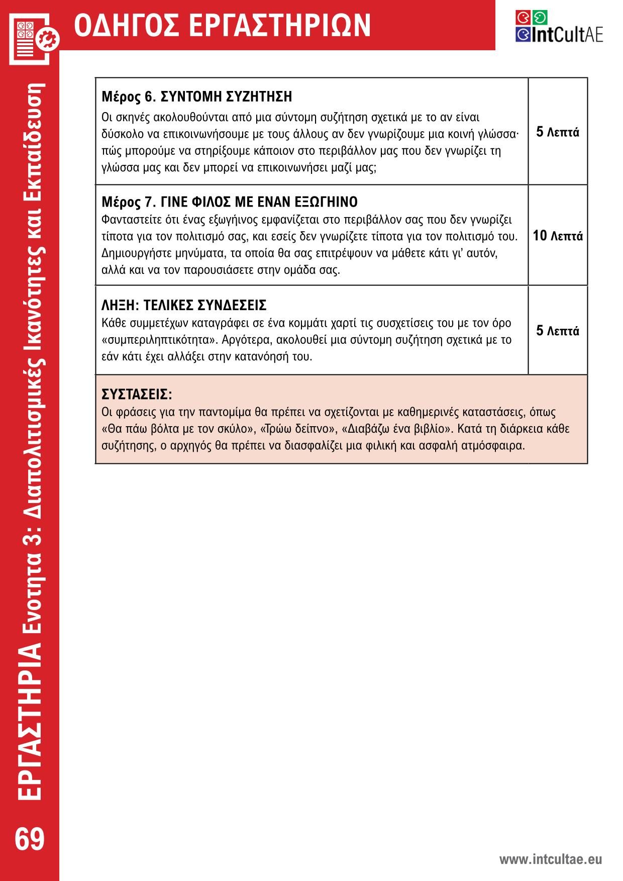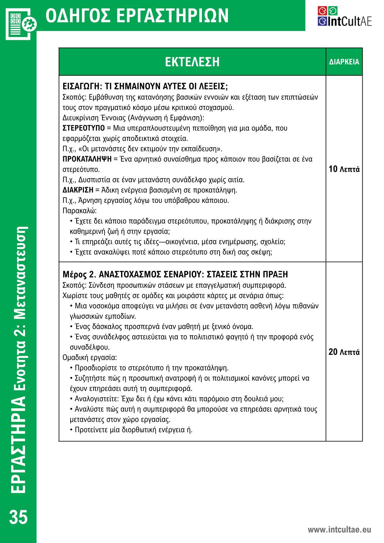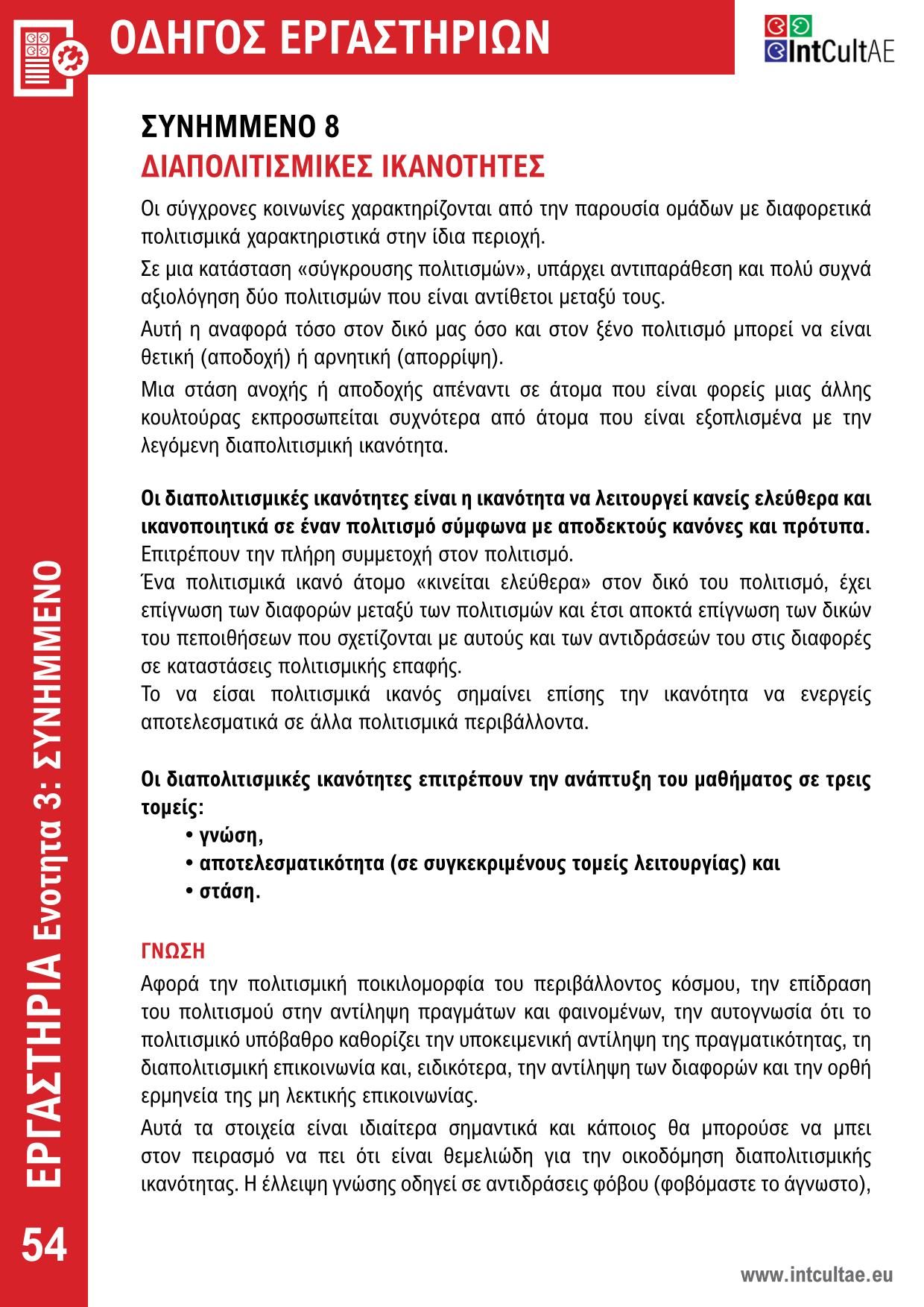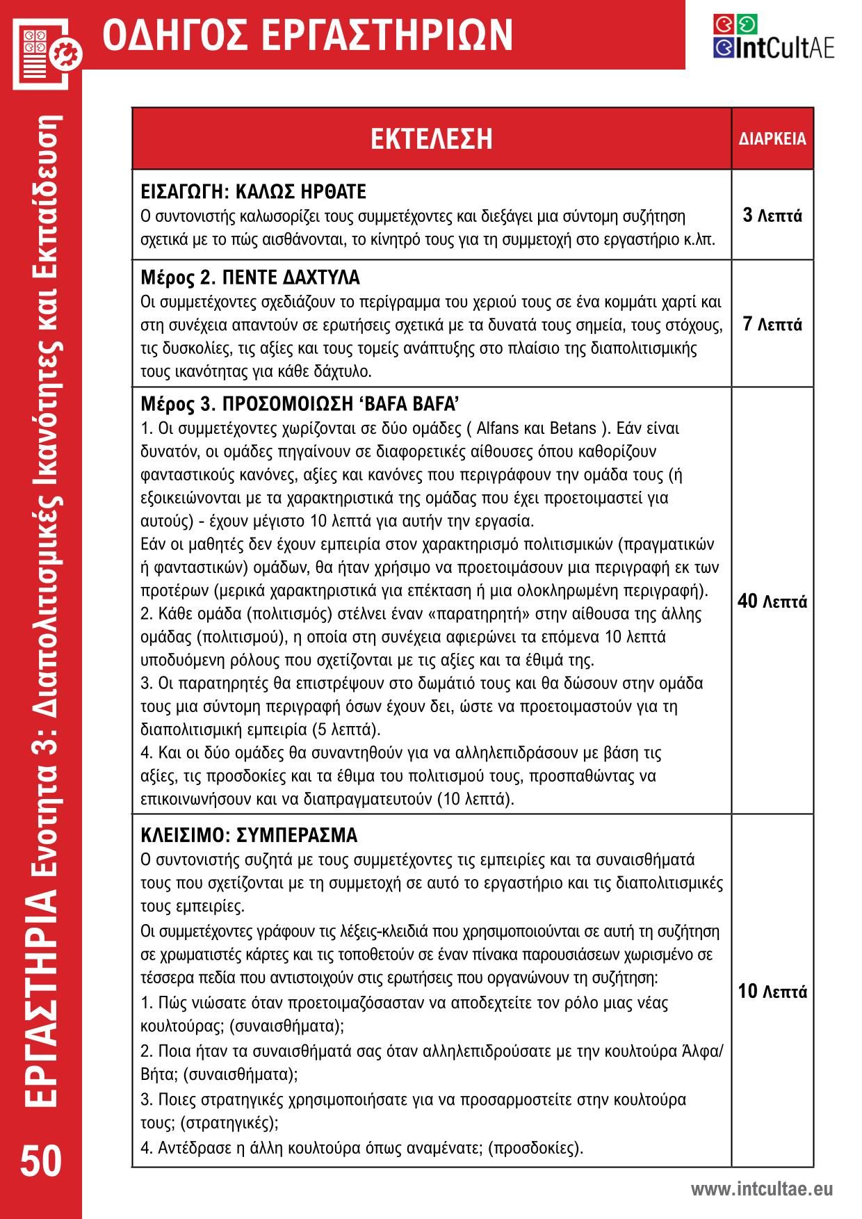 Στοχεύει σε οργανισμούς και εκπαιδευτικά ιδρύματα που ενδιαφέρονται να αναπτύξουν εργαστήρια για τις διαπολιτισμικές ικανότητες των εκπαιδευτών ενηλίκων. Στοχεύει στο να αξιοποιήσει το δυναμικό των ομαδικών δραστηριοτήτων πρόσωπο με πρόσωπο. Περιλαμβάνει οδηγίες σχετικά με την τεχνική υλοποίηση και αξιολογεί την ευκαιρία να εξασκηθούν δεξιότητες σε πραγματικά περιβάλλοντα και να συζητηθούν εμπειρίες σε ομάδες εστίασης.