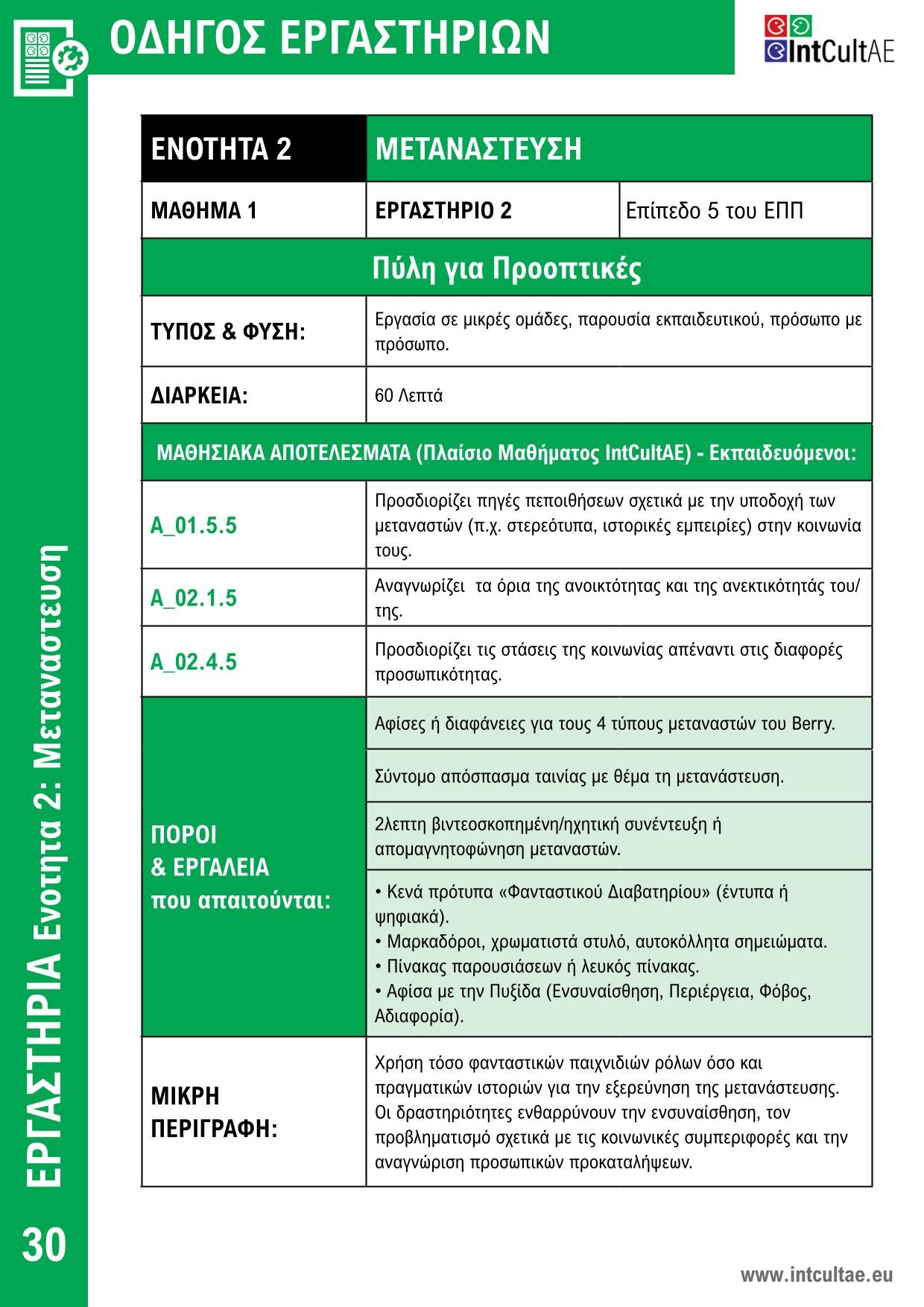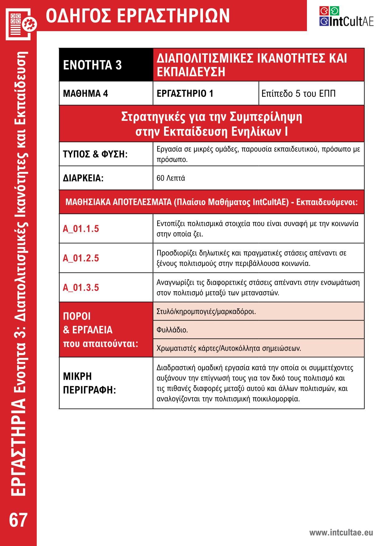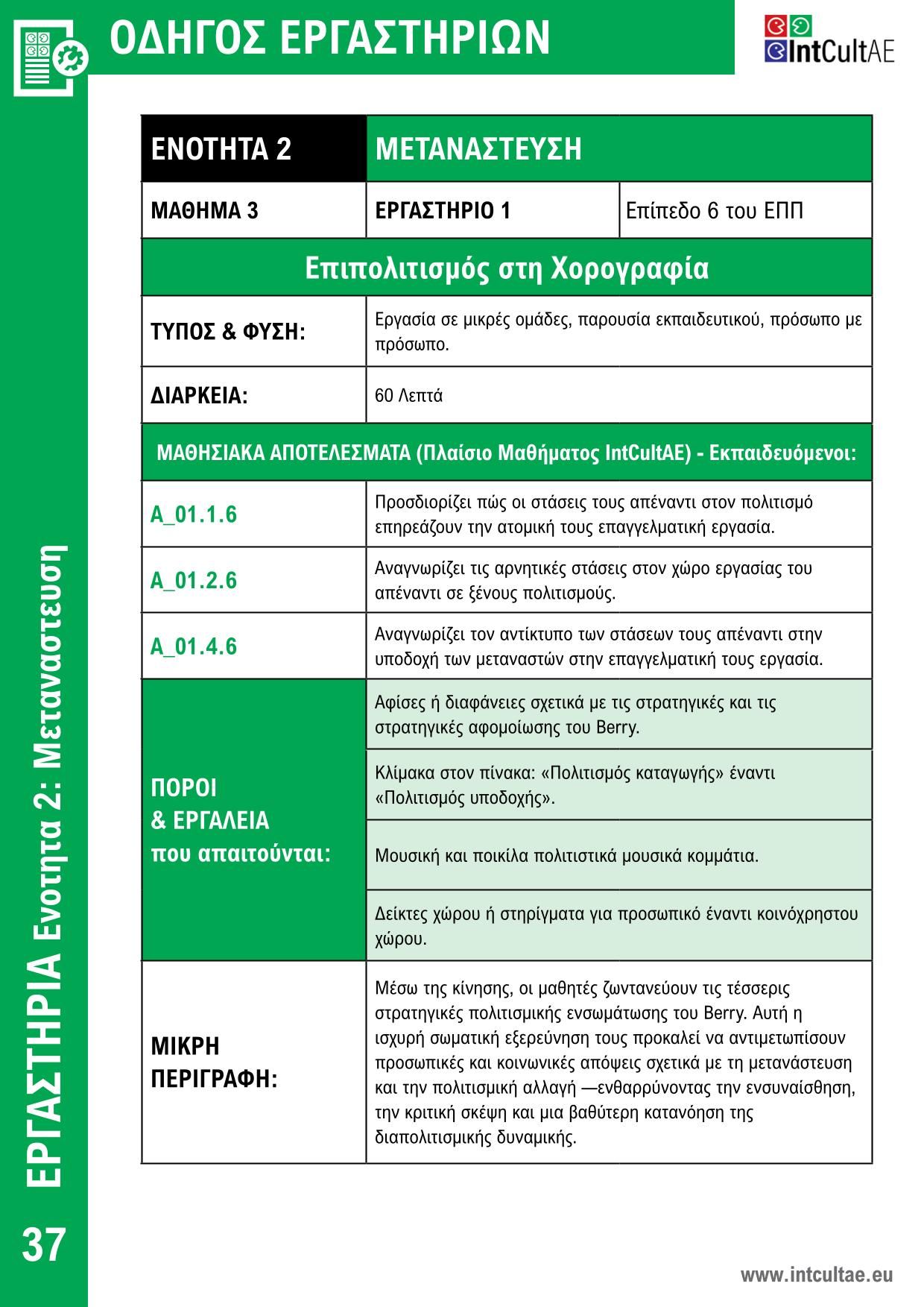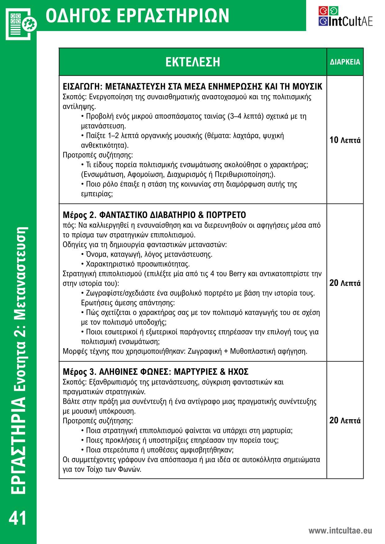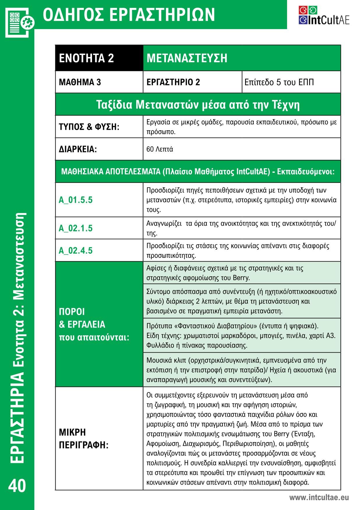 Στοχεύει σε οργανισμούς και εκπαιδευτικά ιδρύματα που ενδιαφέρονται να αναπτύξουν εργαστήρια για τις διαπολιτισμικές ικανότητες των εκπαιδευτών ενηλίκων. Στοχεύει στο να αξιοποιήσει το δυναμικό των ομαδικών δραστηριοτήτων πρόσωπο με πρόσωπο. Περιλαμβάνει οδηγίες σχετικά με την τεχνική υλοποίηση και αξιολογεί την ευκαιρία να εξασκηθούν δεξιότητες σε πραγματικά περιβάλλοντα και να συζητηθούν εμπειρίες σε ομάδες εστίασης.