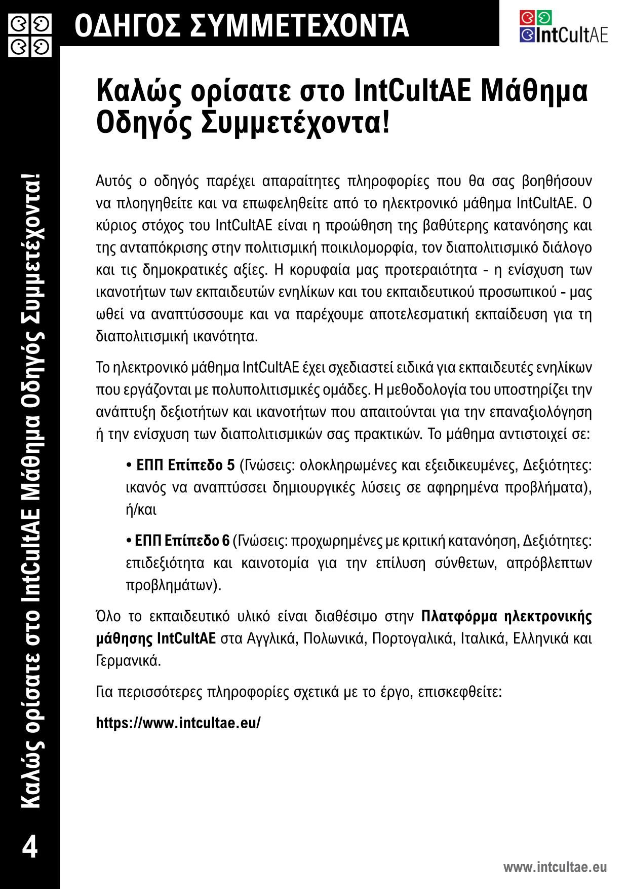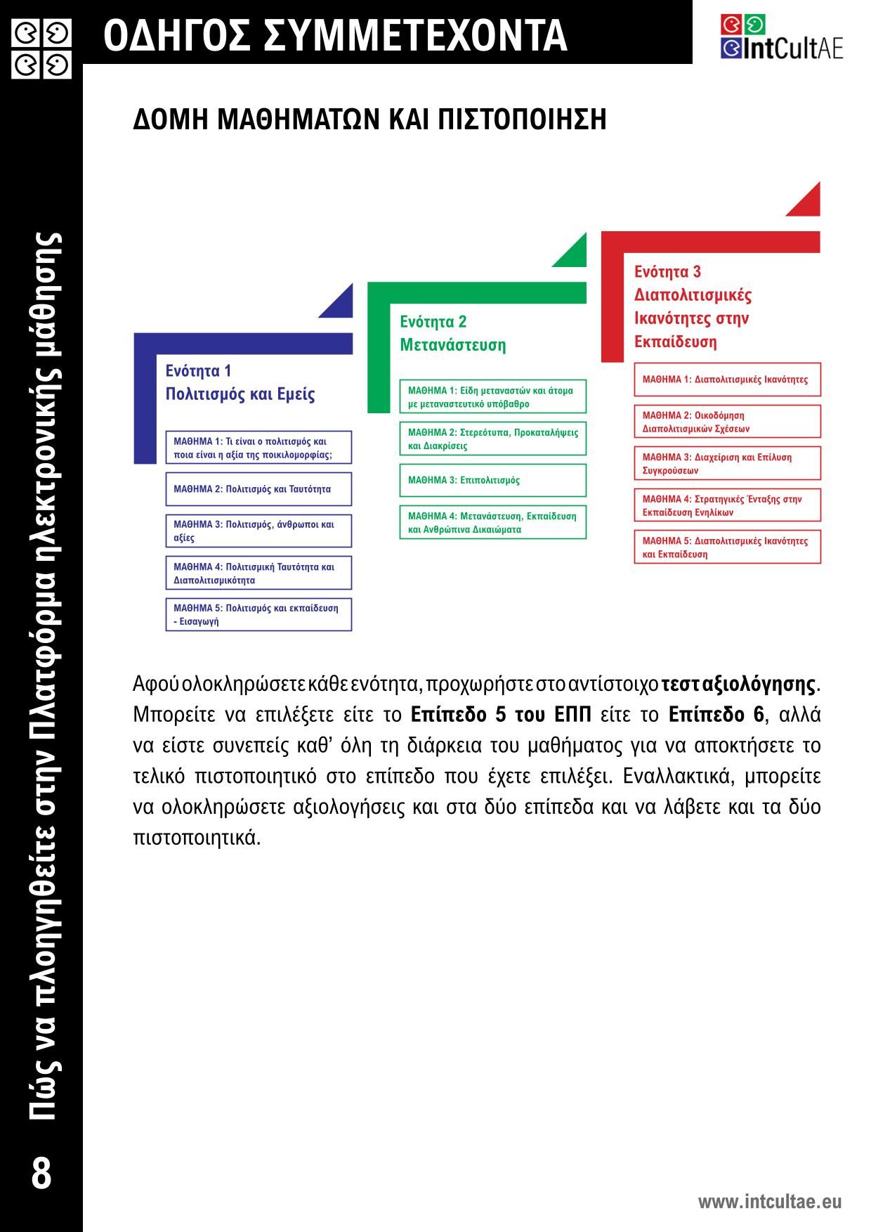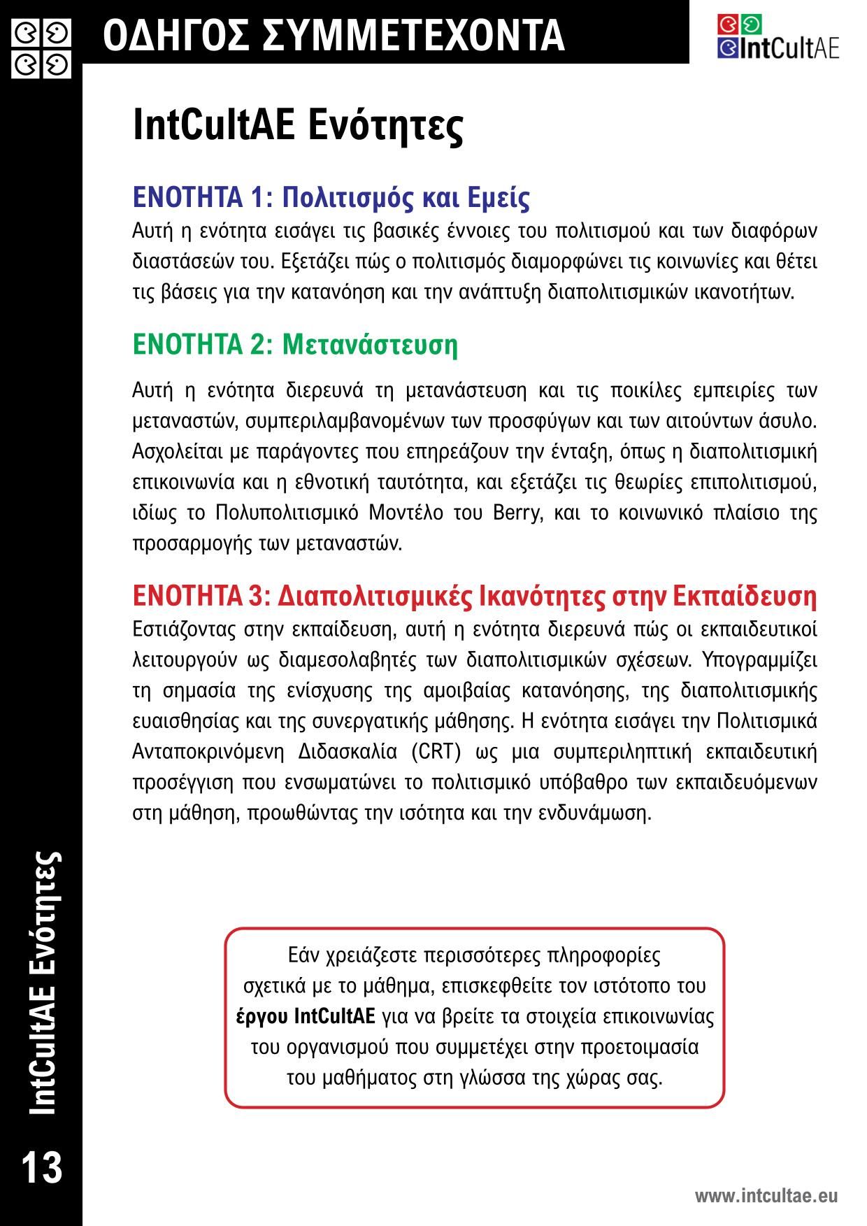 Το μάθημα εφαρμόζει το πλαίσιο και ενσωματώνει τον Κατάλογο και τις Πραγματικές Ιστορίες στις ενότητές του, με στόχο την αποδοτική ενίσχυση των διαπολιτισμικών δεξιοτήτων των ενηλίκων εκπαιδευτικών.