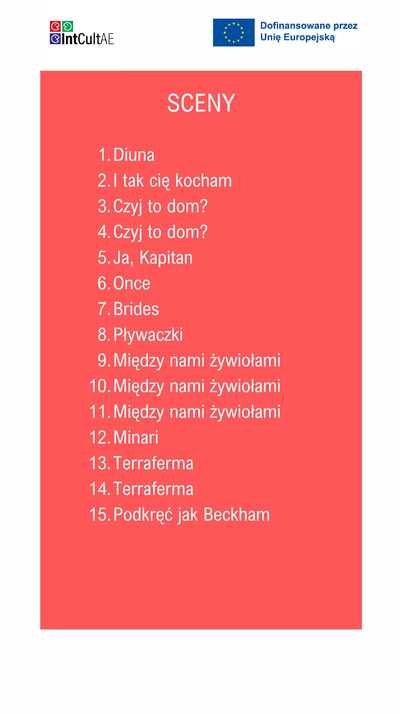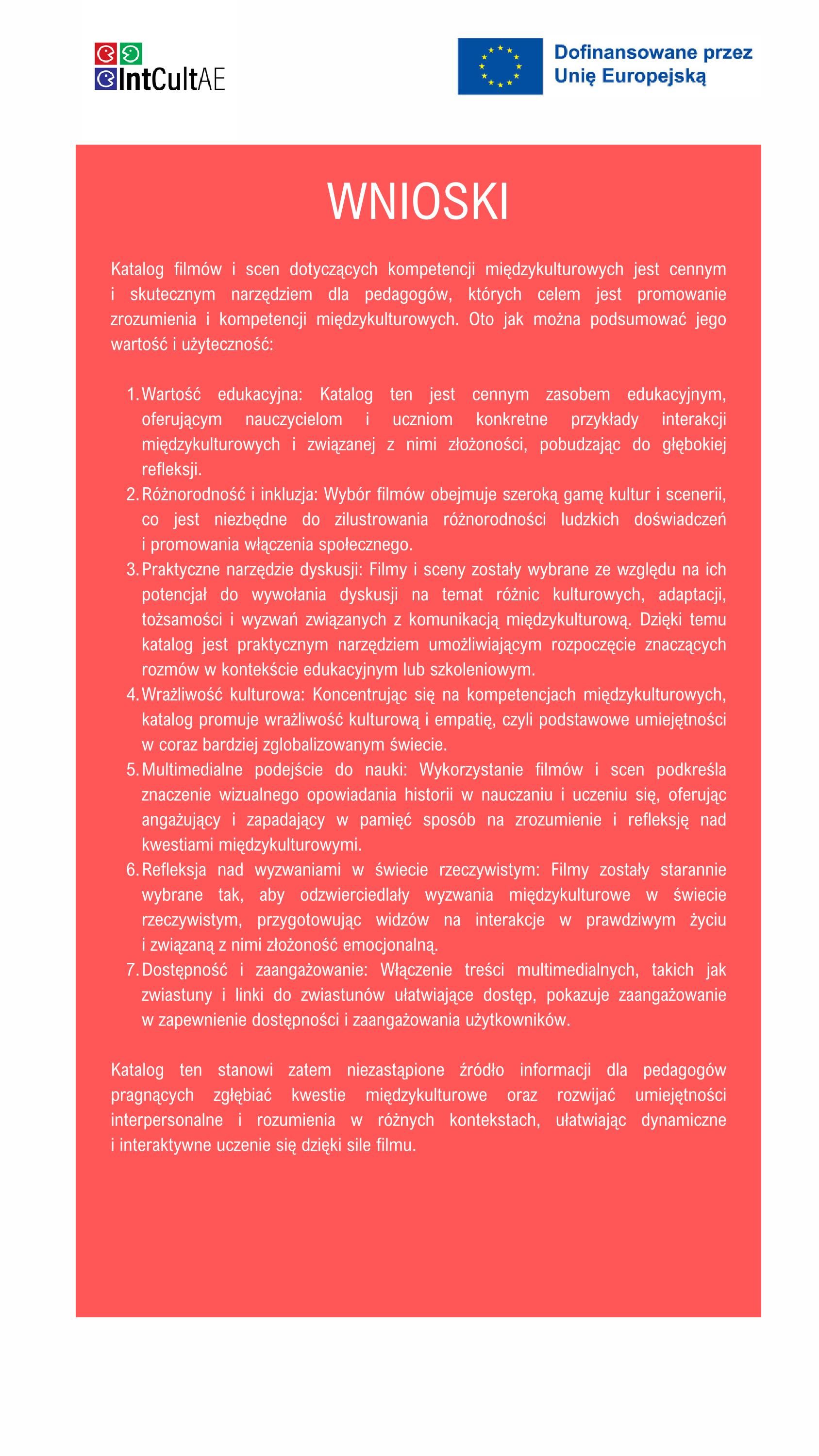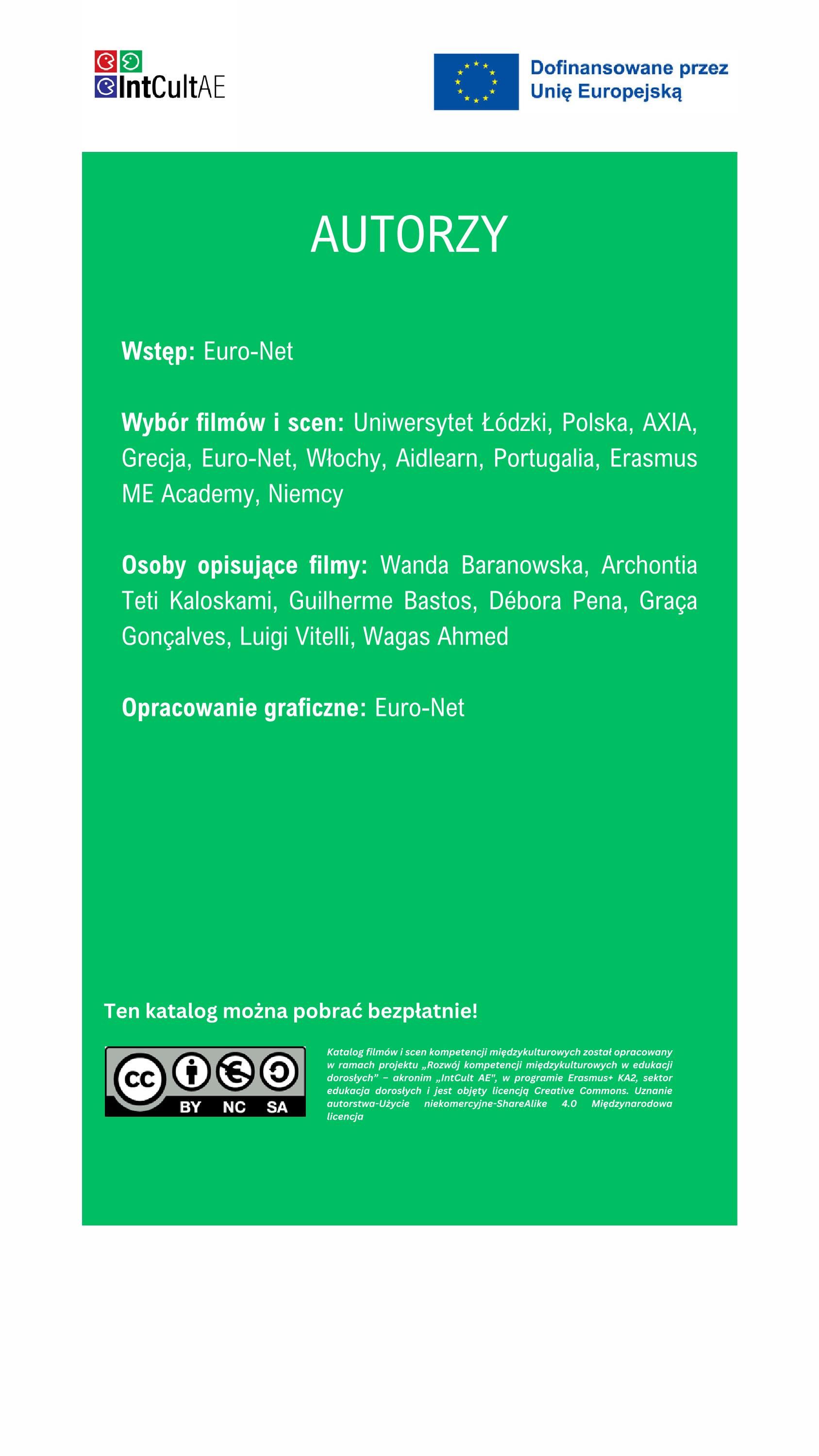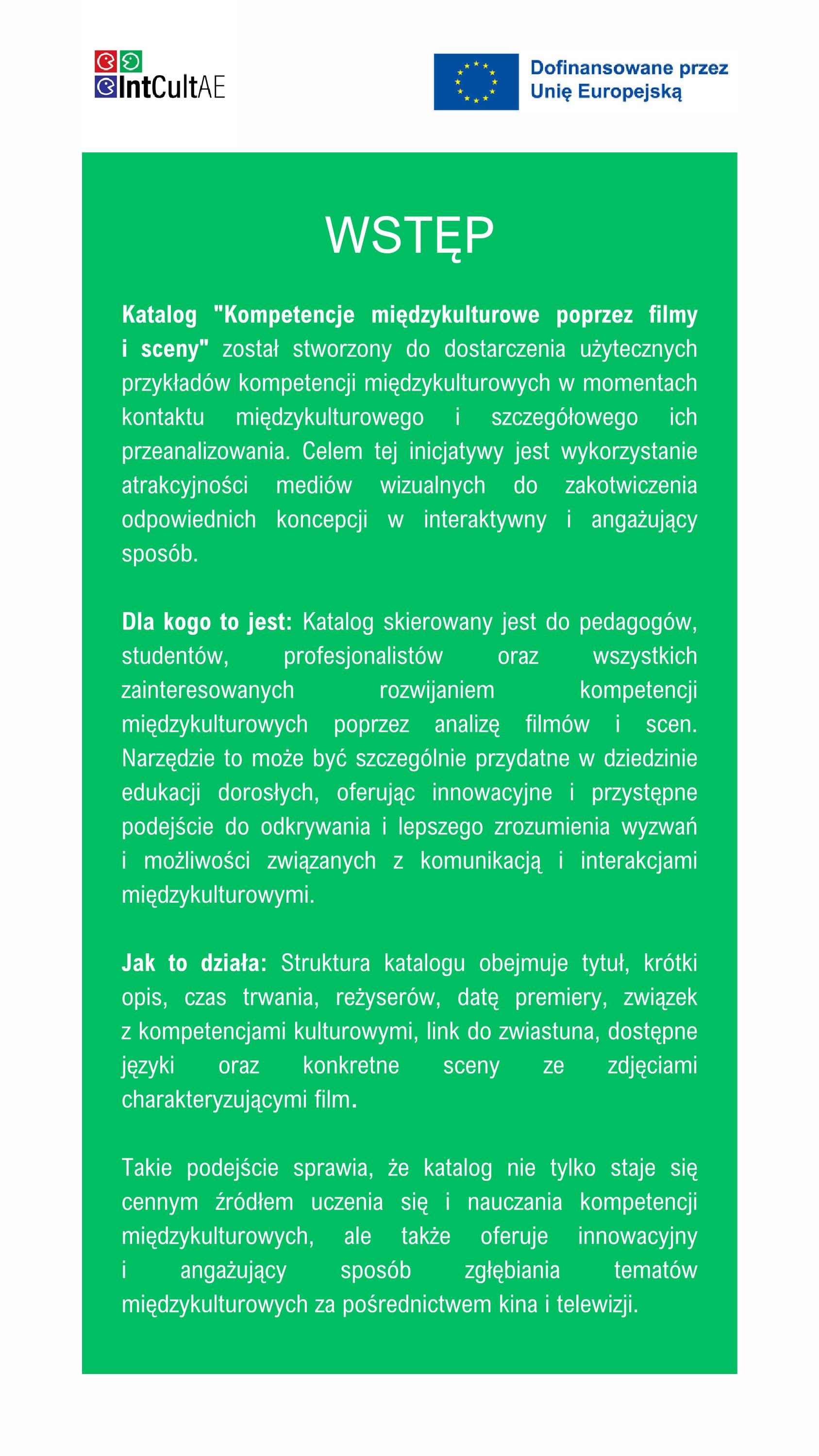 Katalog "Kompetencje międzykulturowe przez filmy i sceny" został stworzony w celu zaprezentowania wartościowych przykładów kompetencji międzykulturowych w działaniu, podczas kontaktów międzykulturowych oraz ich szczegółowej analizy. Inicjatywa ta ma na celu wykorzystanie atrakcyjności mediów wizualnych do zakotwiczenia w interaktywny i angażujący sposób odpowiednich koncepcji. Katalog zawiera 15 filmów (lub seriali w odcinkach) i 15 scen, wybranych w celu zilustrowania różnych aspektów kompetencji międzykulturowych.