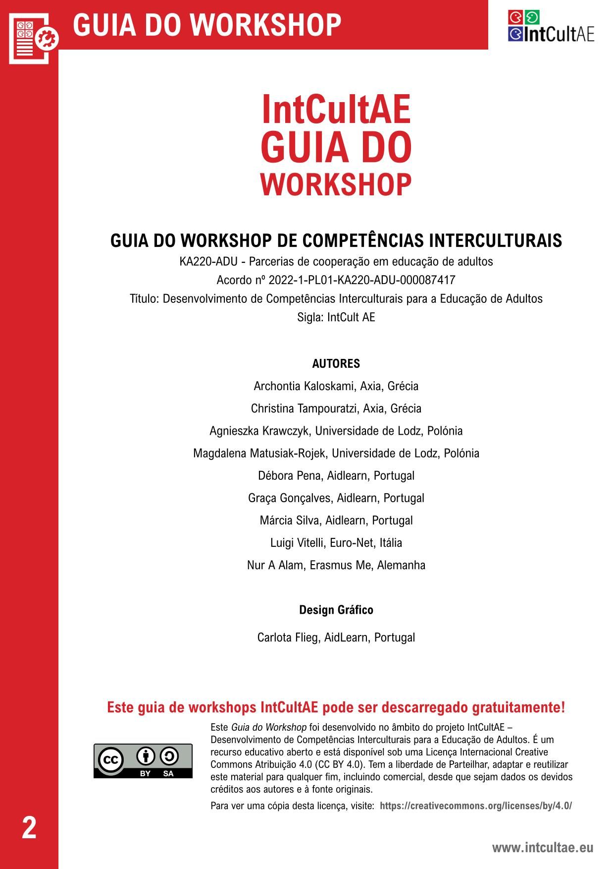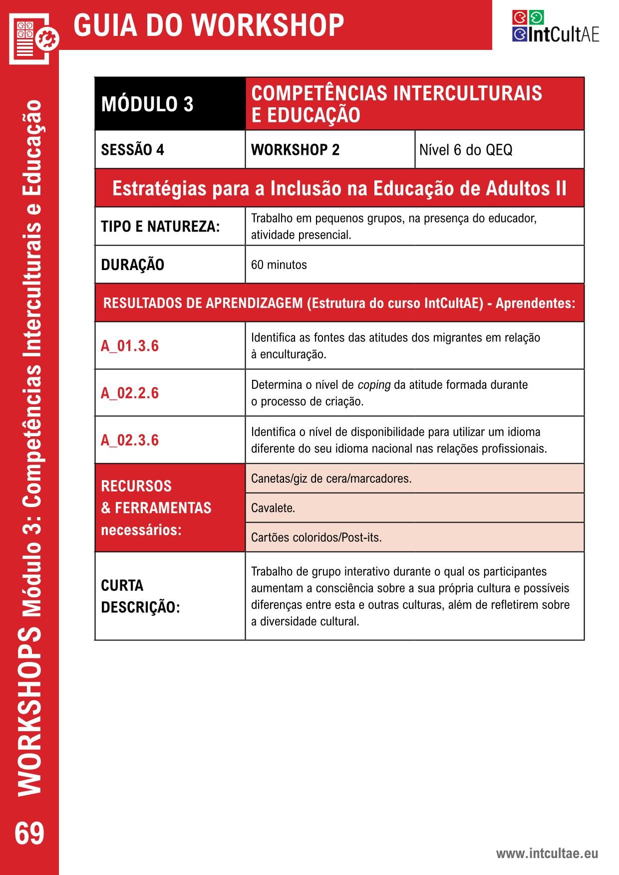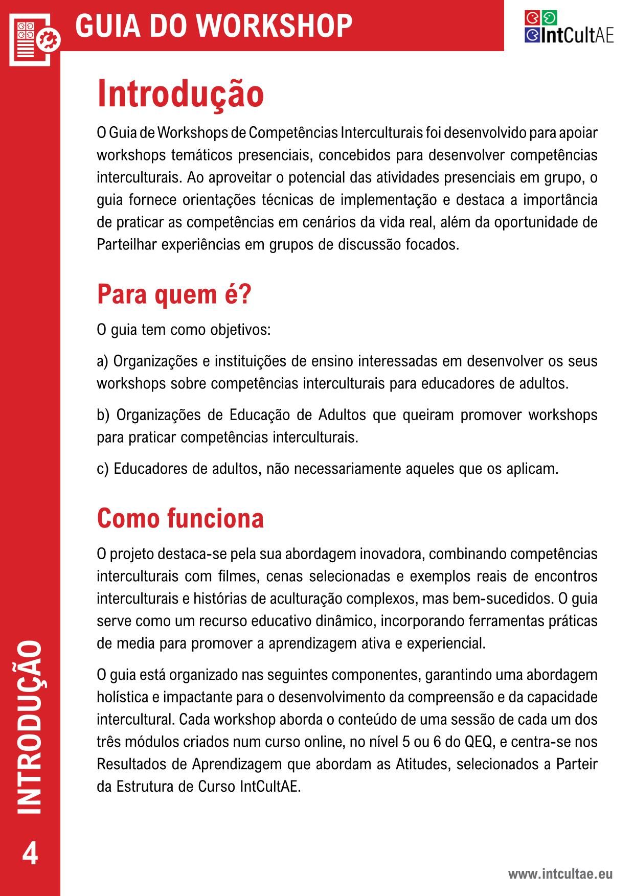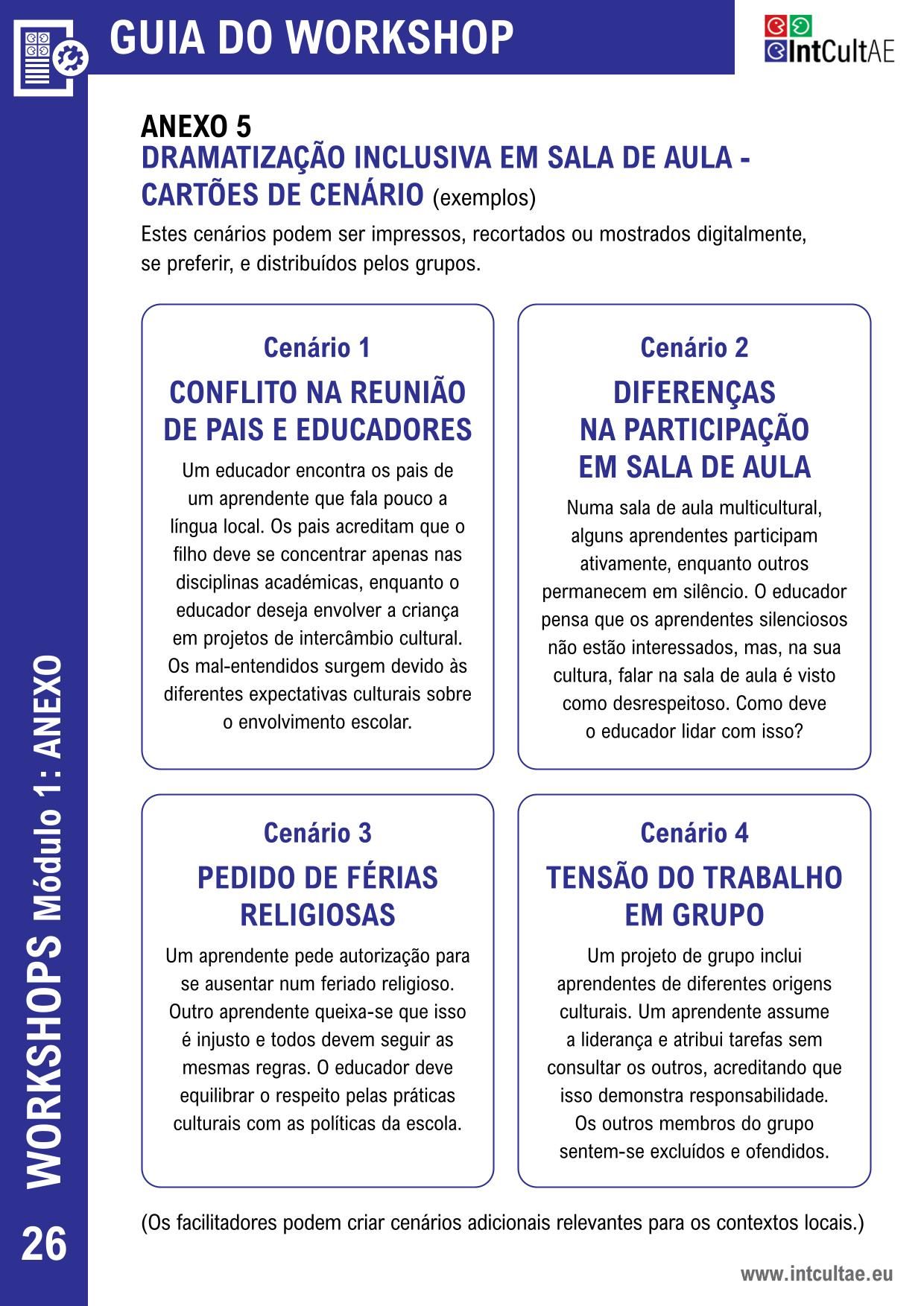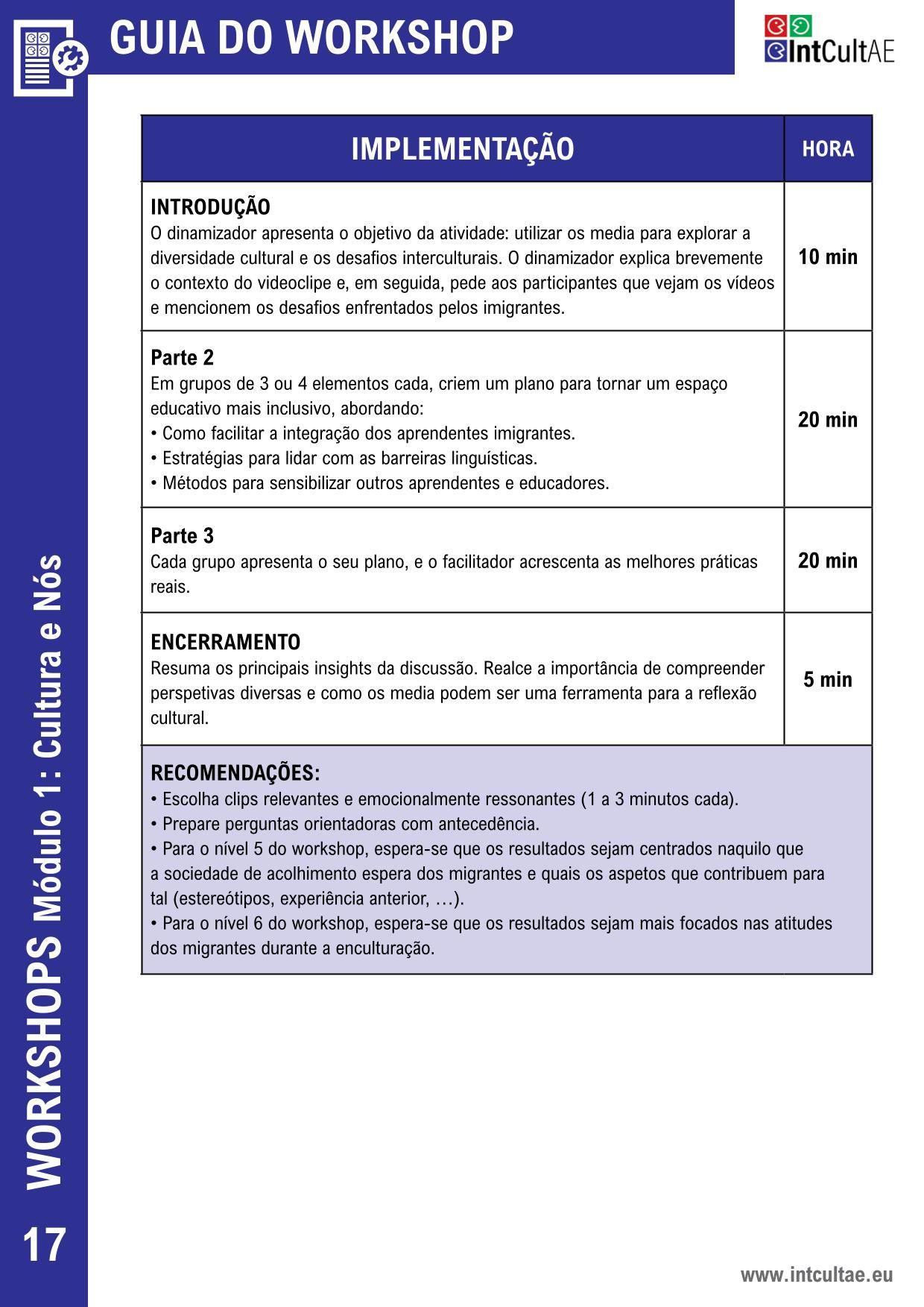 Destina-se a organizações e instituições de ensino interessadas em desenvolver os seus workshops sobre competências interculturais para educadores de adultos. Tem como objetivo aproveitar o potencial das atividades presenciais em grupo. Inclui orientações sobre implementação técnica e valoriza a oportunidade de praticar competências em cenários da vida real e discutir experiências em grupos focais.