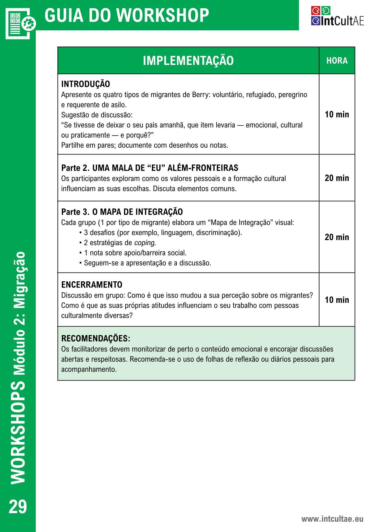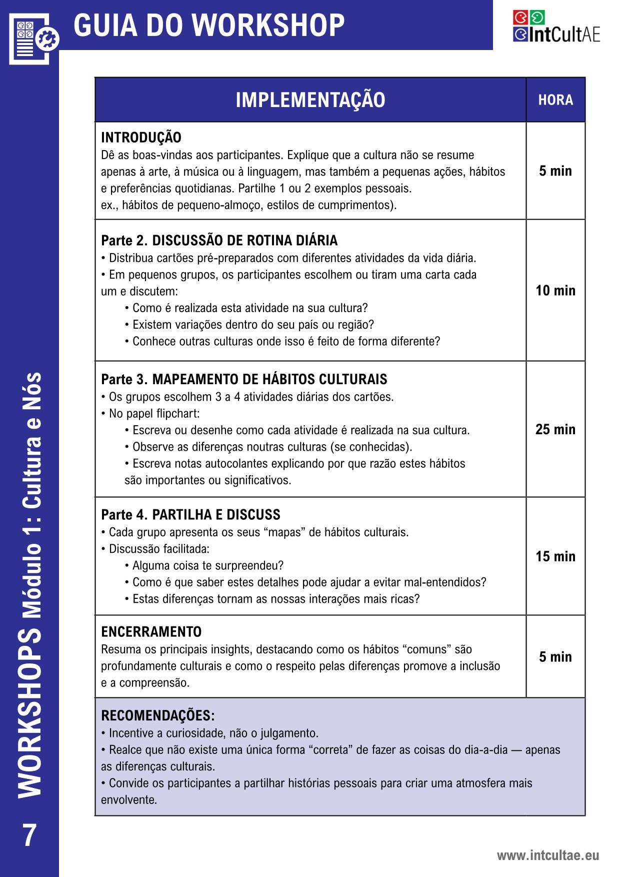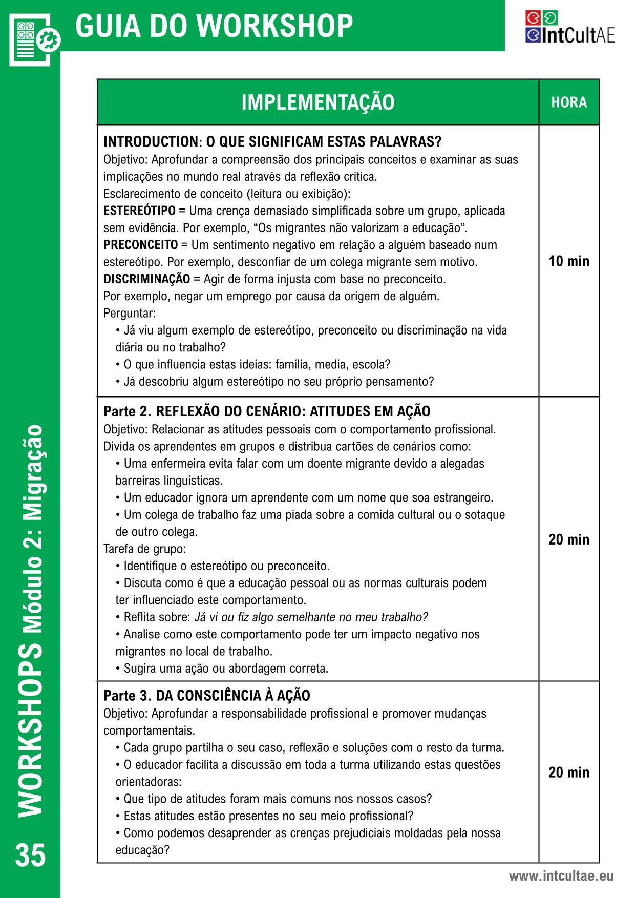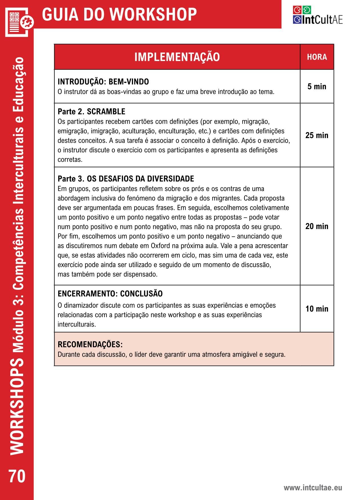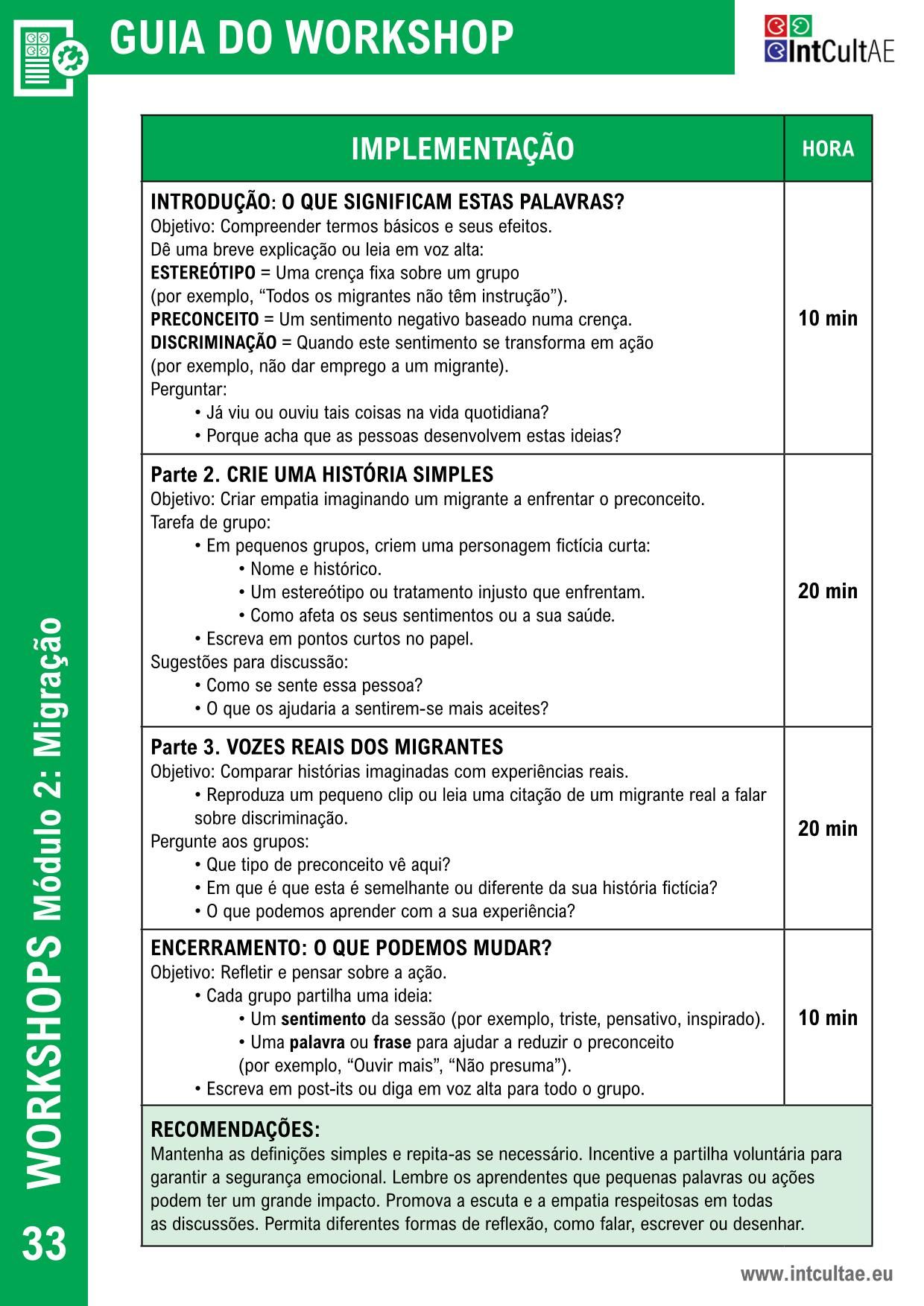Destina-se a organizações e instituições de ensino interessadas em desenvolver os seus workshops sobre competências interculturais para educadores de adultos. Tem como objetivo aproveitar o potencial das atividades presenciais em grupo. Inclui orientações sobre implementação técnica e valoriza a oportunidade de praticar competências em cenários da vida real e discutir experiências em grupos focais.