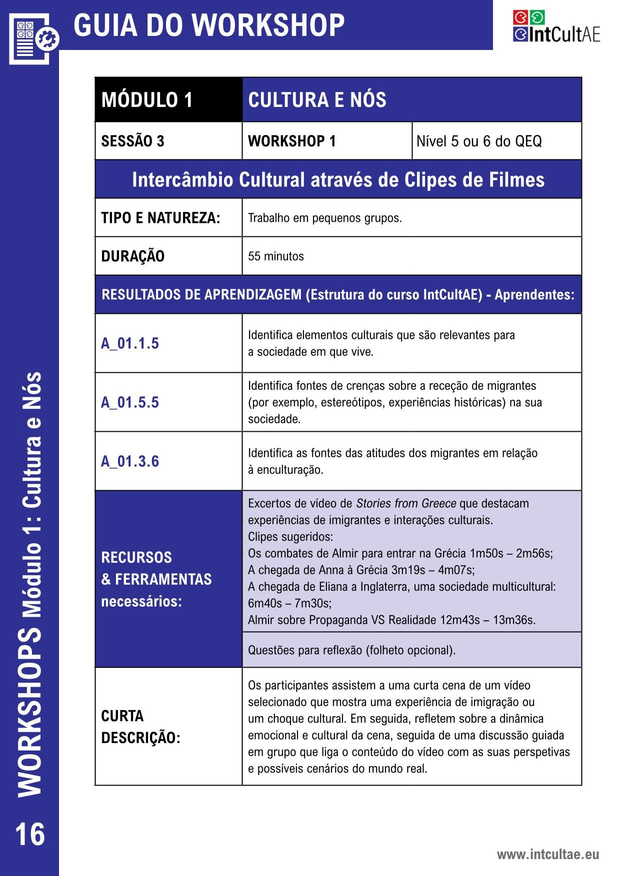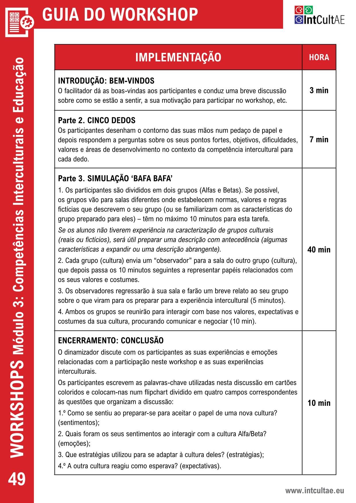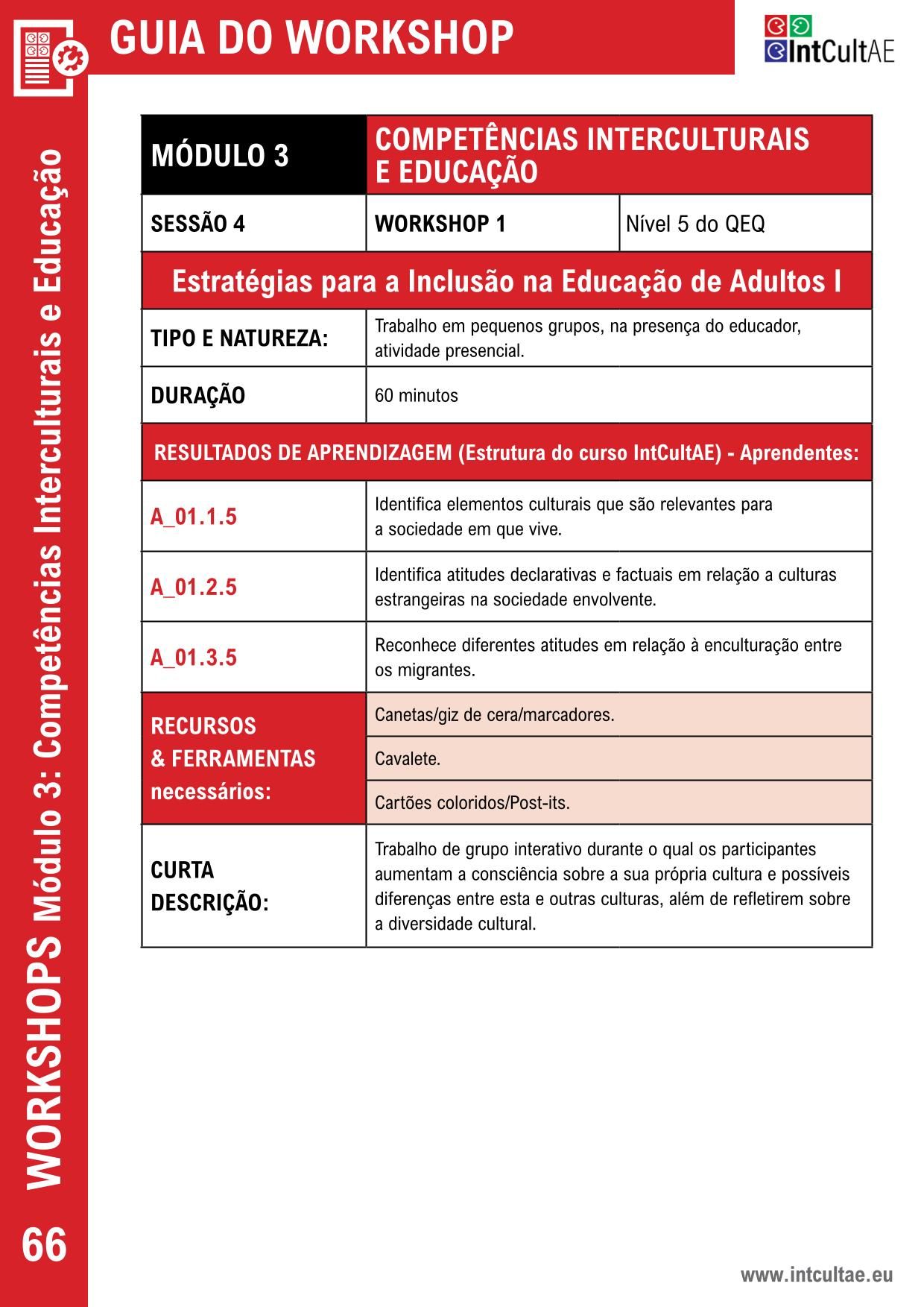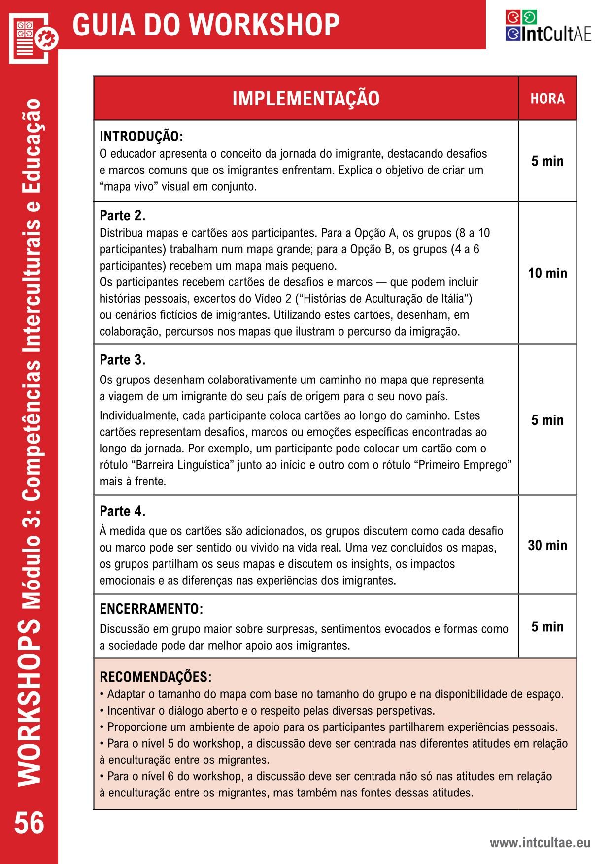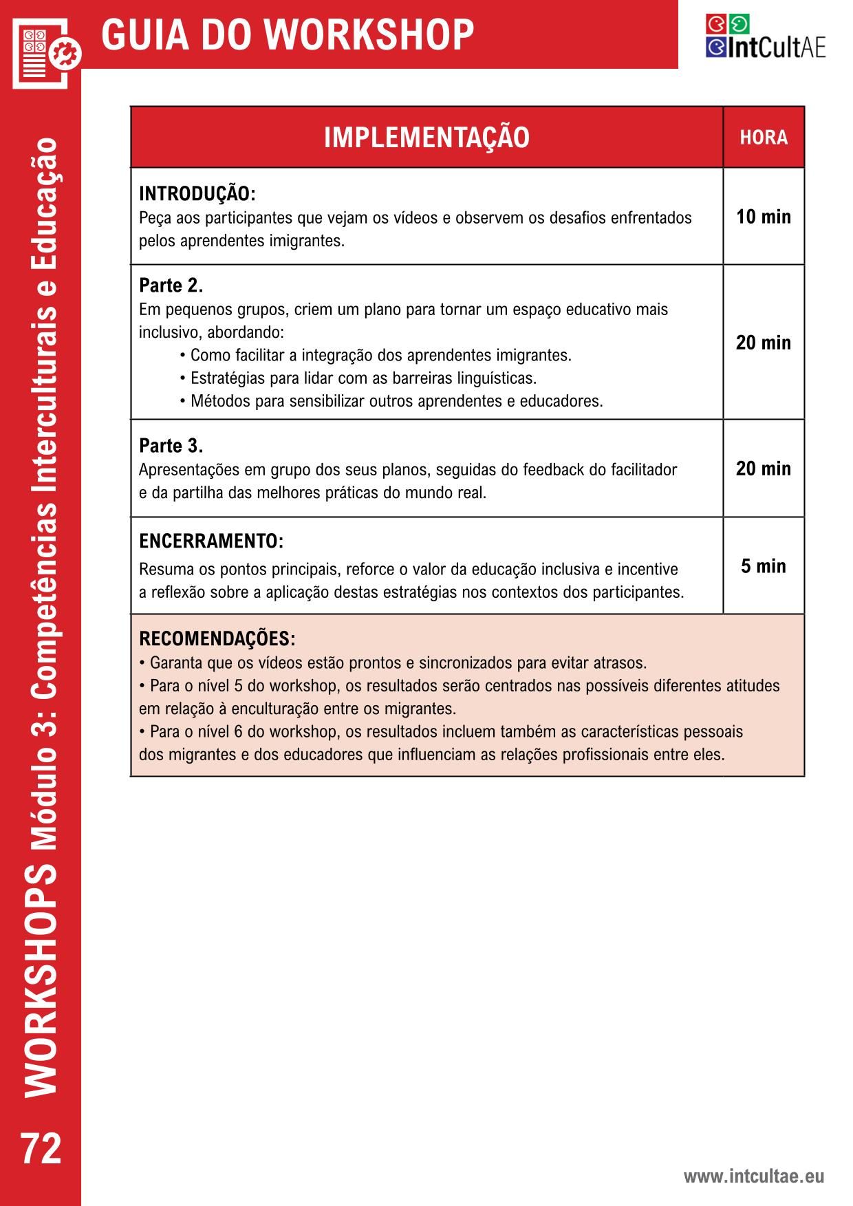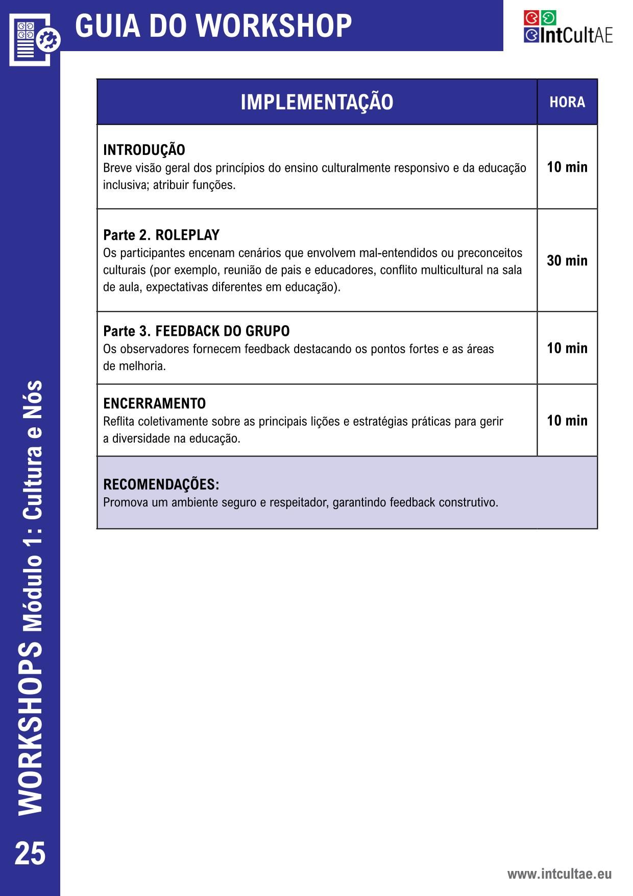 Destina-se a organizações e instituições de ensino interessadas em desenvolver os seus workshops sobre competências interculturais para educadores de adultos. Tem como objetivo aproveitar o potencial das atividades presenciais em grupo. Inclui orientações sobre implementação técnica e valoriza a oportunidade de praticar competências em cenários da vida real e discutir experiências em grupos focais.