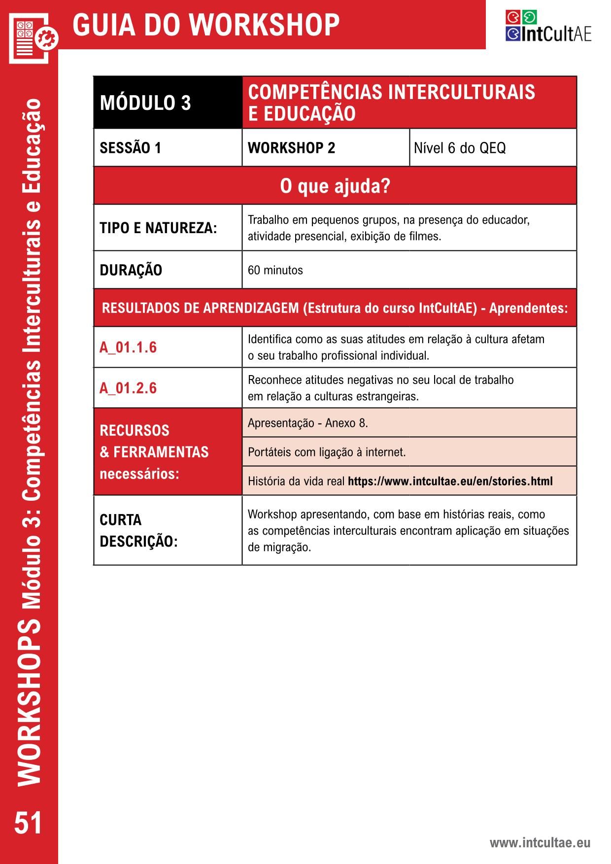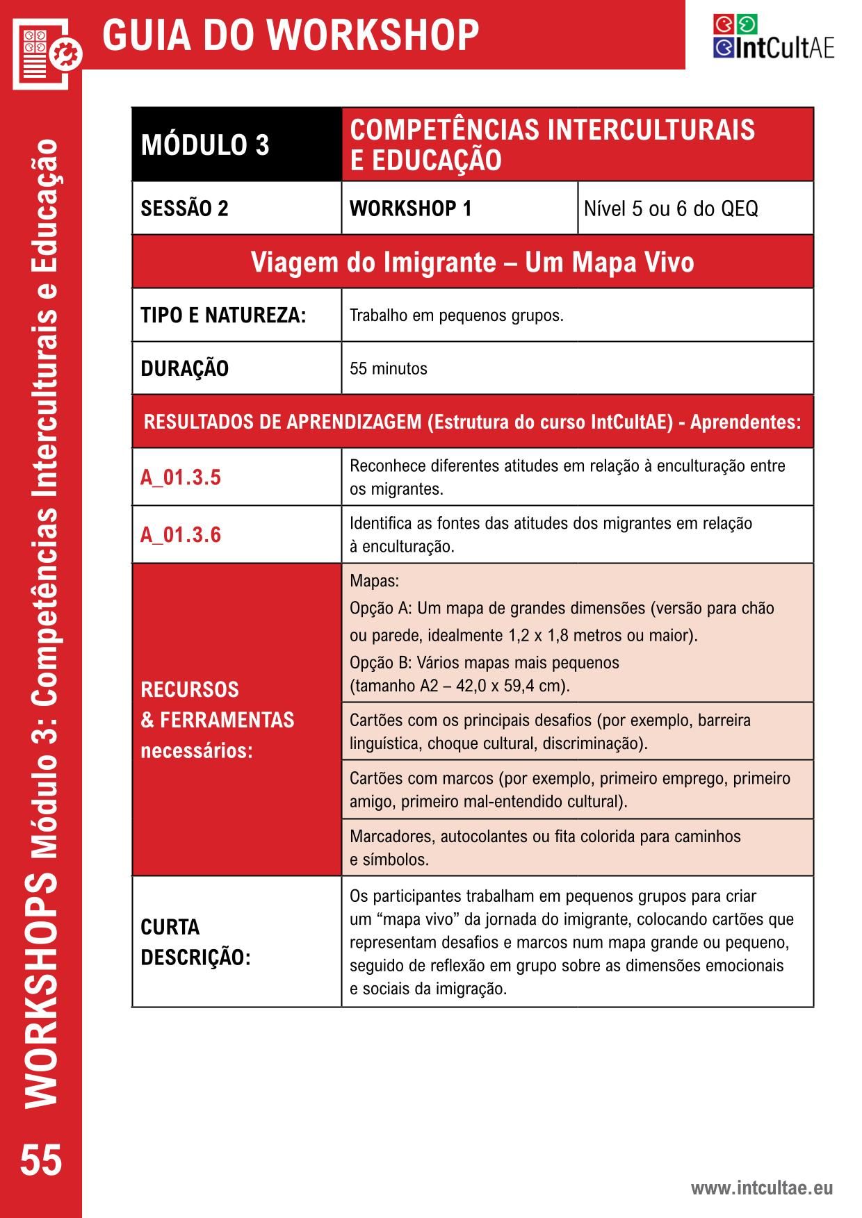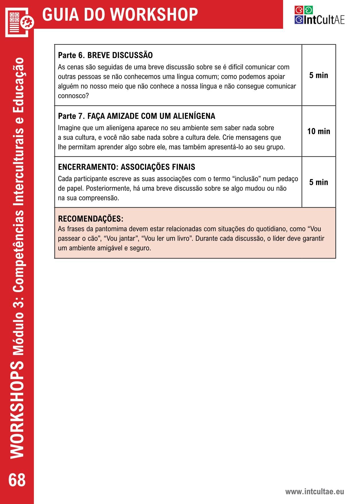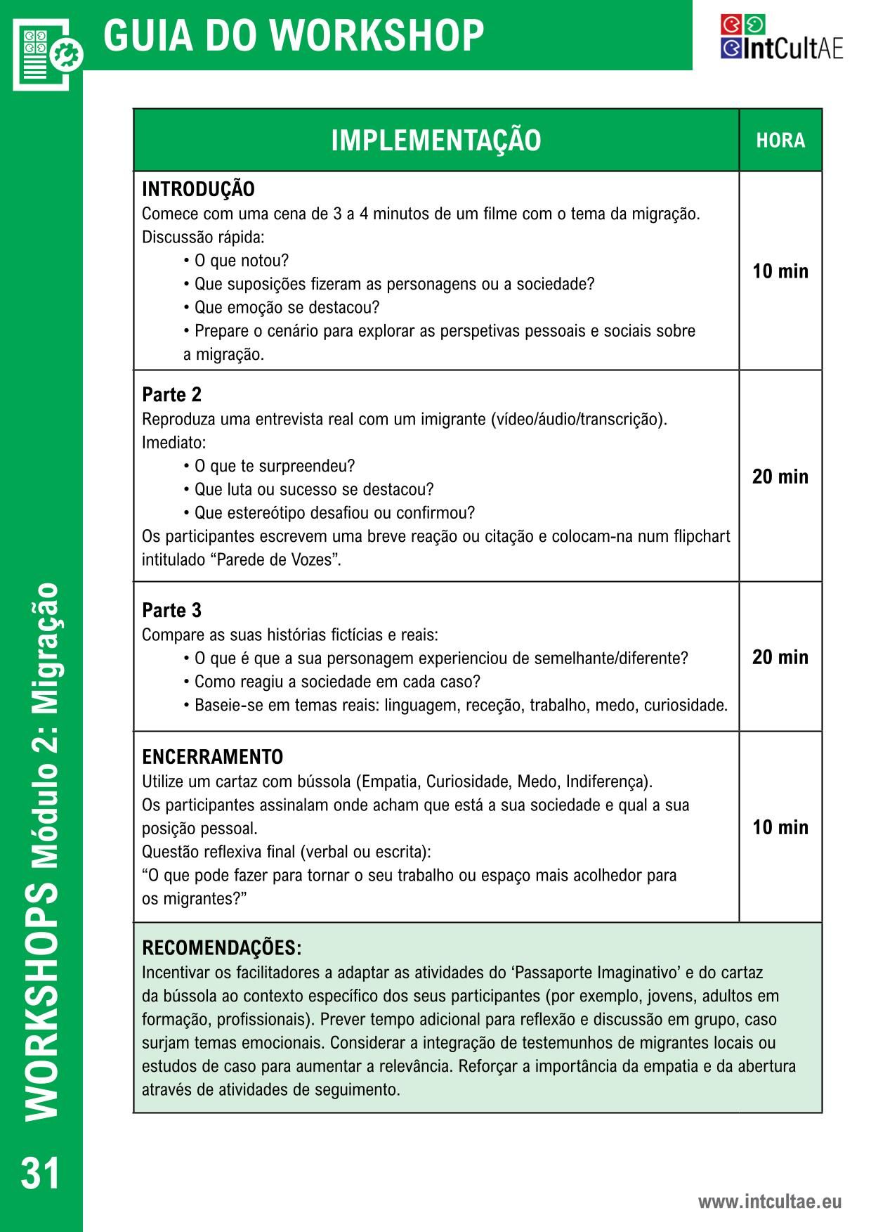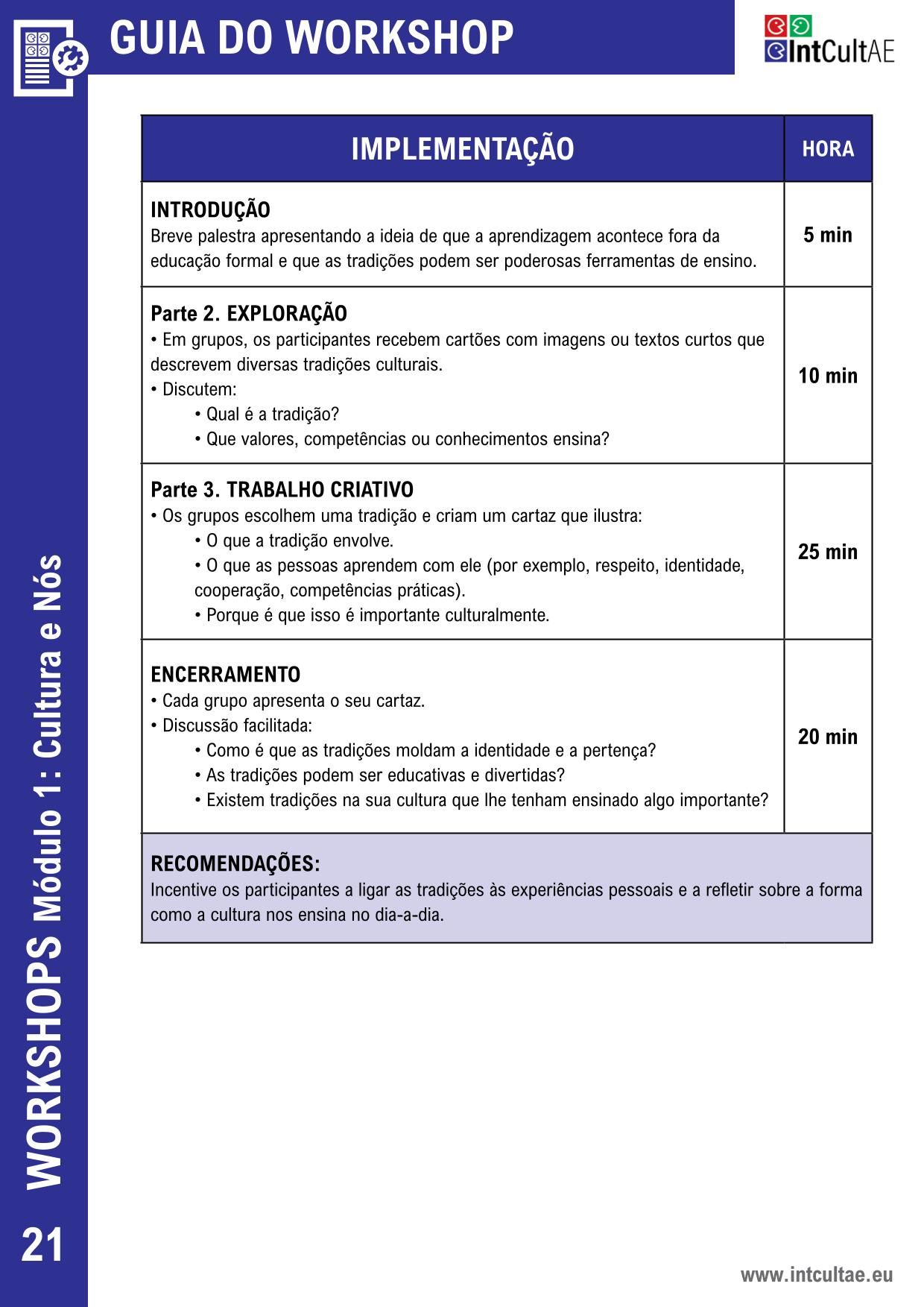 Destina-se a organizações e instituições de ensino interessadas em desenvolver os seus workshops sobre competências interculturais para educadores de adultos. Tem como objetivo aproveitar o potencial das atividades presenciais em grupo. Inclui orientações sobre implementação técnica e valoriza a oportunidade de praticar competências em cenários da vida real e discutir experiências em grupos focais.