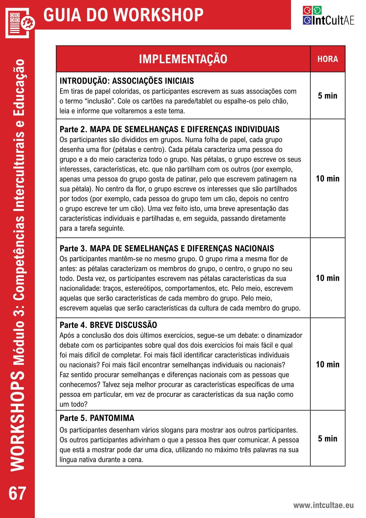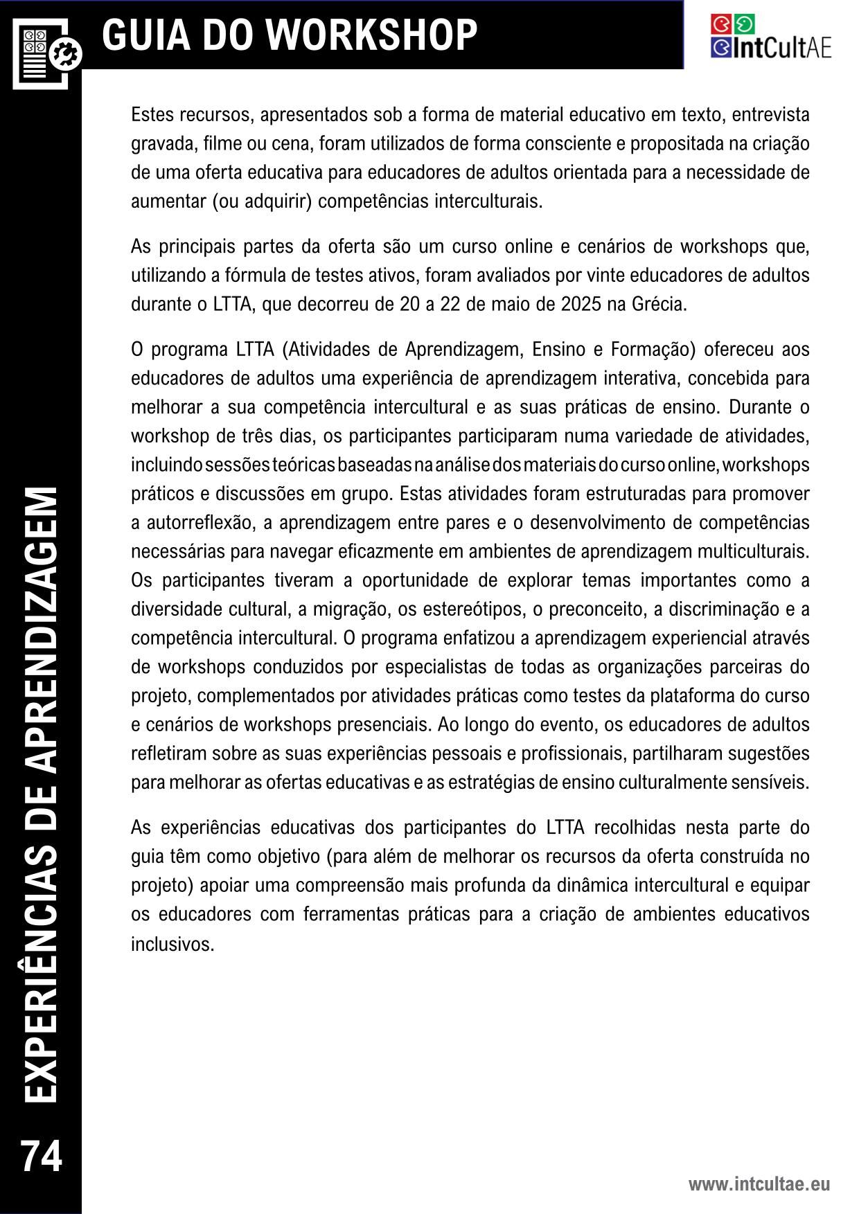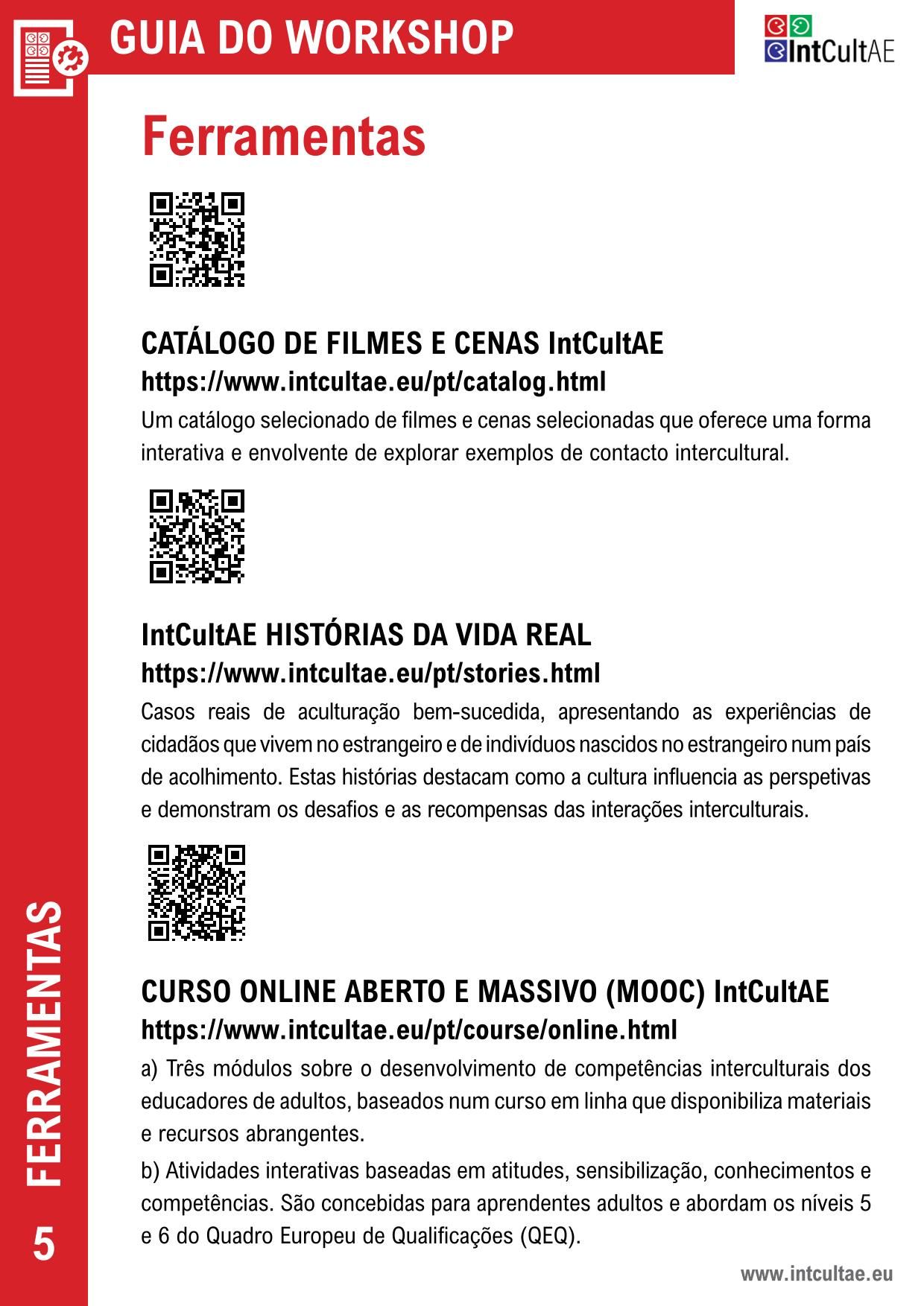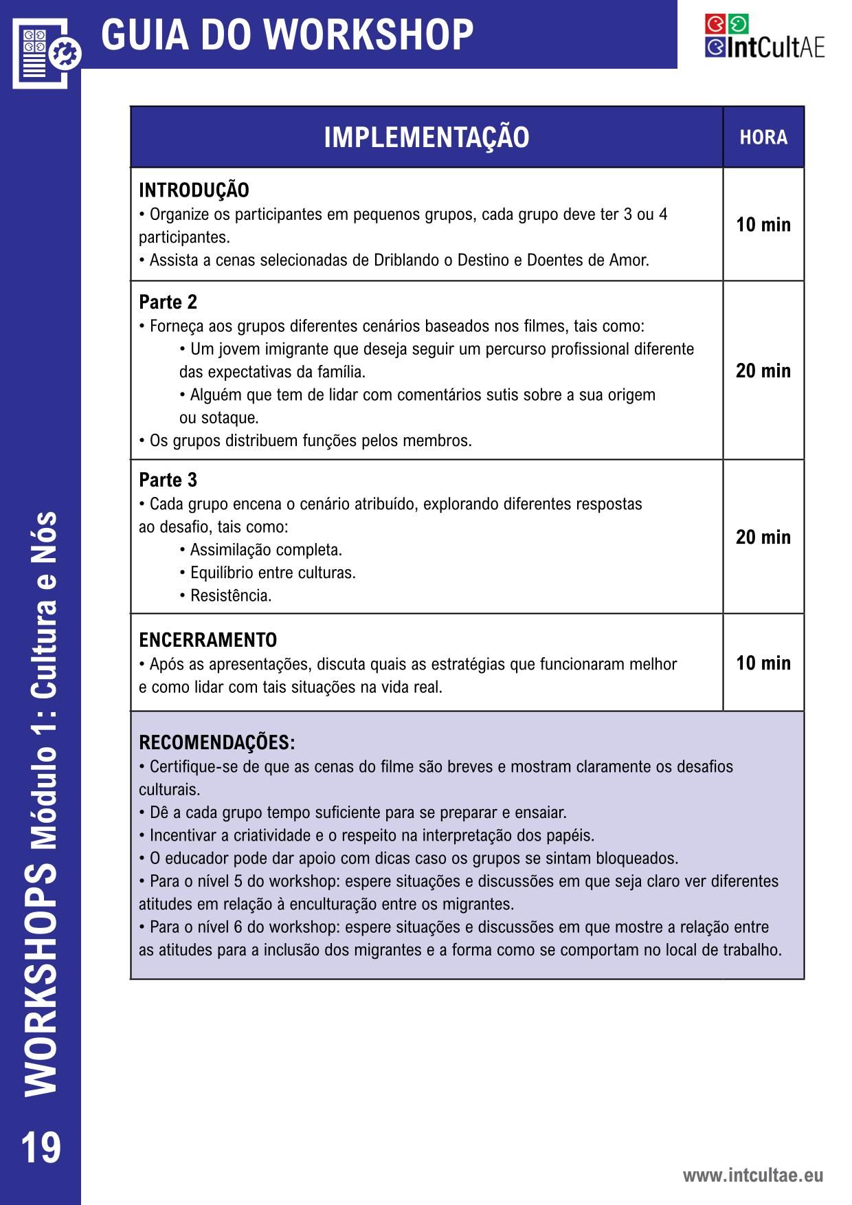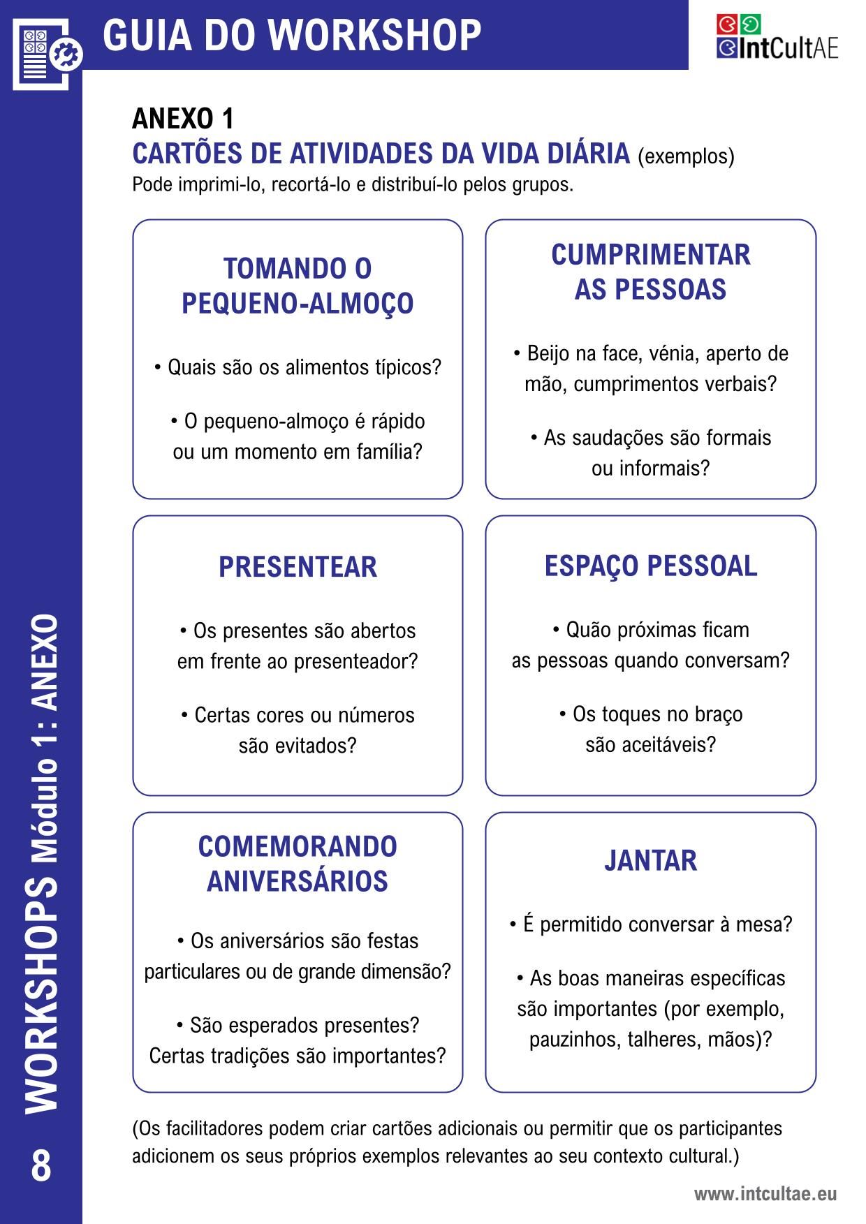Destina-se a organizações e instituições de ensino interessadas em desenvolver os seus workshops sobre competências interculturais para educadores de adultos. Tem como objetivo aproveitar o potencial das atividades presenciais em grupo. Inclui orientações sobre implementação técnica e valoriza a oportunidade de praticar competências em cenários da vida real e discutir experiências em grupos focais.
