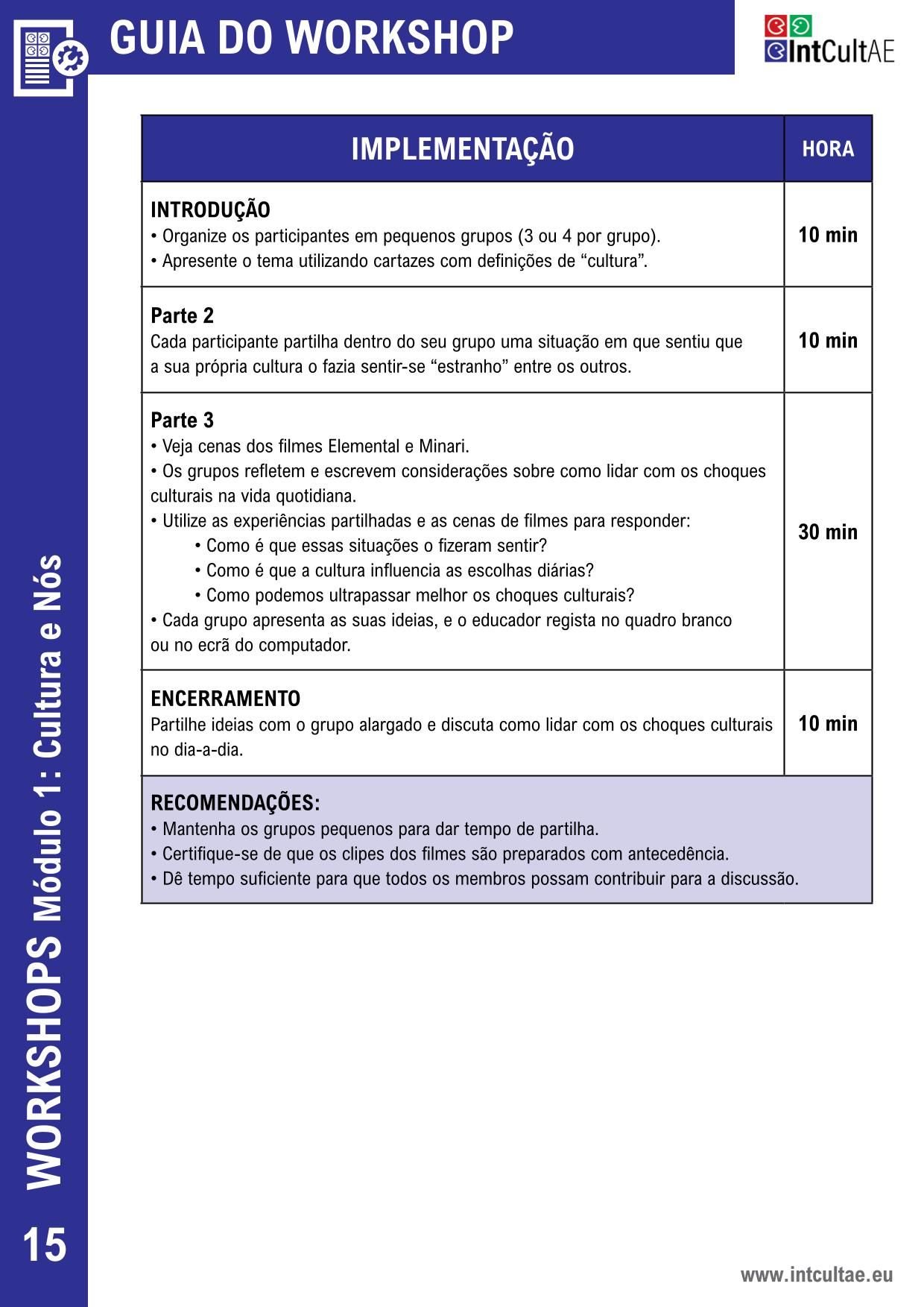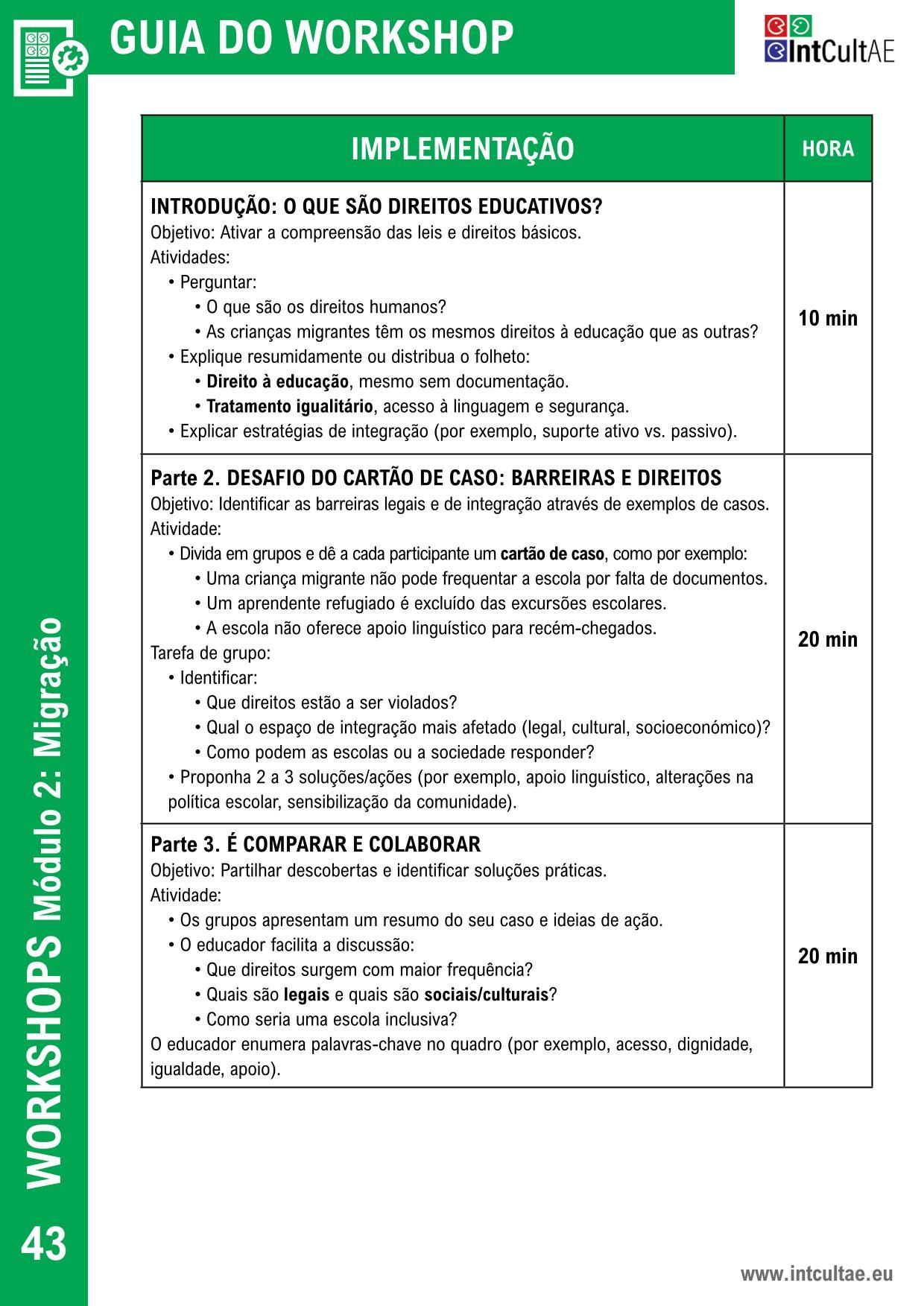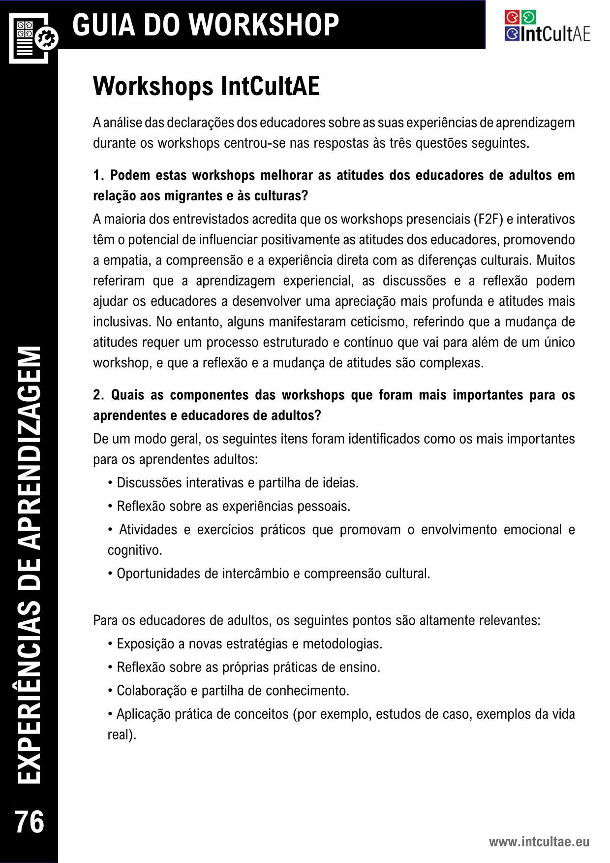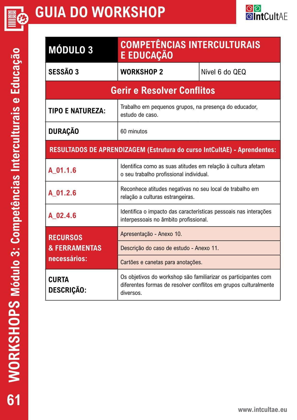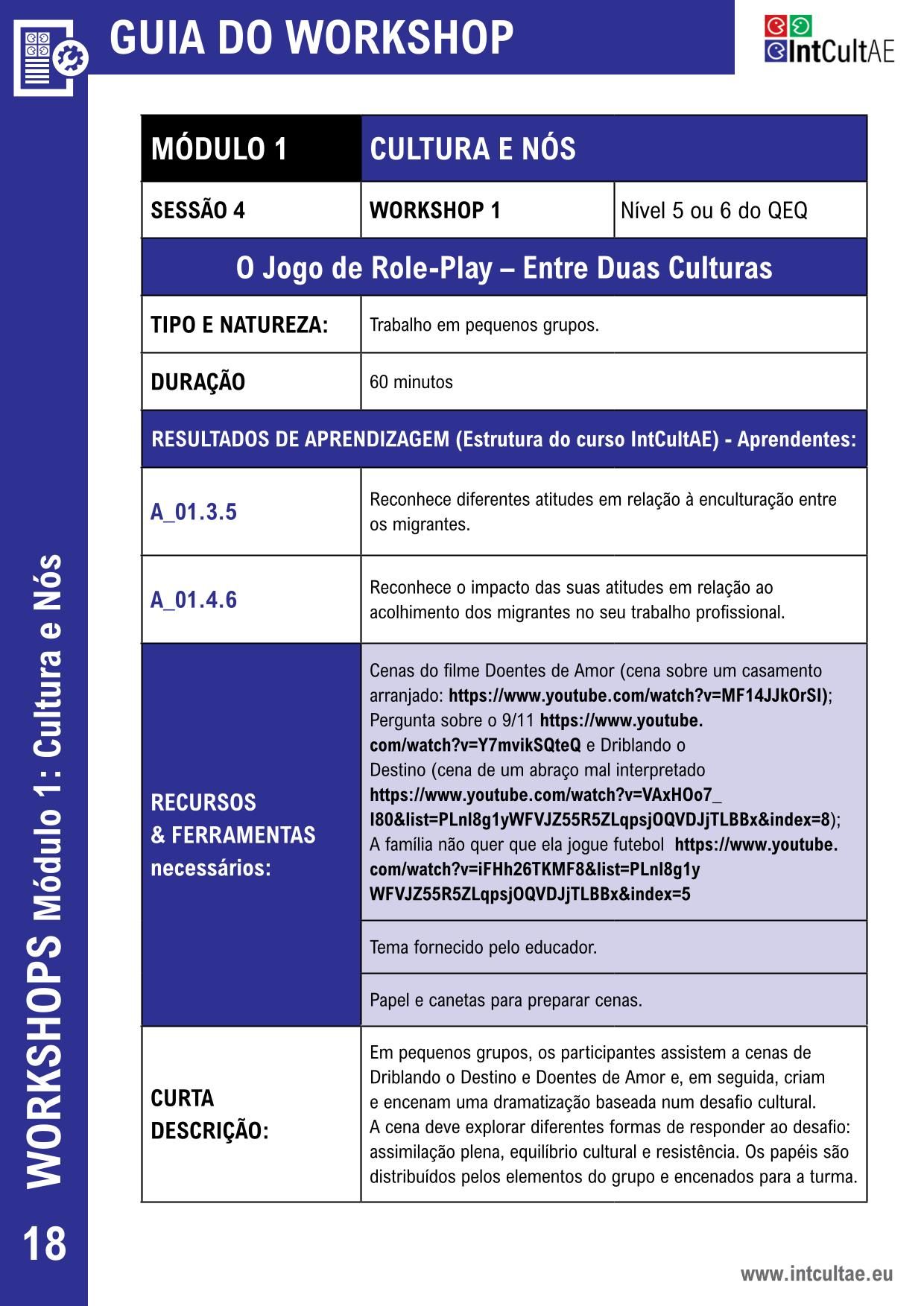 Destina-se a organizações e instituições de ensino interessadas em desenvolver os seus workshops sobre competências interculturais para educadores de adultos. Tem como objetivo aproveitar o potencial das atividades presenciais em grupo. Inclui orientações sobre implementação técnica e valoriza a oportunidade de praticar competências em cenários da vida real e discutir experiências em grupos focais.