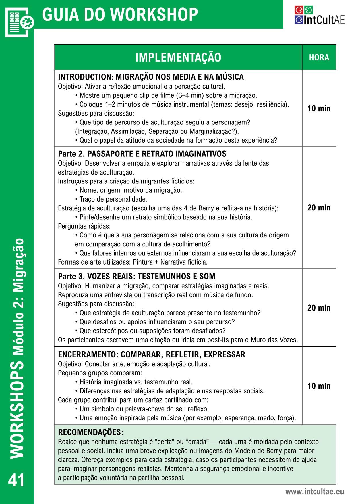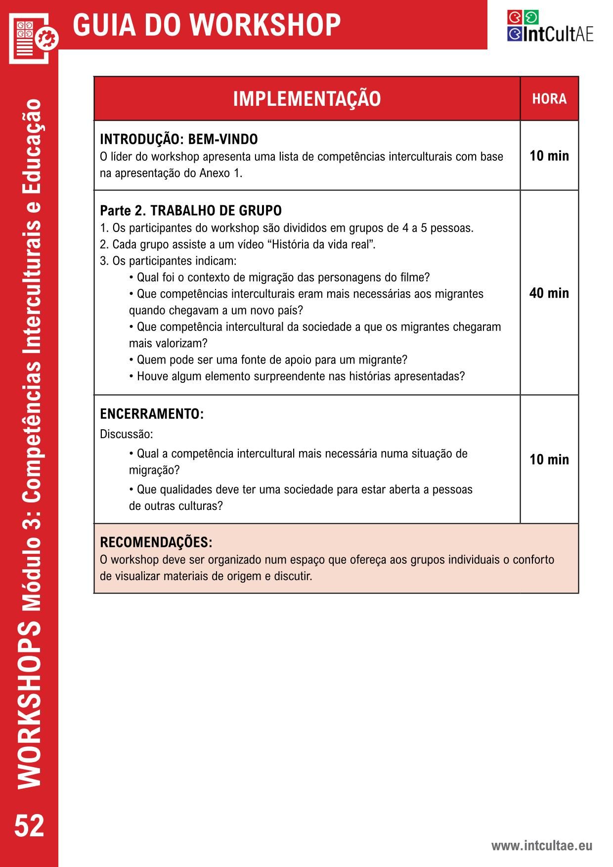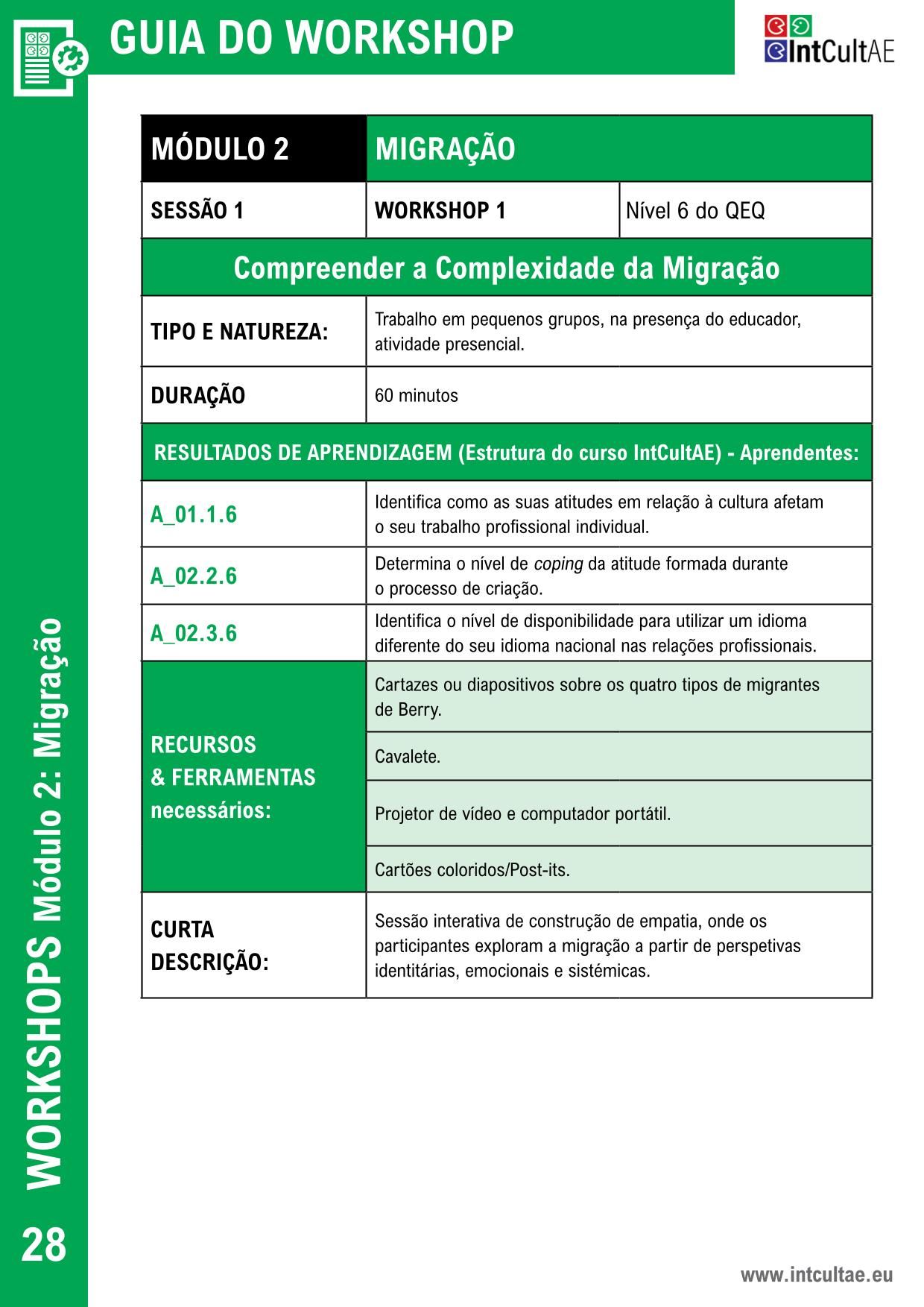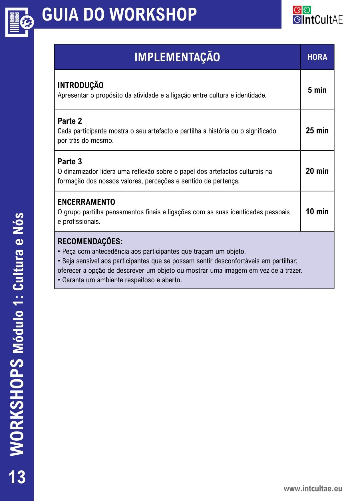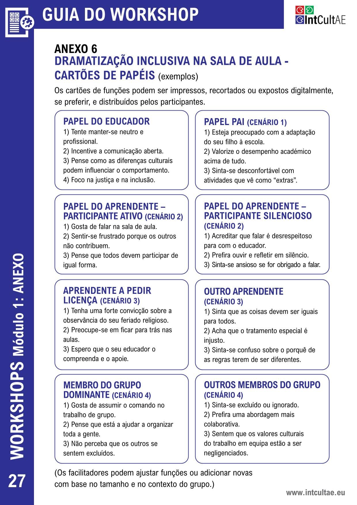 Destina-se a organizações e instituições de ensino interessadas em desenvolver os seus workshops sobre competências interculturais para educadores de adultos. Tem como objetivo aproveitar o potencial das atividades presenciais em grupo. Inclui orientações sobre implementação técnica e valoriza a oportunidade de praticar competências em cenários da vida real e discutir experiências em grupos focais.