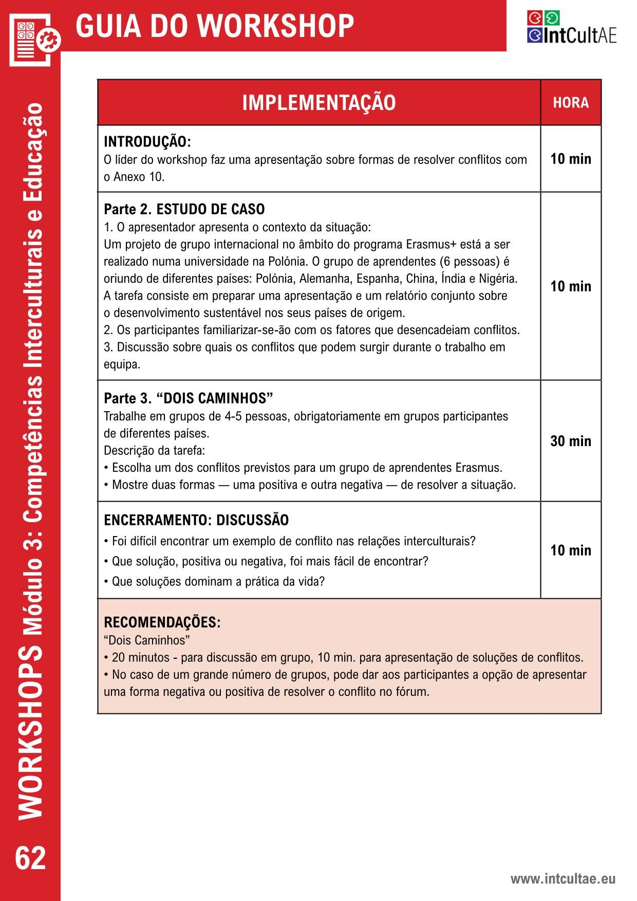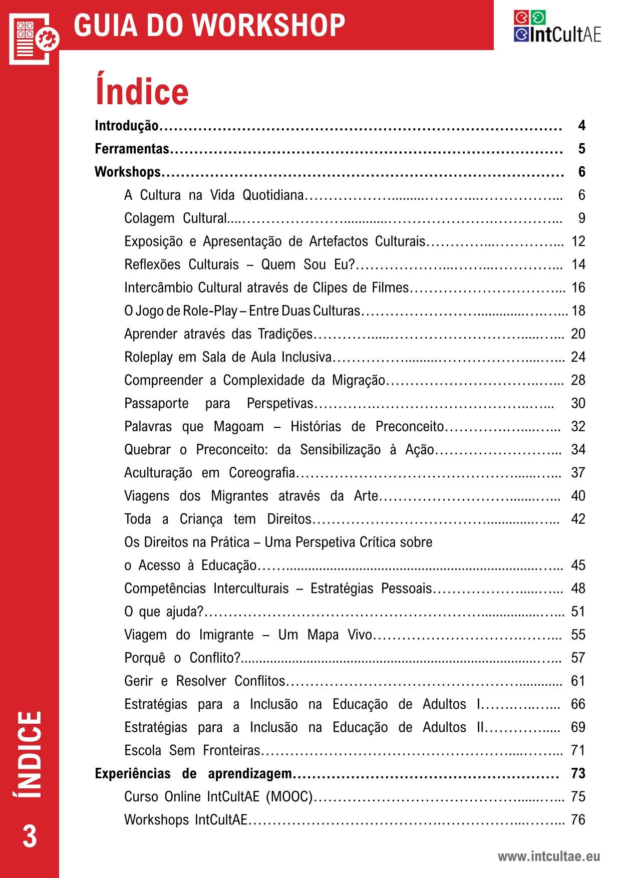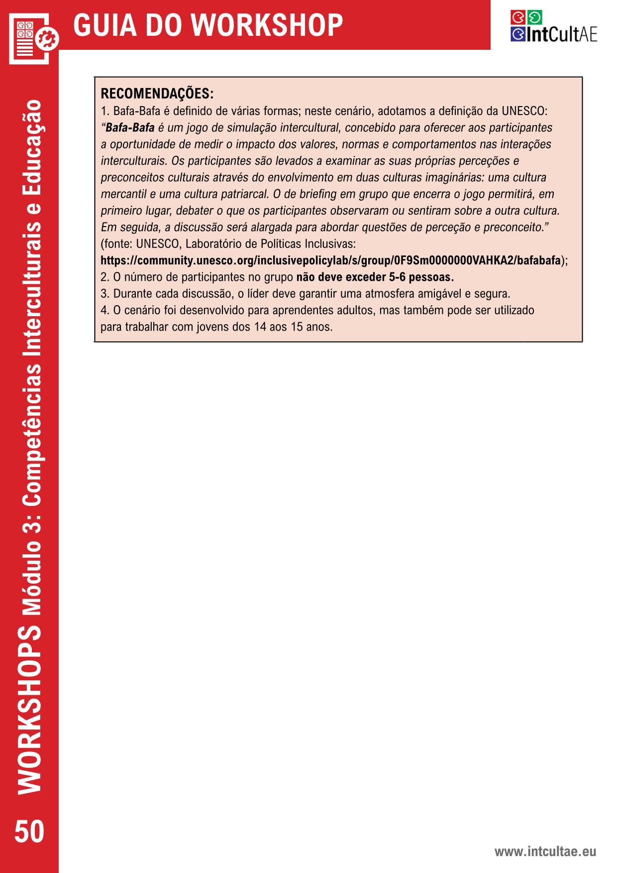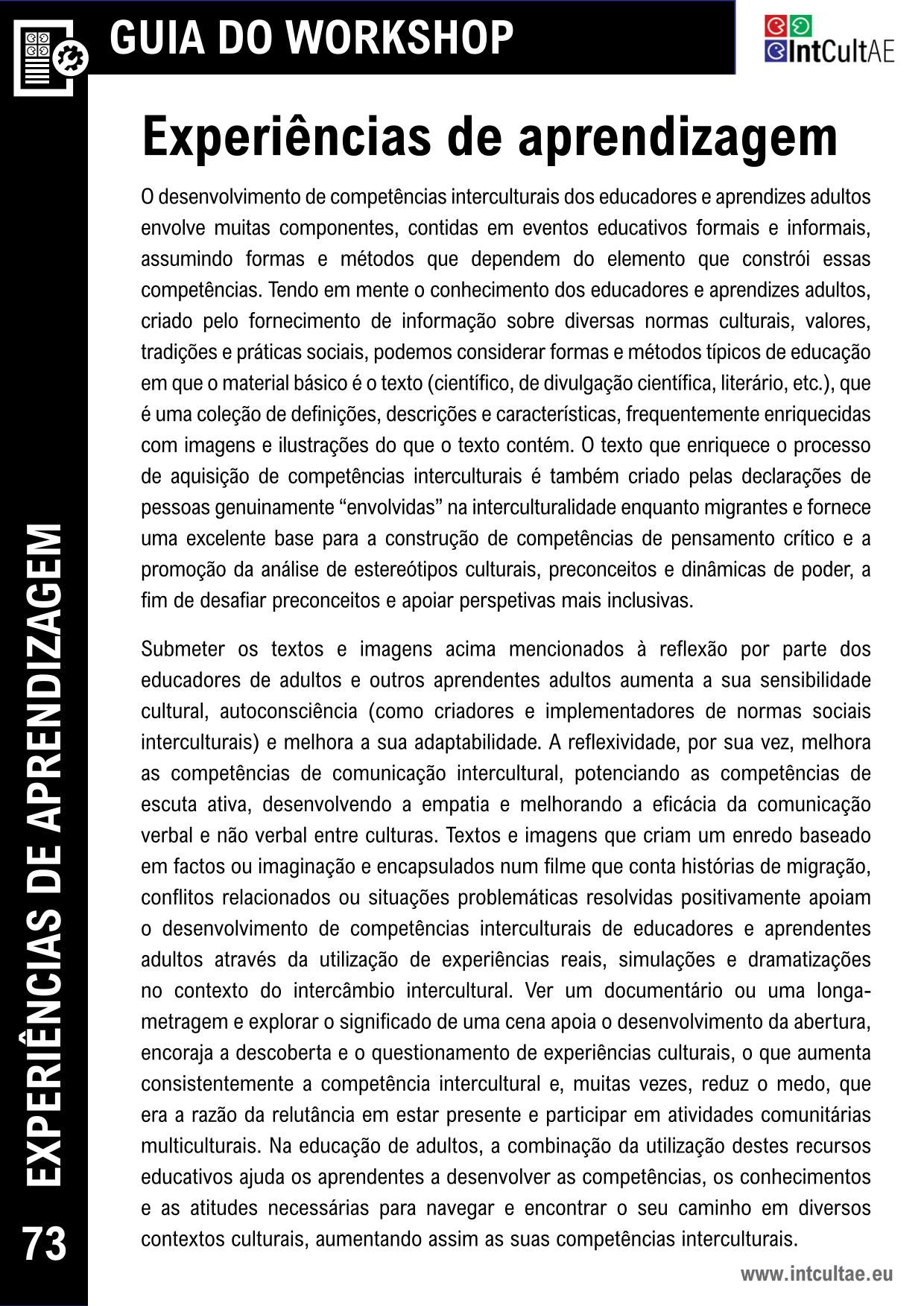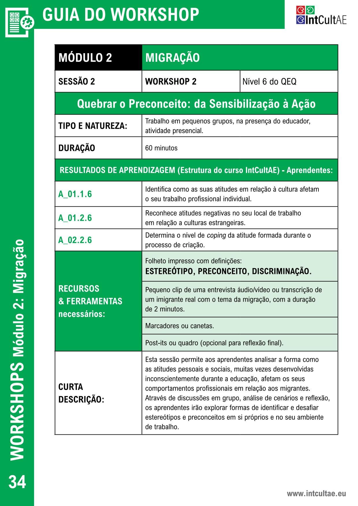 Destina-se a organizações e instituições de ensino interessadas em desenvolver os seus workshops sobre competências interculturais para educadores de adultos. Tem como objetivo aproveitar o potencial das atividades presenciais em grupo. Inclui orientações sobre implementação técnica e valoriza a oportunidade de praticar competências em cenários da vida real e discutir experiências em grupos focais.