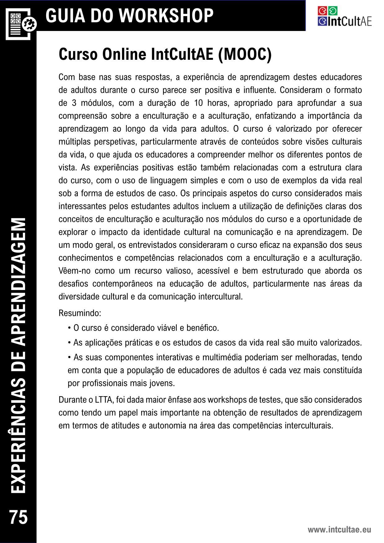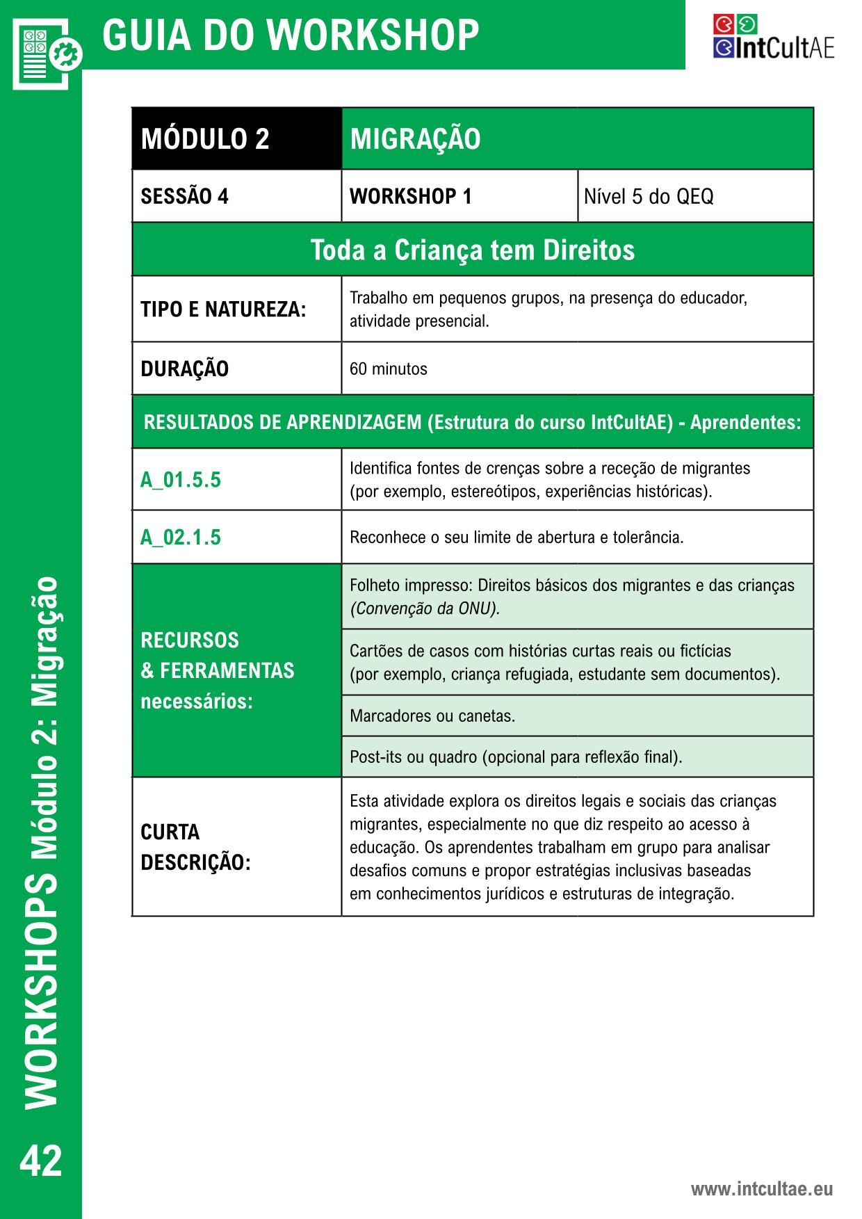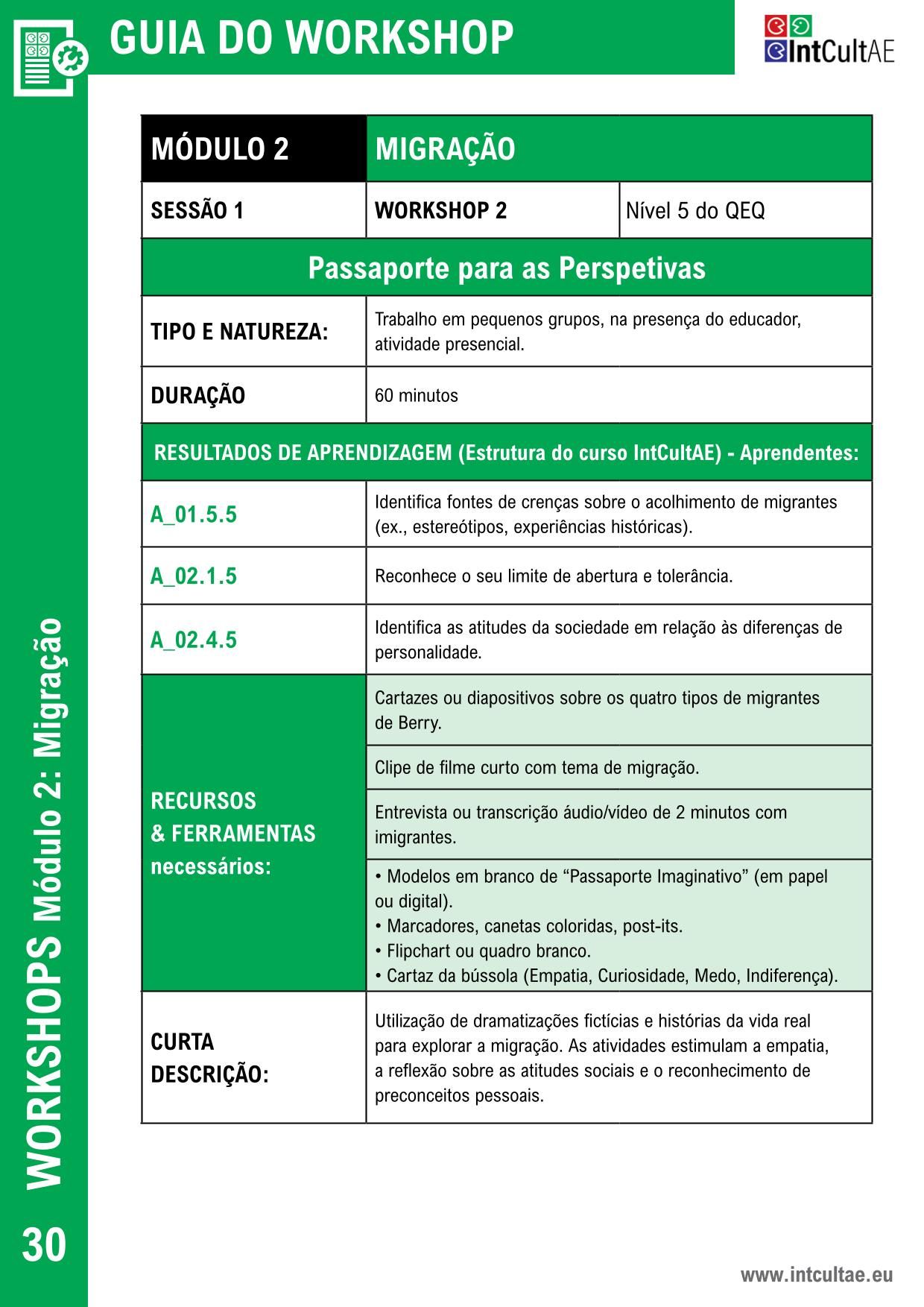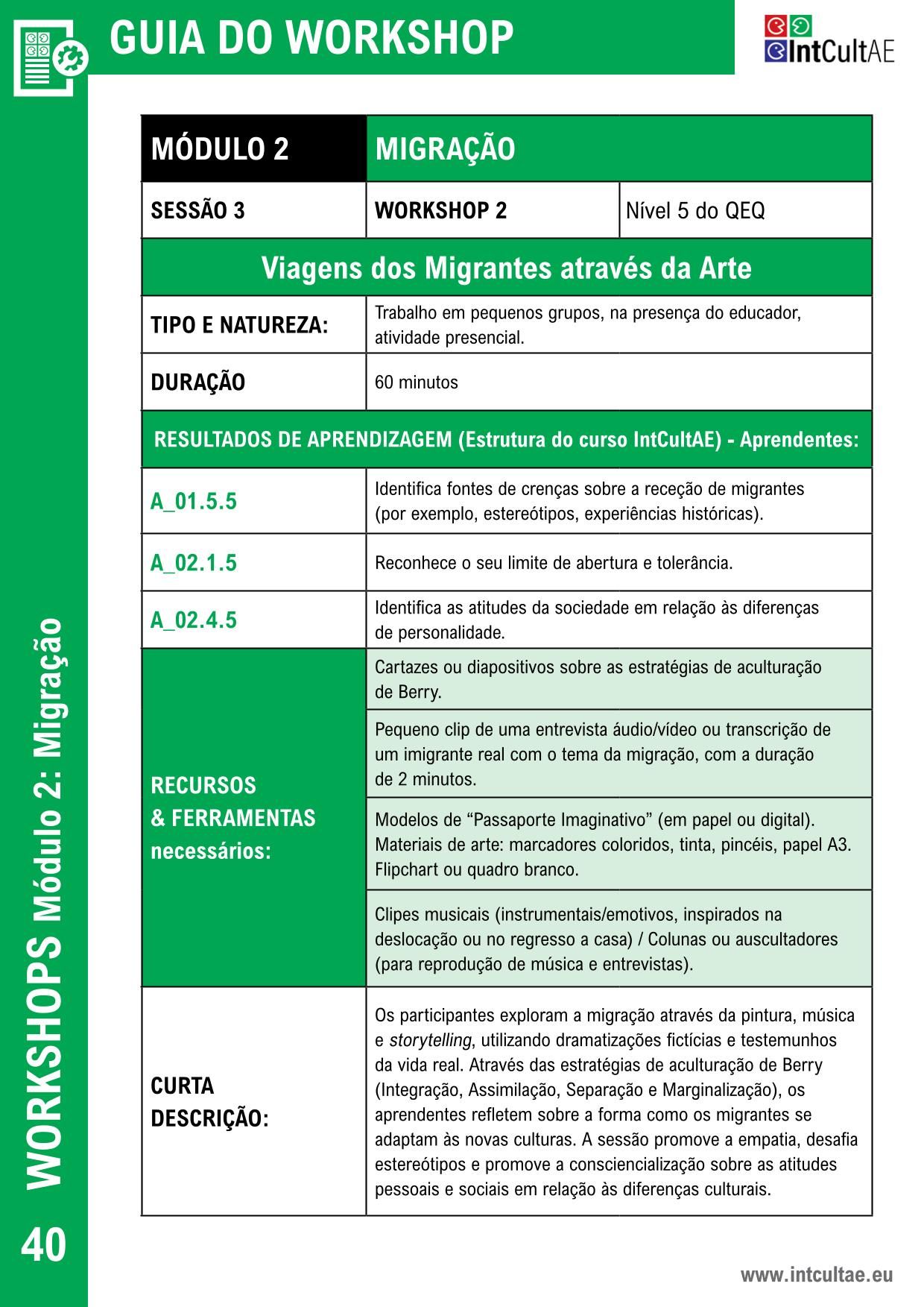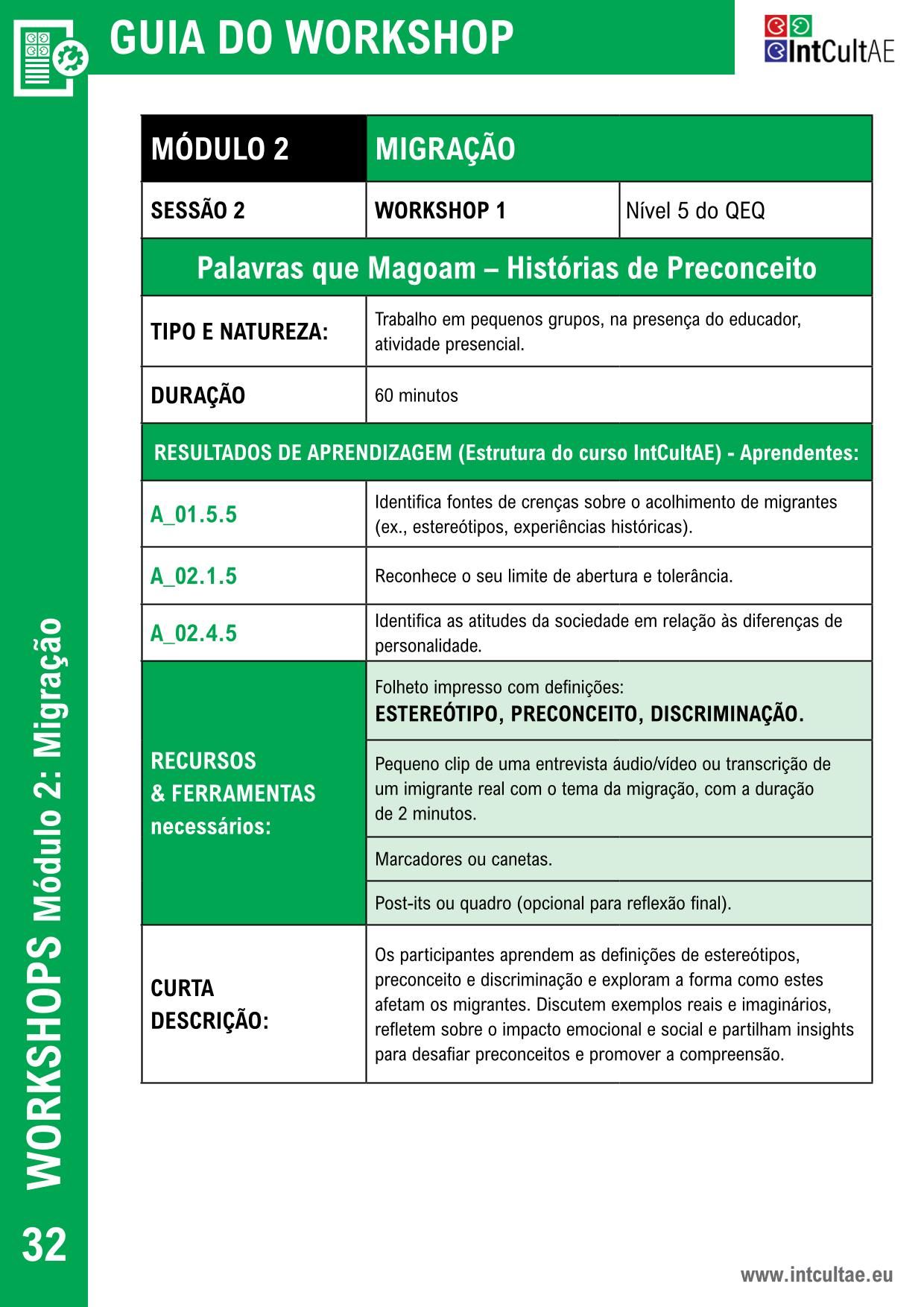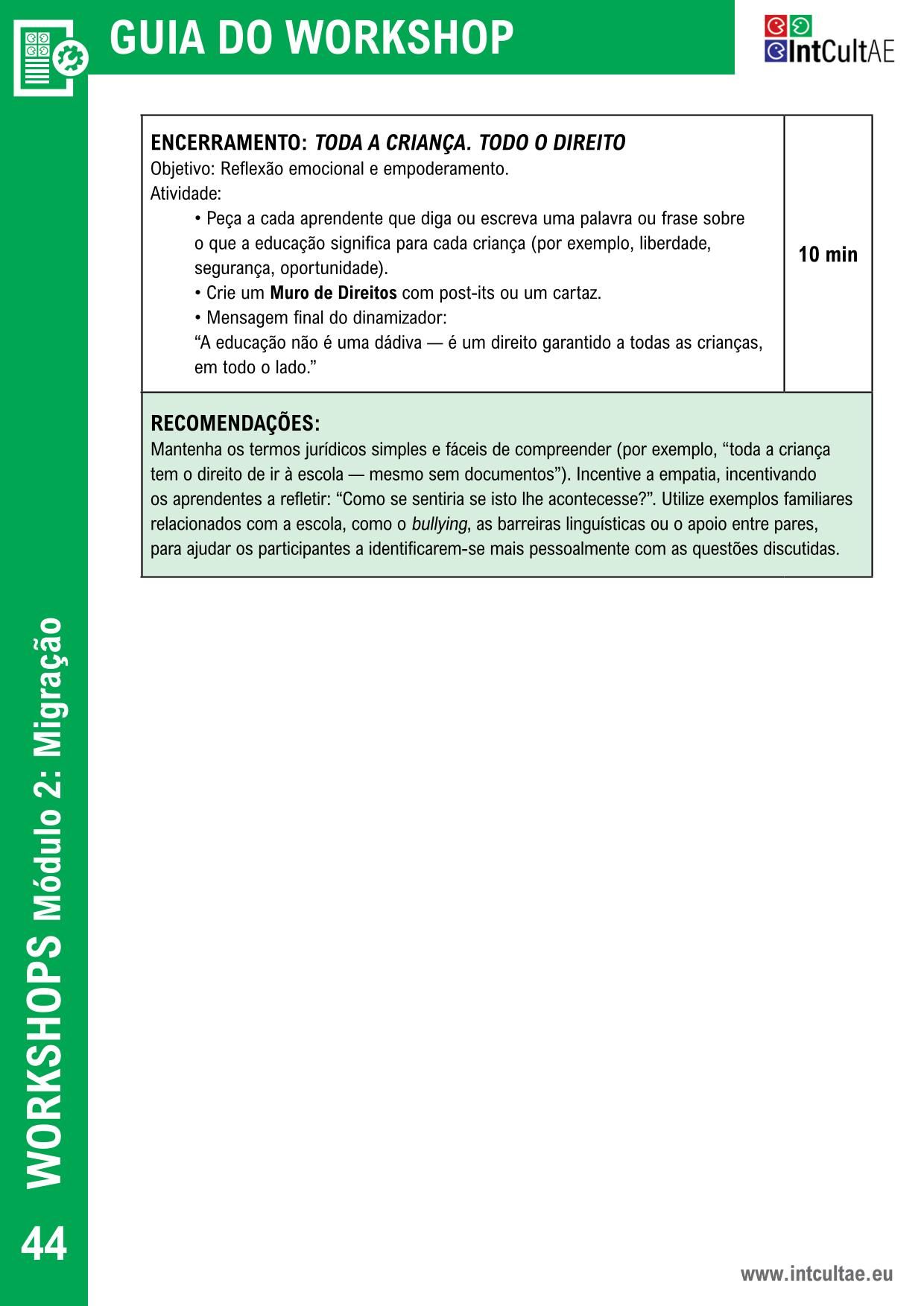 Destina-se a organizações e instituições de ensino interessadas em desenvolver os seus workshops sobre competências interculturais para educadores de adultos. Tem como objetivo aproveitar o potencial das atividades presenciais em grupo. Inclui orientações sobre implementação técnica e valoriza a oportunidade de praticar competências em cenários da vida real e discutir experiências em grupos focais.