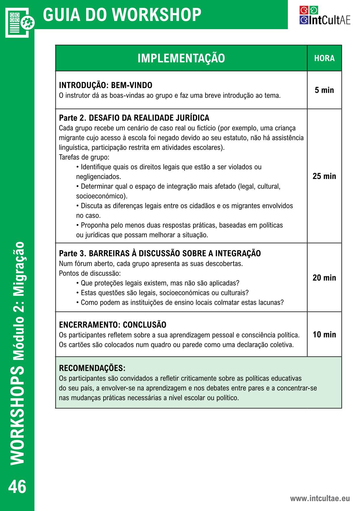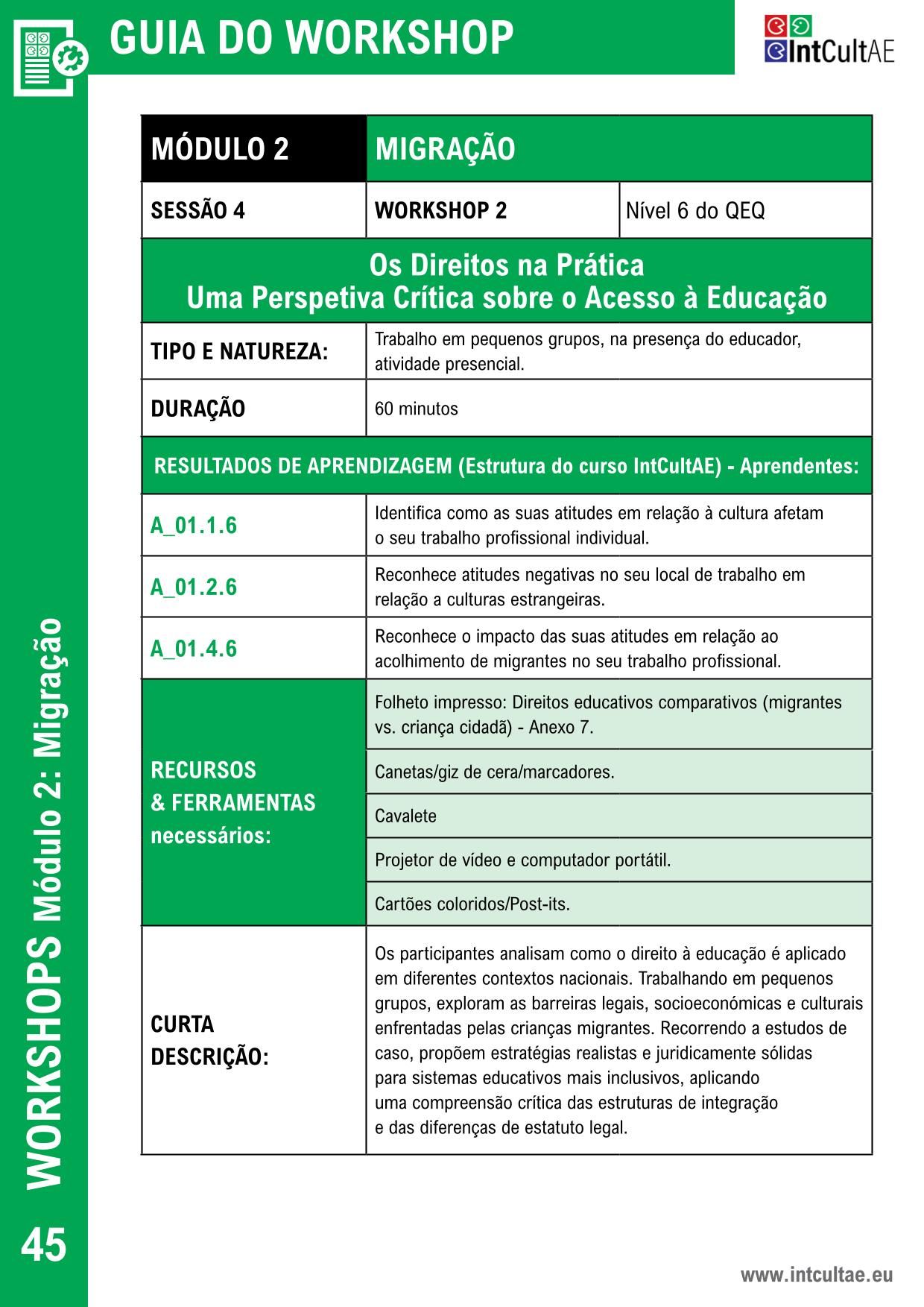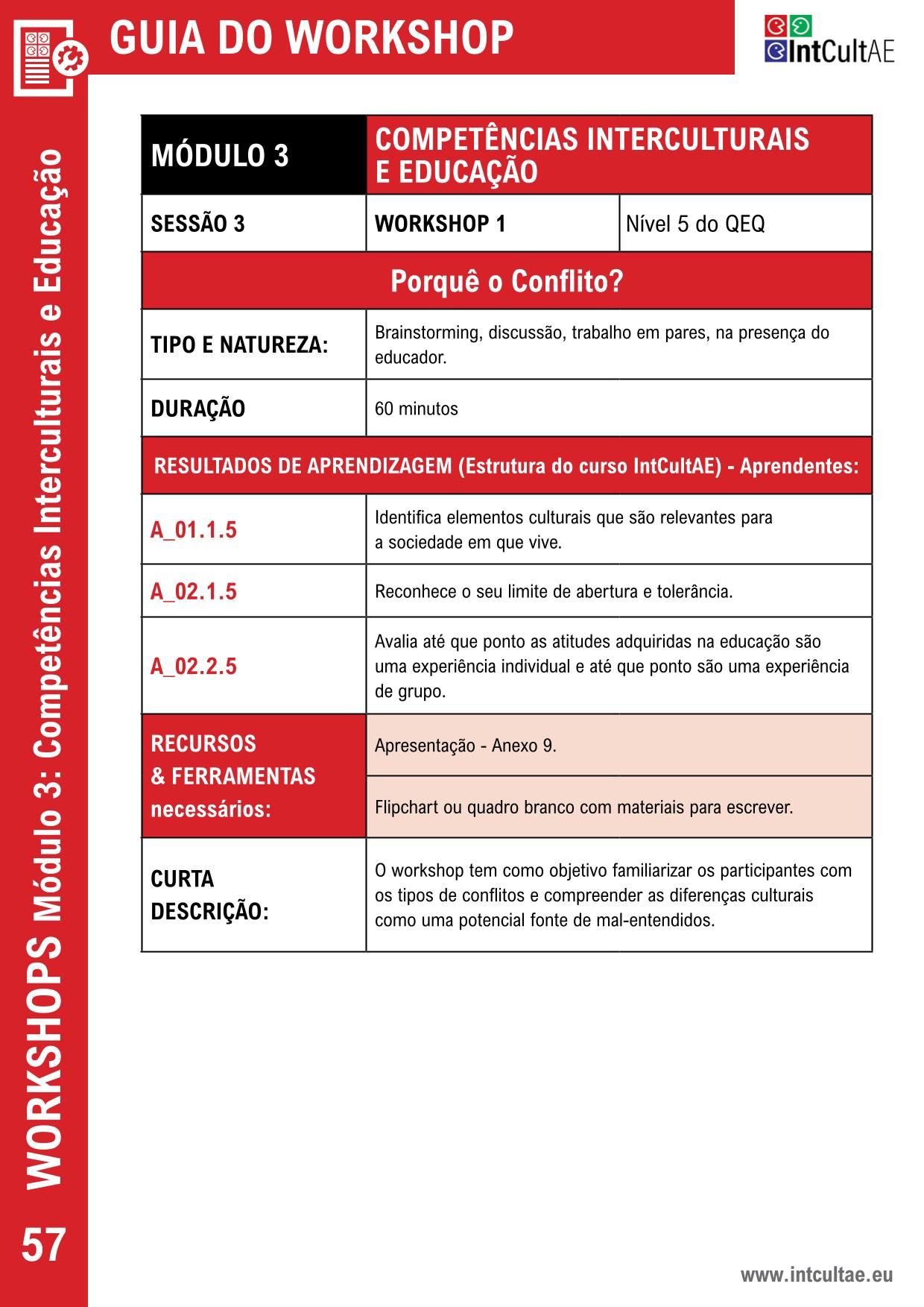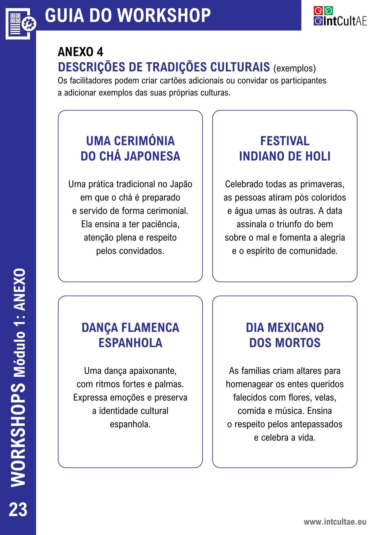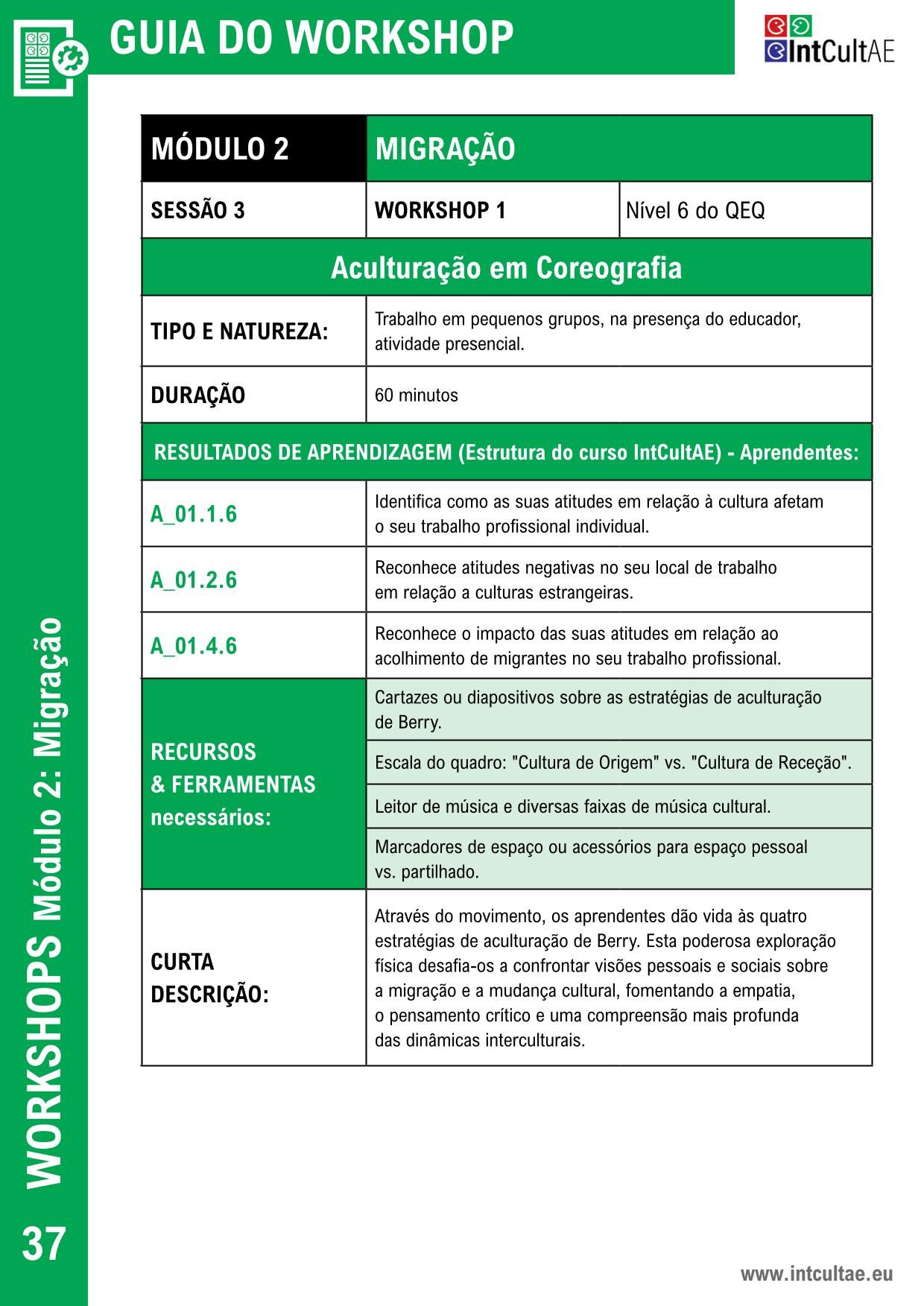 Destina-se a organizações e instituições de ensino interessadas em desenvolver os seus workshops sobre competências interculturais para educadores de adultos. Tem como objetivo aproveitar o potencial das atividades presenciais em grupo. Inclui orientações sobre implementação técnica e valoriza a oportunidade de praticar competências em cenários da vida real e discutir experiências em grupos focais.