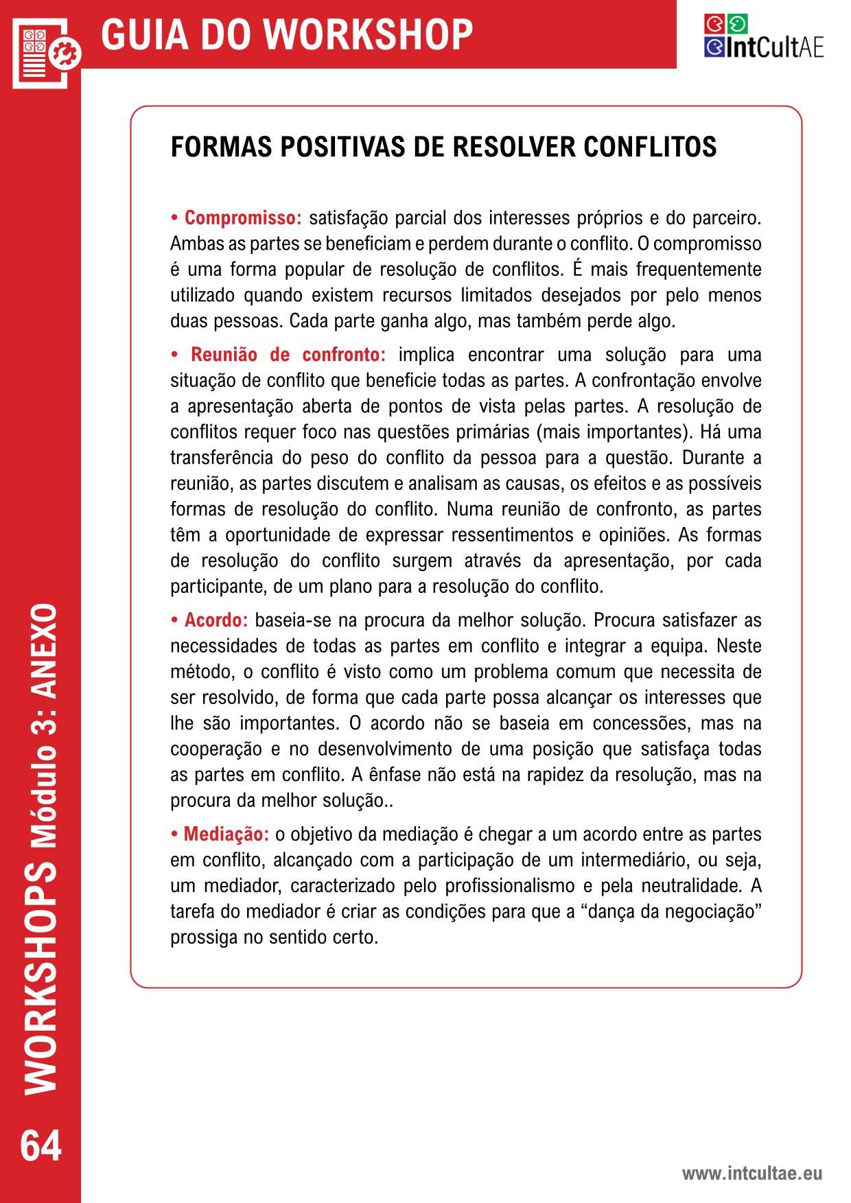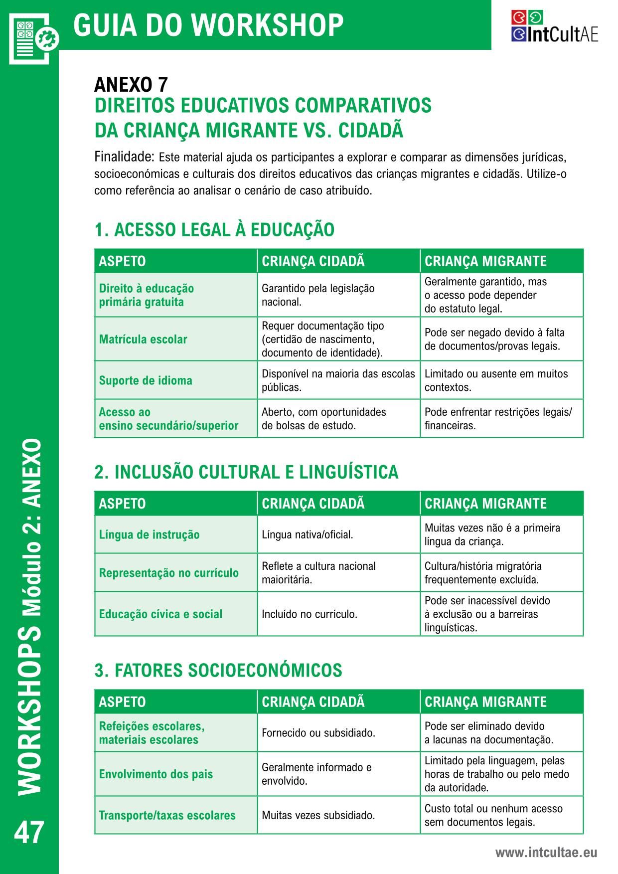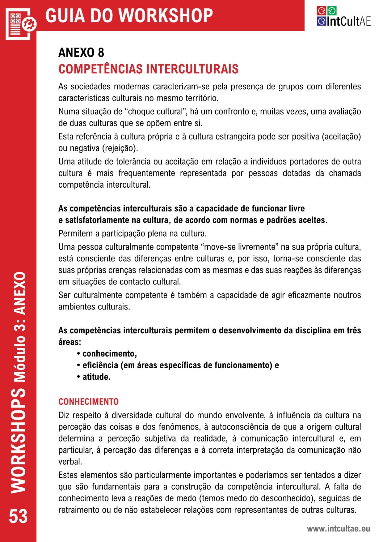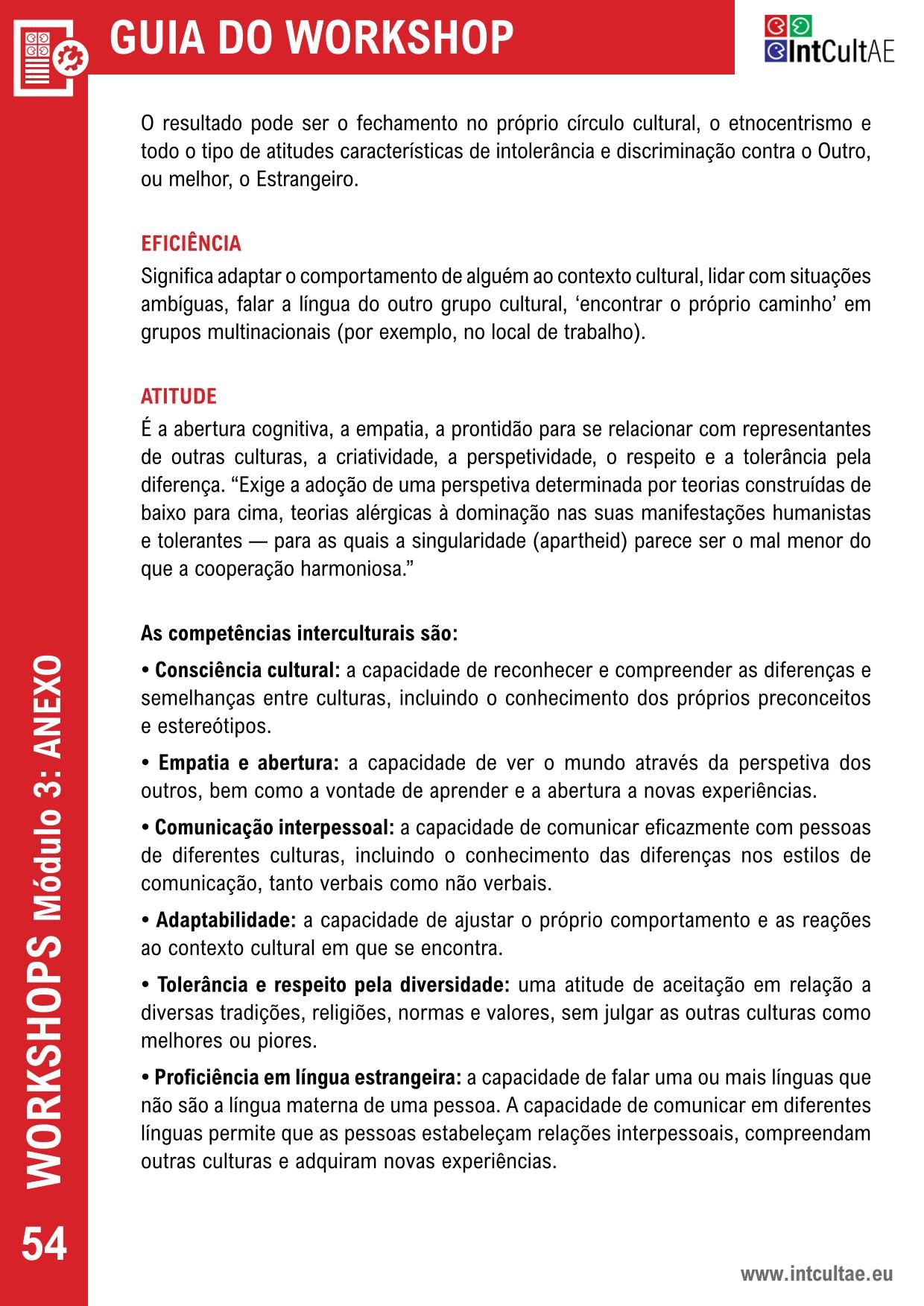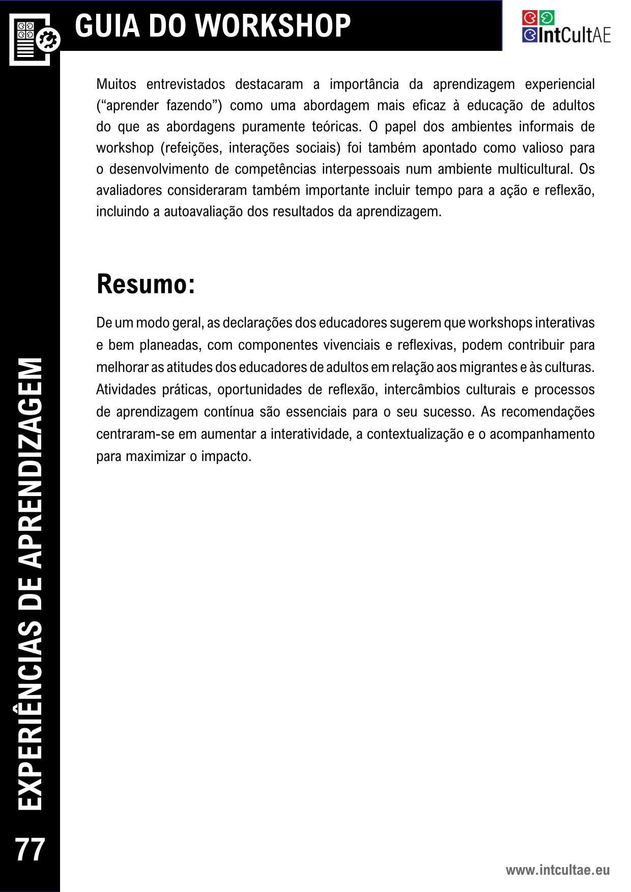 Destina-se a organizações e instituições de ensino interessadas em desenvolver os seus workshops sobre competências interculturais para educadores de adultos. Tem como objetivo aproveitar o potencial das atividades presenciais em grupo. Inclui orientações sobre implementação técnica e valoriza a oportunidade de praticar competências em cenários da vida real e discutir experiências em grupos focais.